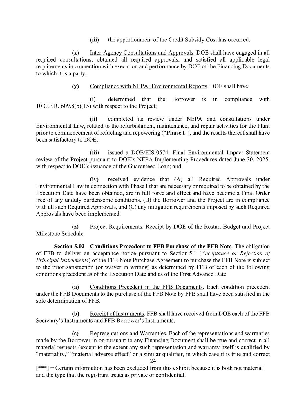 24 [***] = Certain information has been excluded from this exhibit because it is both not material and the type that the registrant treats as private or confidential. (iii) the apportionment of the Credit Subsidy Cost has occurred. (x) Inter-Agency Consultations and Approvals. DOE shall have engaged in all required consultations, obtained all required approvals, and satisfied all applicable legal requirements in connection with execution and performance by DOE of the Financing Documents to which it is a party. (y) Compliance with NEPA; Environmental Reports. DOE shall have: (i) determined that the Borrower is in compliance with 10 C.F.R. 609.8(b)(15) with respect to the Project; (ii) completed its review under NEPA and consultations under Environmental Law, related to the refurbishment, maintenance, and repair activities for the Plant prior to commencement of refueling and repowering (“Phase I”), and the results thereof shall have been satisfactory to DOE; (iii) issued a DOE/EIS-0574: Final Environmental Impact Statement review of the Project pursuant to DOE’s NEPA Implementing Procedures dated June 30, 2025, with respect to DOE’s issuance of the Guaranteed Loan; and (iv) received evidence that (A) all Required Approvals under Environmental Law in connection with Phase I that are necessary or required to be obtained by the Execution Date have been obtained, are in full force and effect and have become a Final Order free of any unduly burdensome conditions, (B) the Borrower and the Project are in compliance with all such Required Approvals, and (C) any mitigation requirements imposed by such Required Approvals have been implemented. (z) Project Requirements. Receipt by DOE of the Restart Budget and Project Milestone Schedule. Section 5.02 Conditions Precedent to FFB Purchase of the FFB Note. The obligation of FFB to deliver an acceptance notice pursuant to Section 5.1 (Acceptance or Rejection of Principal Instruments) of the FFB Note Purchase Agreement to purchase the FFB Note is subject to the prior satisfaction (or waiver in writing) as determined by FFB of each of the following conditions precedent as of the Execution Date and as of the First Advance Date: (a) Conditions Precedent in the FFB Documents. Each condition precedent under the FFB Documents to the purchase of the FFB Note by FFB shall have been satisfied in the sole determination of FFB. (b) Receipt of Instruments. FFB shall have received from DOE each of the FFB Secretary’s Instruments and FFB Borrower’s Instruments. (c) Representations and Warranties. Each of the representations and warranties made by the Borrower in or pursuant to any Financing Document shall be true and correct in all material respects (except to the extent any such representation and warranty itself is qualified by “materiality,” “material adverse effect” or a similar qualifier, in which case it is true and correct