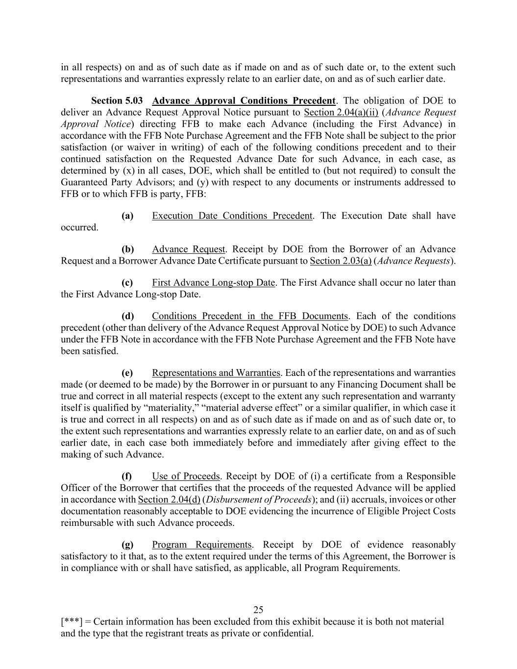 25 [***] = Certain information has been excluded from this exhibit because it is both not material and the type that the registrant treats as private or confidential. in all respects) on and as of such date as if made on and as of such date or, to the extent such representations and warranties expressly relate to an earlier date, on and as of such earlier date. Section 5.03 Advance Approval Conditions Precedent. The obligation of DOE to deliver an Advance Request Approval Notice pursuant to Section 2.04(a)(ii) (Advance Request Approval Notice) directing FFB to make each Advance (including the First Advance) in accordance with the FFB Note Purchase Agreement and the FFB Note shall be subject to the prior satisfaction (or waiver in writing) of each of the following conditions precedent and to their continued satisfaction on the Requested Advance Date for such Advance, in each case, as determined by (x) in all cases, DOE, which shall be entitled to (but not required) to consult the Guaranteed Party Advisors; and (y) with respect to any documents or instruments addressed to FFB or to which FFB is party, FFB: (a) Execution Date Conditions Precedent. The Execution Date shall have occurred. (b) Advance Request. Receipt by DOE from the Borrower of an Advance Request and a Borrower Advance Date Certificate pursuant to Section 2.03(a) (Advance Requests). (c) First Advance Long-stop Date. The First Advance shall occur no later than the First Advance Long-stop Date. (d) Conditions Precedent in the FFB Documents. Each of the conditions precedent (other than delivery of the Advance Request Approval Notice by DOE) to such Advance under the FFB Note in accordance with the FFB Note Purchase Agreement and the FFB Note have been satisfied. (e) Representations and Warranties. Each of the representations and warranties made (or deemed to be made) by the Borrower in or pursuant to any Financing Document shall be true and correct in all material respects (except to the extent any such representation and warranty itself is qualified by “materiality,” “material adverse effect” or a similar qualifier, in which case it is true and correct in all respects) on and as of such date as if made on and as of such date or, to the extent such representations and warranties expressly relate to an earlier date, on and as of such earlier date, in each case both immediately before and immediately after giving effect to the making of such Advance. (f) Use of Proceeds. Receipt by DOE of (i) a certificate from a Responsible Officer of the Borrower that certifies that the proceeds of the requested Advance will be applied in accordance with Section 2.04(d) (Disbursement of Proceeds); and (ii) accruals, invoices or other documentation reasonably acceptable to DOE evidencing the incurrence of Eligible Project Costs reimbursable with such Advance proceeds. (g) Program Requirements. Receipt by DOE of evidence reasonably satisfactory to it that, as to the extent required under the terms of this Agreement, the Borrower is in compliance with or shall have satisfied, as applicable, all Program Requirements.