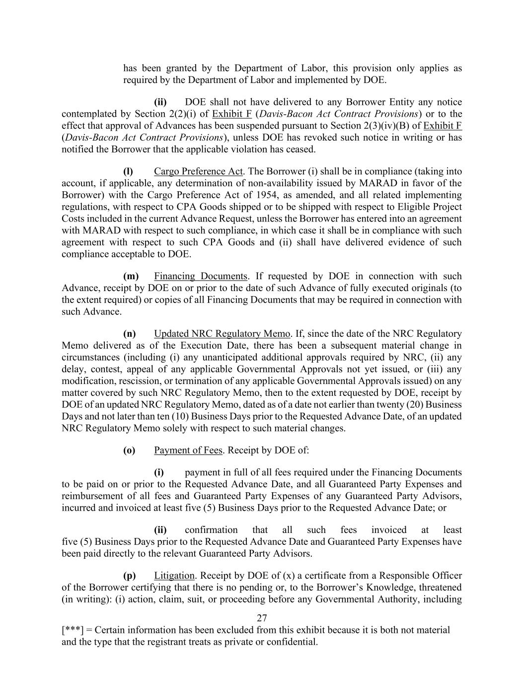 27 [***] = Certain information has been excluded from this exhibit because it is both not material and the type that the registrant treats as private or confidential. has been granted by the Department of Labor, this provision only applies as required by the Department of Labor and implemented by DOE. (ii) DOE shall not have delivered to any Borrower Entity any notice contemplated by Section 2(2)(i) of Exhibit F (Davis-Bacon Act Contract Provisions) or to the effect that approval of Advances has been suspended pursuant to Section 2(3)(iv)(B) of Exhibit F (Davis-Bacon Act Contract Provisions), unless DOE has revoked such notice in writing or has notified the Borrower that the applicable violation has ceased. (l) Cargo Preference Act. The Borrower (i) shall be in compliance (taking into account, if applicable, any determination of non-availability issued by MARAD in favor of the Borrower) with the Cargo Preference Act of 1954, as amended, and all related implementing regulations, with respect to CPA Goods shipped or to be shipped with respect to Eligible Project Costs included in the current Advance Request, unless the Borrower has entered into an agreement with MARAD with respect to such compliance, in which case it shall be in compliance with such agreement with respect to such CPA Goods and (ii) shall have delivered evidence of such compliance acceptable to DOE. (m) Financing Documents. If requested by DOE in connection with such Advance, receipt by DOE on or prior to the date of such Advance of fully executed originals (to the extent required) or copies of all Financing Documents that may be required in connection with such Advance. (n) Updated NRC Regulatory Memo. If, since the date of the NRC Regulatory Memo delivered as of the Execution Date, there has been a subsequent material change in circumstances (including (i) any unanticipated additional approvals required by NRC, (ii) any delay, contest, appeal of any applicable Governmental Approvals not yet issued, or (iii) any modification, rescission, or termination of any applicable Governmental Approvals issued) on any matter covered by such NRC Regulatory Memo, then to the extent requested by DOE, receipt by DOE of an updated NRC Regulatory Memo, dated as of a date not earlier than twenty (20) Business Days and not later than ten (10) Business Days prior to the Requested Advance Date, of an updated NRC Regulatory Memo solely with respect to such material changes. (o) Payment of Fees. Receipt by DOE of: (i) payment in full of all fees required under the Financing Documents to be paid on or prior to the Requested Advance Date, and all Guaranteed Party Expenses and reimbursement of all fees and Guaranteed Party Expenses of any Guaranteed Party Advisors, incurred and invoiced at least five (5) Business Days prior to the Requested Advance Date; or (ii) confirmation that all such fees invoiced at least five (5) Business Days prior to the Requested Advance Date and Guaranteed Party Expenses have been paid directly to the relevant Guaranteed Party Advisors. (p) Litigation. Receipt by DOE of (x) a certificate from a Responsible Officer of the Borrower certifying that there is no pending or, to the Borrower’s Knowledge, threatened (in writing): (i) action, claim, suit, or proceeding before any Governmental Authority, including