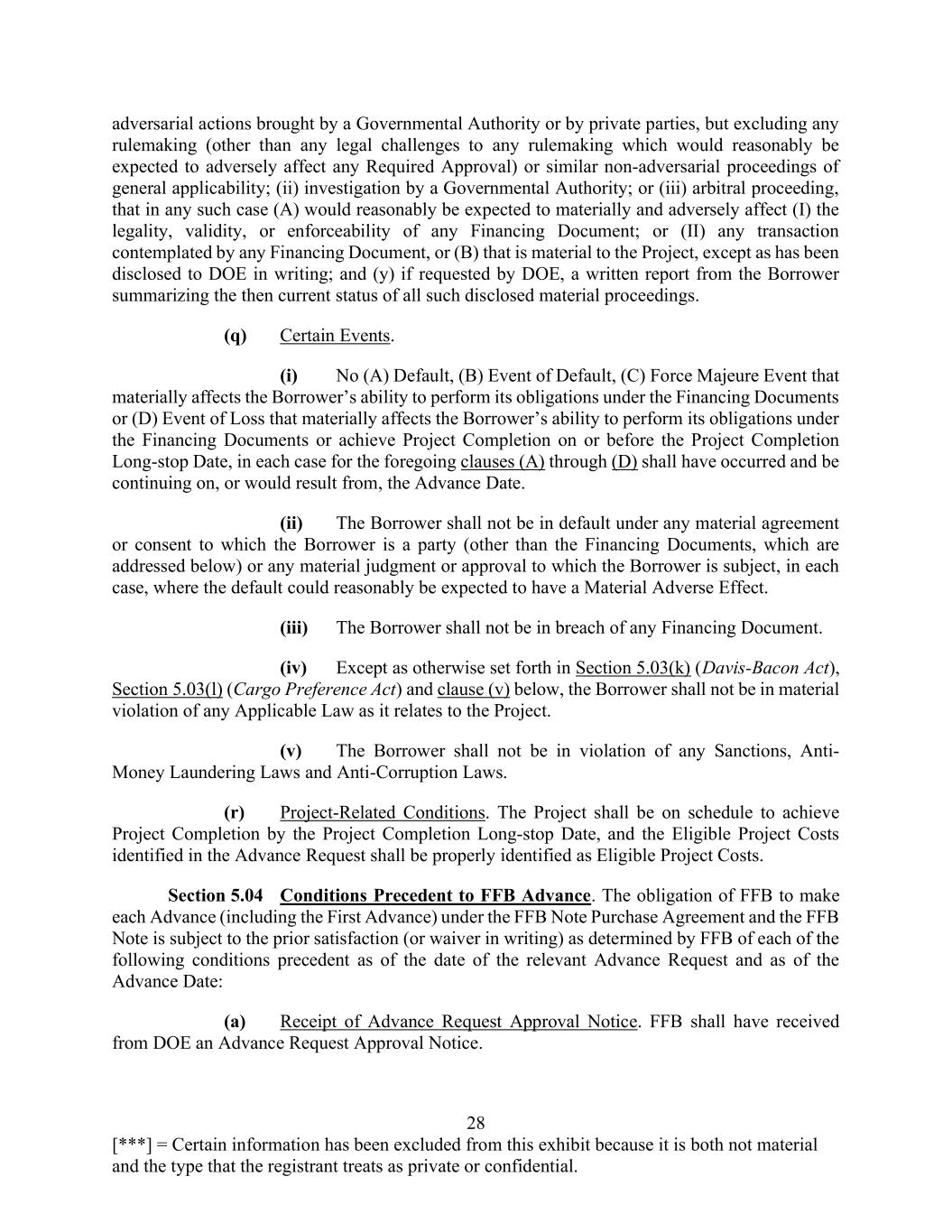 28 [***] = Certain information has been excluded from this exhibit because it is both not material and the type that the registrant treats as private or confidential. adversarial actions brought by a Governmental Authority or by private parties, but excluding any rulemaking (other than any legal challenges to any rulemaking which would reasonably be expected to adversely affect any Required Approval) or similar non-adversarial proceedings of general applicability; (ii) investigation by a Governmental Authority; or (iii) arbitral proceeding, that in any such case (A) would reasonably be expected to materially and adversely affect (I) the legality, validity, or enforceability of any Financing Document; or (II) any transaction contemplated by any Financing Document, or (B) that is material to the Project, except as has been disclosed to DOE in writing; and (y) if requested by DOE, a written report from the Borrower summarizing the then current status of all such disclosed material proceedings. (q) Certain Events. (i) No (A) Default, (B) Event of Default, (C) Force Majeure Event that materially affects the Borrower’s ability to perform its obligations under the Financing Documents or (D) Event of Loss that materially affects the Borrower’s ability to perform its obligations under the Financing Documents or achieve Project Completion on or before the Project Completion Long-stop Date, in each case for the foregoing clauses (A) through (D) shall have occurred and be continuing on, or would result from, the Advance Date. (ii) The Borrower shall not be in default under any material agreement or consent to which the Borrower is a party (other than the Financing Documents, which are addressed below) or any material judgment or approval to which the Borrower is subject, in each case, where the default could reasonably be expected to have a Material Adverse Effect. (iii) The Borrower shall not be in breach of any Financing Document. (iv) Except as otherwise set forth in Section 5.03(k) (Davis-Bacon Act), Section 5.03(l) (Cargo Preference Act) and clause (v) below, the Borrower shall not be in material violation of any Applicable Law as it relates to the Project. (v) The Borrower shall not be in violation of any Sanctions, Anti- Money Laundering Laws and Anti-Corruption Laws. (r) Project-Related Conditions. The Project shall be on schedule to achieve Project Completion by the Project Completion Long-stop Date, and the Eligible Project Costs identified in the Advance Request shall be properly identified as Eligible Project Costs. Section 5.04 Conditions Precedent to FFB Advance. The obligation of FFB to make each Advance (including the First Advance) under the FFB Note Purchase Agreement and the FFB Note is subject to the prior satisfaction (or waiver in writing) as determined by FFB of each of the following conditions precedent as of the date of the relevant Advance Request and as of the Advance Date: (a) Receipt of Advance Request Approval Notice. FFB shall have received from DOE an Advance Request Approval Notice.