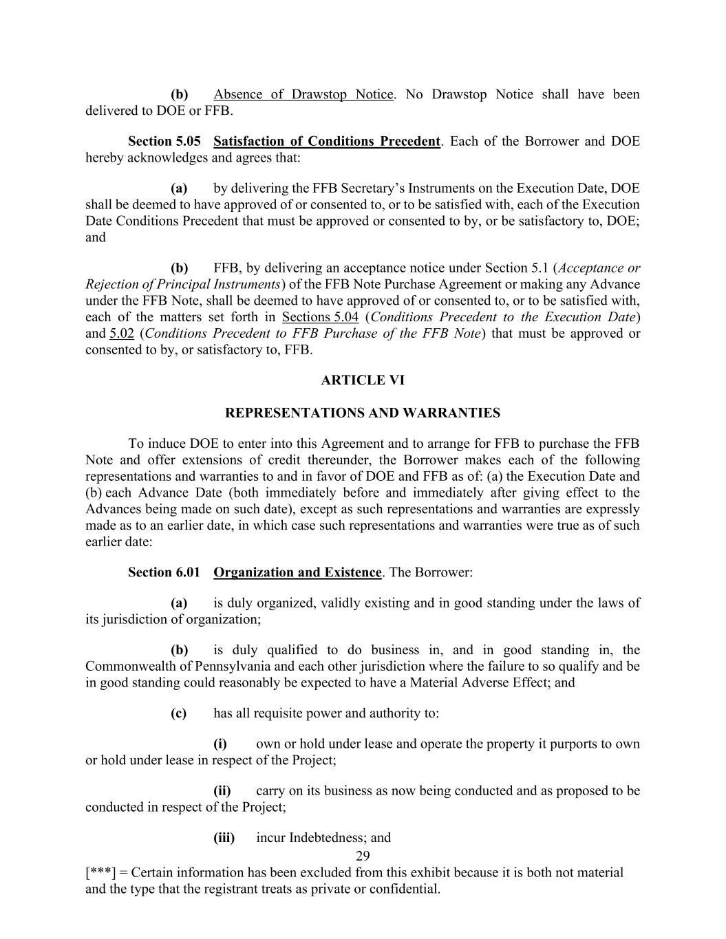29 [***] = Certain information has been excluded from this exhibit because it is both not material and the type that the registrant treats as private or confidential. (b) Absence of Drawstop Notice. No Drawstop Notice shall have been delivered to DOE or FFB. Section 5.05 Satisfaction of Conditions Precedent. Each of the Borrower and DOE hereby acknowledges and agrees that: (a) by delivering the FFB Secretary’s Instruments on the Execution Date, DOE shall be deemed to have approved of or consented to, or to be satisfied with, each of the Execution Date Conditions Precedent that must be approved or consented to by, or be satisfactory to, DOE; and (b) FFB, by delivering an acceptance notice under Section 5.1 (Acceptance or Rejection of Principal Instruments) of the FFB Note Purchase Agreement or making any Advance under the FFB Note, shall be deemed to have approved of or consented to, or to be satisfied with, each of the matters set forth in Sections 5.04 (Conditions Precedent to the Execution Date) and 5.02 (Conditions Precedent to FFB Purchase of the FFB Note) that must be approved or consented to by, or satisfactory to, FFB. ARTICLE VI REPRESENTATIONS AND WARRANTIES To induce DOE to enter into this Agreement and to arrange for FFB to purchase the FFB Note and offer extensions of credit thereunder, the Borrower makes each of the following representations and warranties to and in favor of DOE and FFB as of: (a) the Execution Date and (b) each Advance Date (both immediately before and immediately after giving effect to the Advances being made on such date), except as such representations and warranties are expressly made as to an earlier date, in which case such representations and warranties were true as of such earlier date: Section 6.01 Organization and Existence. The Borrower: (a) is duly organized, validly existing and in good standing under the laws of its jurisdiction of organization; (b) is duly qualified to do business in, and in good standing in, the Commonwealth of Pennsylvania and each other jurisdiction where the failure to so qualify and be in good standing could reasonably be expected to have a Material Adverse Effect; and (c) has all requisite power and authority to: (i) own or hold under lease and operate the property it purports to own or hold under lease in respect of the Project; (ii) carry on its business as now being conducted and as proposed to be conducted in respect of the Project; (iii) incur Indebtedness; and