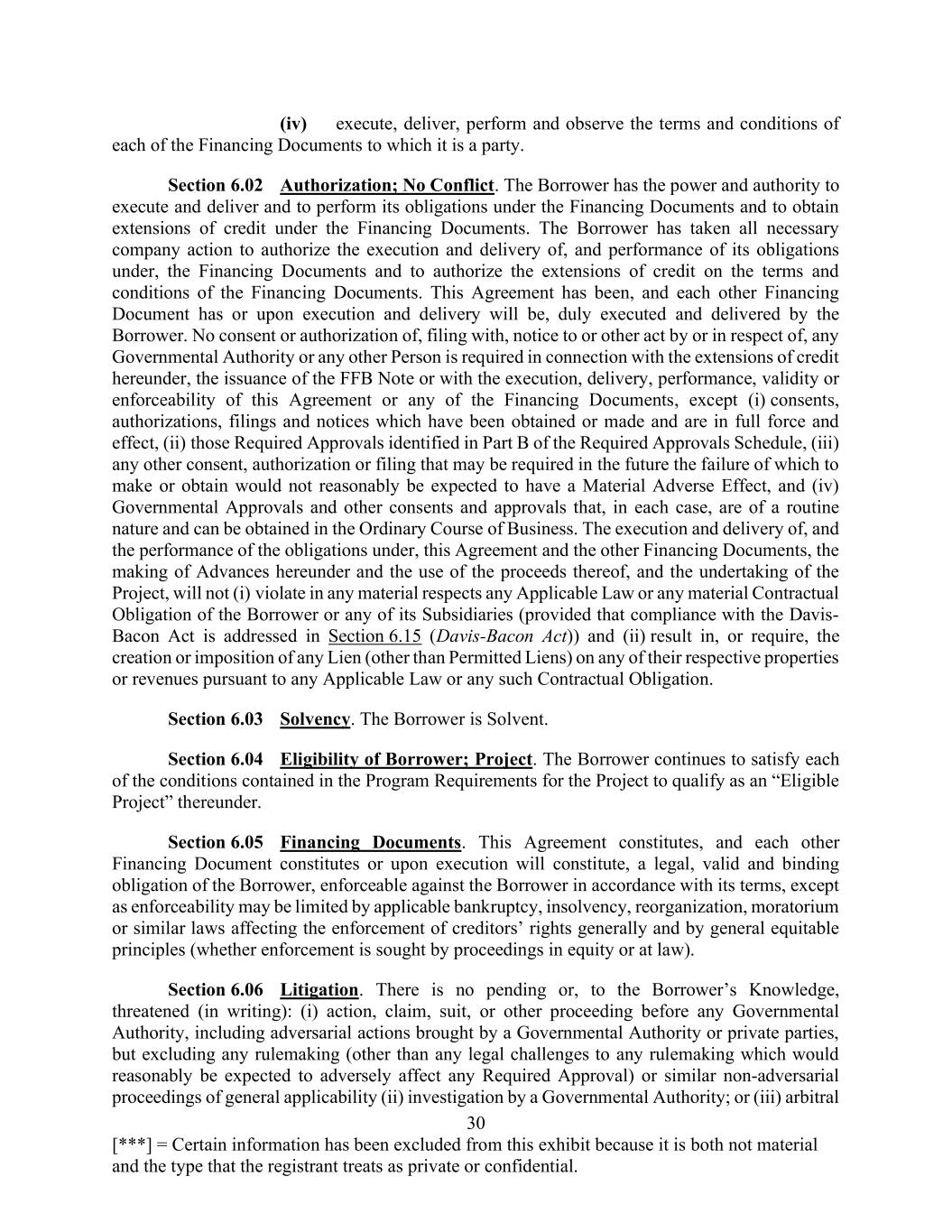 30 [***] = Certain information has been excluded from this exhibit because it is both not material and the type that the registrant treats as private or confidential. (iv) execute, deliver, perform and observe the terms and conditions of each of the Financing Documents to which it is a party. Section 6.02 Authorization; No Conflict. The Borrower has the power and authority to execute and deliver and to perform its obligations under the Financing Documents and to obtain extensions of credit under the Financing Documents. The Borrower has taken all necessary company action to authorize the execution and delivery of, and performance of its obligations under, the Financing Documents and to authorize the extensions of credit on the terms and conditions of the Financing Documents. This Agreement has been, and each other Financing Document has or upon execution and delivery will be, duly executed and delivered by the Borrower. No consent or authorization of, filing with, notice to or other act by or in respect of, any Governmental Authority or any other Person is required in connection with the extensions of credit hereunder, the issuance of the FFB Note or with the execution, delivery, performance, validity or enforceability of this Agreement or any of the Financing Documents, except (i) consents, authorizations, filings and notices which have been obtained or made and are in full force and effect, (ii) those Required Approvals identified in Part B of the Required Approvals Schedule, (iii) any other consent, authorization or filing that may be required in the future the failure of which to make or obtain would not reasonably be expected to have a Material Adverse Effect, and (iv) Governmental Approvals and other consents and approvals that, in each case, are of a routine nature and can be obtained in the Ordinary Course of Business. The execution and delivery of, and the performance of the obligations under, this Agreement and the other Financing Documents, the making of Advances hereunder and the use of the proceeds thereof, and the undertaking of the Project, will not (i) violate in any material respects any Applicable Law or any material Contractual Obligation of the Borrower or any of its Subsidiaries (provided that compliance with the Davis- Bacon Act is addressed in Section 6.15 (Davis-Bacon Act)) and (ii) result in, or require, the creation or imposition of any Lien (other than Permitted Liens) on any of their respective properties or revenues pursuant to any Applicable Law or any such Contractual Obligation. Section 6.03 Solvency. The Borrower is Solvent. Section 6.04 Eligibility of Borrower; Project. The Borrower continues to satisfy each of the conditions contained in the Program Requirements for the Project to qualify as an “Eligible Project” thereunder. Section 6.05 Financing Documents. This Agreement constitutes, and each other Financing Document constitutes or upon execution will constitute, a legal, valid and binding obligation of the Borrower, enforceable against the Borrower in accordance with its terms, except as enforceability may be limited by applicable bankruptcy, insolvency, reorganization, moratorium or similar laws affecting the enforcement of creditors’ rights generally and by general equitable principles (whether enforcement is sought by proceedings in equity or at law). Section 6.06 Litigation. There is no pending or, to the Borrower’s Knowledge, threatened (in writing): (i) action, claim, suit, or other proceeding before any Governmental Authority, including adversarial actions brought by a Governmental Authority or private parties, but excluding any rulemaking (other than any legal challenges to any rulemaking which would reasonably be expected to adversely affect any Required Approval) or similar non-adversarial proceedings of general applicability (ii) investigation by a Governmental Authority; or (iii) arbitral