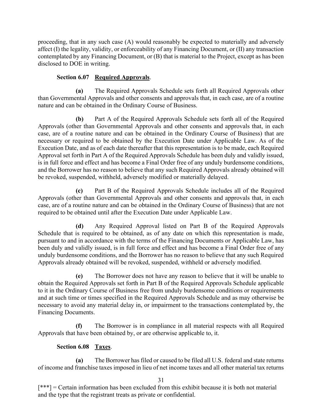 31 [***] = Certain information has been excluded from this exhibit because it is both not material and the type that the registrant treats as private or confidential. proceeding, that in any such case (A) would reasonably be expected to materially and adversely affect (I) the legality, validity, or enforceability of any Financing Document, or (II) any transaction contemplated by any Financing Document, or (B) that is material to the Project, except as has been disclosed to DOE in writing. Section 6.07 Required Approvals. (a) The Required Approvals Schedule sets forth all Required Approvals other than Governmental Approvals and other consents and approvals that, in each case, are of a routine nature and can be obtained in the Ordinary Course of Business. (b) Part A of the Required Approvals Schedule sets forth all of the Required Approvals (other than Governmental Approvals and other consents and approvals that, in each case, are of a routine nature and can be obtained in the Ordinary Course of Business) that are necessary or required to be obtained by the Execution Date under Applicable Law. As of the Execution Date, and as of each date thereafter that this representation is to be made, each Required Approval set forth in Part A of the Required Approvals Schedule has been duly and validly issued, is in full force and effect and has become a Final Order free of any unduly burdensome conditions, and the Borrower has no reason to believe that any such Required Approvals already obtained will be revoked, suspended, withheld, adversely modified or materially delayed. (c) Part B of the Required Approvals Schedule includes all of the Required Approvals (other than Governmental Approvals and other consents and approvals that, in each case, are of a routine nature and can be obtained in the Ordinary Course of Business) that are not required to be obtained until after the Execution Date under Applicable Law. (d) Any Required Approval listed on Part B of the Required Approvals Schedule that is required to be obtained, as of any date on which this representation is made, pursuant to and in accordance with the terms of the Financing Documents or Applicable Law, has been duly and validly issued, is in full force and effect and has become a Final Order free of any unduly burdensome conditions, and the Borrower has no reason to believe that any such Required Approvals already obtained will be revoked, suspended, withheld or adversely modified. (e) The Borrower does not have any reason to believe that it will be unable to obtain the Required Approvals set forth in Part B of the Required Approvals Schedule applicable to it in the Ordinary Course of Business free from unduly burdensome conditions or requirements and at such time or times specified in the Required Approvals Schedule and as may otherwise be necessary to avoid any material delay in, or impairment to the transactions contemplated by, the Financing Documents. (f) The Borrower is in compliance in all material respects with all Required Approvals that have been obtained by, or are otherwise applicable to, it. Section 6.08 Taxes. (a) The Borrower has filed or caused to be filed all U.S. federal and state returns of income and franchise taxes imposed in lieu of net income taxes and all other material tax returns