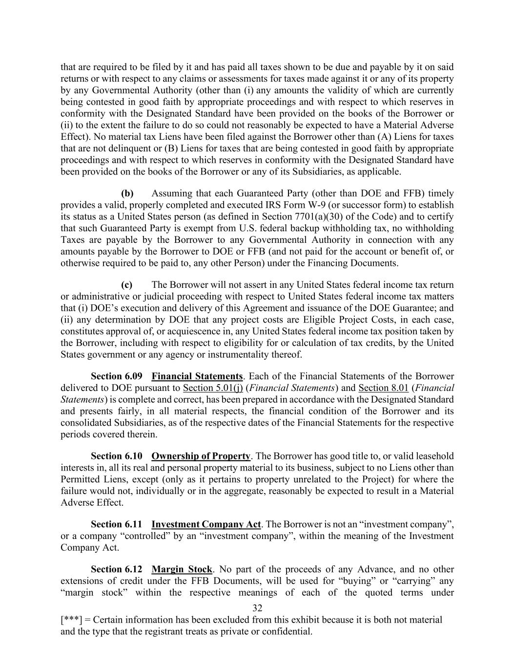 32 [***] = Certain information has been excluded from this exhibit because it is both not material and the type that the registrant treats as private or confidential. that are required to be filed by it and has paid all taxes shown to be due and payable by it on said returns or with respect to any claims or assessments for taxes made against it or any of its property by any Governmental Authority (other than (i) any amounts the validity of which are currently being contested in good faith by appropriate proceedings and with respect to which reserves in conformity with the Designated Standard have been provided on the books of the Borrower or (ii) to the extent the failure to do so could not reasonably be expected to have a Material Adverse Effect). No material tax Liens have been filed against the Borrower other than (A) Liens for taxes that are not delinquent or (B) Liens for taxes that are being contested in good faith by appropriate proceedings and with respect to which reserves in conformity with the Designated Standard have been provided on the books of the Borrower or any of its Subsidiaries, as applicable. (b) Assuming that each Guaranteed Party (other than DOE and FFB) timely provides a valid, properly completed and executed IRS Form W-9 (or successor form) to establish its status as a United States person (as defined in Section 7701(a)(30) of the Code) and to certify that such Guaranteed Party is exempt from U.S. federal backup withholding tax, no withholding Taxes are payable by the Borrower to any Governmental Authority in connection with any amounts payable by the Borrower to DOE or FFB (and not paid for the account or benefit of, or otherwise required to be paid to, any other Person) under the Financing Documents. (c) The Borrower will not assert in any United States federal income tax return or administrative or judicial proceeding with respect to United States federal income tax matters that (i) DOE’s execution and delivery of this Agreement and issuance of the DOE Guarantee; and (ii) any determination by DOE that any project costs are Eligible Project Costs, in each case, constitutes approval of, or acquiescence in, any United States federal income tax position taken by the Borrower, including with respect to eligibility for or calculation of tax credits, by the United States government or any agency or instrumentality thereof. Section 6.09 Financial Statements. Each of the Financial Statements of the Borrower delivered to DOE pursuant to Section 5.01(j) (Financial Statements) and Section 8.01 (Financial Statements) is complete and correct, has been prepared in accordance with the Designated Standard and presents fairly, in all material respects, the financial condition of the Borrower and its consolidated Subsidiaries, as of the respective dates of the Financial Statements for the respective periods covered therein. Section 6.10 Ownership of Property. The Borrower has good title to, or valid leasehold interests in, all its real and personal property material to its business, subject to no Liens other than Permitted Liens, except (only as it pertains to property unrelated to the Project) for where the failure would not, individually or in the aggregate, reasonably be expected to result in a Material Adverse Effect. Section 6.11 Investment Company Act. The Borrower is not an “investment company”, or a company “controlled” by an “investment company”, within the meaning of the Investment Company Act. Section 6.12 Margin Stock. No part of the proceeds of any Advance, and no other extensions of credit under the FFB Documents, will be used for “buying” or “carrying” any “margin stock” within the respective meanings of each of the quoted terms under