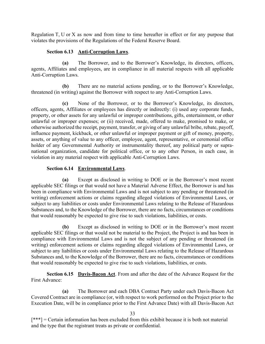 33 [***] = Certain information has been excluded from this exhibit because it is both not material and the type that the registrant treats as private or confidential. Regulation T, U or X as now and from time to time hereafter in effect or for any purpose that violates the provisions of the Regulations of the Federal Reserve Board. Section 6.13 Anti-Corruption Laws. (a) The Borrower, and to the Borrower’s Knowledge, its directors, officers, agents, Affiliates and employees, are in compliance in all material respects with all applicable Anti-Corruption Laws. (b) There are no material actions pending, or to the Borrower’s Knowledge, threatened (in writing) against the Borrower with respect to any Anti-Corruption Laws. (c) None of the Borrower, or to the Borrower’s Knowledge, its directors, officers, agents, Affiliates or employees has directly or indirectly: (i) used any corporate funds, property, or other assets for any unlawful or improper contributions, gifts, entertainment, or other unlawful or improper expenses; or (ii) received, made, offered to make, promised to make, or otherwise authorized the receipt, payment, transfer, or giving of any unlawful bribe, rebate, payoff, influence payment, kickback, or other unlawful or improper payment or gift of money, property, assets, or anything of value to any officer, employee, agent, representative, or ceremonial office holder of any Governmental Authority or instrumentality thereof, any political party or supra- national organization, candidate for political office, or to any other Person, in each case, in violation in any material respect with applicable Anti-Corruption Laws. Section 6.14 Environmental Laws. (a) Except as disclosed in writing to DOE or in the Borrower’s most recent applicable SEC filings or that would not have a Material Adverse Effect, the Borrower is and has been in compliance with Environmental Laws and is not subject to any pending or threatened (in writing) enforcement actions or claims regarding alleged violations of Environmental Laws, or subject to any liabilities or costs under Environmental Laws relating to the Release of Hazardous Substances and, to the Knowledge of the Borrower, there are no facts, circumstances or conditions that would reasonably be expected to give rise to such violations, liabilities, or costs. (b) Except as disclosed in writing to DOE or in the Borrower’s most recent applicable SEC filings or that would not be material to the Project, the Project is and has been in compliance with Environmental Laws and is not the subject of any pending or threatened (in writing) enforcement actions or claims regarding alleged violations of Environmental Laws, or subject to any liabilities or costs under Environmental Laws relating to the Release of Hazardous Substances and, to the Knowledge of the Borrower, there are no facts, circumstances or conditions that would reasonably be expected to give rise to such violations, liabilities, or costs. Section 6.15 Davis-Bacon Act. From and after the date of the Advance Request for the First Advance: (a) The Borrower and each DBA Contract Party under each Davis-Bacon Act Covered Contract are in compliance (or, with respect to work performed on the Project prior to the Execution Date, will be in compliance prior to the First Advance Date) with all Davis-Bacon Act