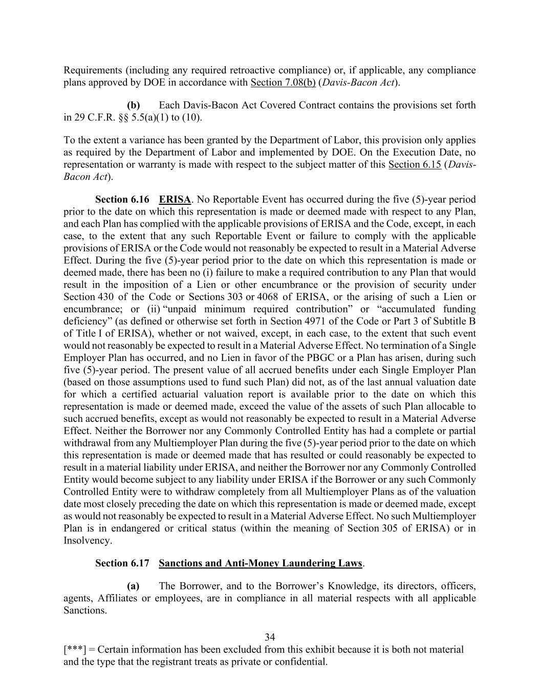 34 [***] = Certain information has been excluded from this exhibit because it is both not material and the type that the registrant treats as private or confidential. Requirements (including any required retroactive compliance) or, if applicable, any compliance plans approved by DOE in accordance with Section 7.08(b) (Davis-Bacon Act). (b) Each Davis-Bacon Act Covered Contract contains the provisions set forth in 29 C.F.R. §§ 5.5(a)(1) to (10). To the extent a variance has been granted by the Department of Labor, this provision only applies as required by the Department of Labor and implemented by DOE. On the Execution Date, no representation or warranty is made with respect to the subject matter of this Section 6.15 (Davis- Bacon Act). Section 6.16 ERISA. No Reportable Event has occurred during the five (5)-year period prior to the date on which this representation is made or deemed made with respect to any Plan, and each Plan has complied with the applicable provisions of ERISA and the Code, except, in each case, to the extent that any such Reportable Event or failure to comply with the applicable provisions of ERISA or the Code would not reasonably be expected to result in a Material Adverse Effect. During the five (5)-year period prior to the date on which this representation is made or deemed made, there has been no (i) failure to make a required contribution to any Plan that would result in the imposition of a Lien or other encumbrance or the provision of security under Section 430 of the Code or Sections 303 or 4068 of ERISA, or the arising of such a Lien or encumbrance; or (ii) “unpaid minimum required contribution” or “accumulated funding deficiency” (as defined or otherwise set forth in Section 4971 of the Code or Part 3 of Subtitle B of Title I of ERISA), whether or not waived, except, in each case, to the extent that such event would not reasonably be expected to result in a Material Adverse Effect. No termination of a Single Employer Plan has occurred, and no Lien in favor of the PBGC or a Plan has arisen, during such five (5)-year period. The present value of all accrued benefits under each Single Employer Plan (based on those assumptions used to fund such Plan) did not, as of the last annual valuation date for which a certified actuarial valuation report is available prior to the date on which this representation is made or deemed made, exceed the value of the assets of such Plan allocable to such accrued benefits, except as would not reasonably be expected to result in a Material Adverse Effect. Neither the Borrower nor any Commonly Controlled Entity has had a complete or partial withdrawal from any Multiemployer Plan during the five (5)-year period prior to the date on which this representation is made or deemed made that has resulted or could reasonably be expected to result in a material liability under ERISA, and neither the Borrower nor any Commonly Controlled Entity would become subject to any liability under ERISA if the Borrower or any such Commonly Controlled Entity were to withdraw completely from all Multiemployer Plans as of the valuation date most closely preceding the date on which this representation is made or deemed made, except as would not reasonably be expected to result in a Material Adverse Effect. No such Multiemployer Plan is in endangered or critical status (within the meaning of Section 305 of ERISA) or in Insolvency. Section 6.17 Sanctions and Anti-Money Laundering Laws. (a) The Borrower, and to the Borrower’s Knowledge, its directors, officers, agents, Affiliates or employees, are in compliance in all material respects with all applicable Sanctions.