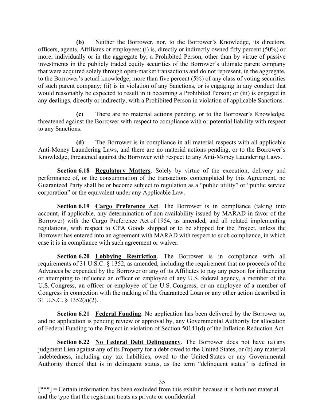 35 [***] = Certain information has been excluded from this exhibit because it is both not material and the type that the registrant treats as private or confidential. (b) Neither the Borrower, nor, to the Borrower’s Knowledge, its directors, officers, agents, Affiliates or employees: (i) is, directly or indirectly owned fifty percent (50%) or more, individually or in the aggregate by, a Prohibited Person, other than by virtue of passive investments in the publicly traded equity securities of the Borrower’s ultimate parent company that were acquired solely through open-market transactions and do not represent, in the aggregate, to the Borrower’s actual knowledge, more than five percent (5%) of any class of voting securities of such parent company; (ii) is in violation of any Sanctions, or is engaging in any conduct that would reasonably be expected to result in it becoming a Prohibited Person; or (iii) is engaged in any dealings, directly or indirectly, with a Prohibited Person in violation of applicable Sanctions. (c) There are no material actions pending, or to the Borrower’s Knowledge, threatened against the Borrower with respect to compliance with or potential liability with respect to any Sanctions. (d) The Borrower is in compliance in all material respects with all applicable Anti-Money Laundering Laws, and there are no material actions pending, or to the Borrower’s Knowledge, threatened against the Borrower with respect to any Anti-Money Laundering Laws. Section 6.18 Regulatory Matters. Solely by virtue of the execution, delivery and performance of, or the consummation of the transactions contemplated by this Agreement, no Guaranteed Party shall be or become subject to regulation as a “public utility” or “public service corporation” or the equivalent under any Applicable Law. Section 6.19 Cargo Preference Act. The Borrower is in compliance (taking into account, if applicable, any determination of non-availability issued by MARAD in favor of the Borrower) with the Cargo Preference Act of 1954, as amended, and all related implementing regulations, with respect to CPA Goods shipped or to be shipped for the Project, unless the Borrower has entered into an agreement with MARAD with respect to such compliance, in which case it is in compliance with such agreement or waiver. Section 6.20 Lobbying Restriction. The Borrower is in compliance with all requirements of 31 U.S.C. § 1352, as amended, including the requirement that no proceeds of the Advances be expended by the Borrower or any of its Affiliates to pay any person for influencing or attempting to influence an officer or employee of any U.S. federal agency, a member of the U.S. Congress, an officer or employee of the U.S. Congress, or an employee of a member of Congress in connection with the making of the Guaranteed Loan or any other action described in 31 U.S.C. § 1352(a)(2). Section 6.21 Federal Funding. No application has been delivered by the Borrower to, and no application is pending review or approval by, any Governmental Authority for allocation of Federal Funding to the Project in violation of Section 50141(d) of the Inflation Reduction Act. Section 6.22 No Federal Debt Delinquency. The Borrower does not have (a) any judgment Lien against any of its Property for a debt owed to the United States, or (b) any material indebtedness, including any tax liabilities, owed to the United States or any Governmental Authority thereof that is in delinquent status, as the term “delinquent status” is defined in