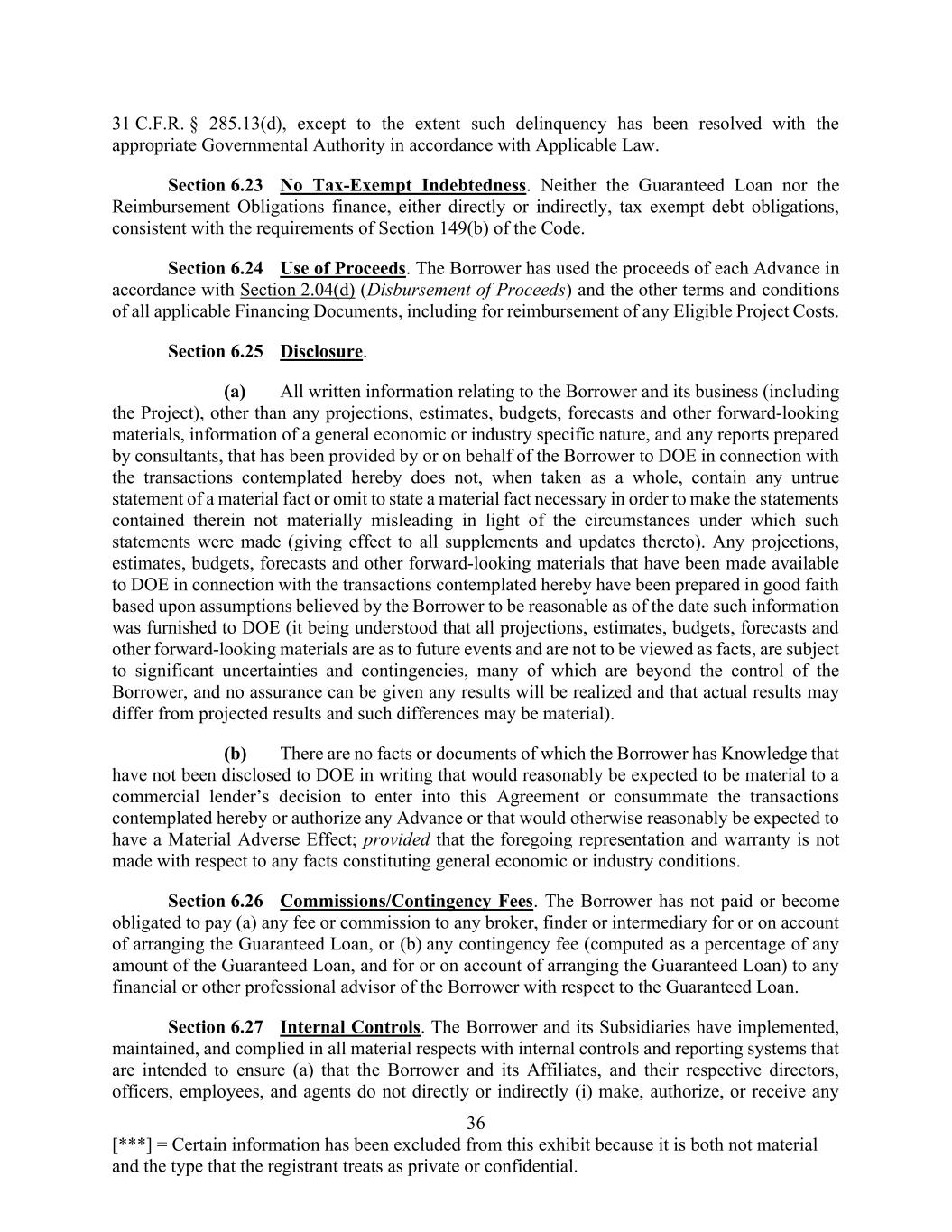 36 [***] = Certain information has been excluded from this exhibit because it is both not material and the type that the registrant treats as private or confidential. 31 C.F.R. § 285.13(d), except to the extent such delinquency has been resolved with the appropriate Governmental Authority in accordance with Applicable Law. Section 6.23 No Tax-Exempt Indebtedness. Neither the Guaranteed Loan nor the Reimbursement Obligations finance, either directly or indirectly, tax exempt debt obligations, consistent with the requirements of Section 149(b) of the Code. Section 6.24 Use of Proceeds. The Borrower has used the proceeds of each Advance in accordance with Section 2.04(d) (Disbursement of Proceeds) and the other terms and conditions of all applicable Financing Documents, including for reimbursement of any Eligible Project Costs. Section 6.25 Disclosure. (a) All written information relating to the Borrower and its business (including the Project), other than any projections, estimates, budgets, forecasts and other forward-looking materials, information of a general economic or industry specific nature, and any reports prepared by consultants, that has been provided by or on behalf of the Borrower to DOE in connection with the transactions contemplated hereby does not, when taken as a whole, contain any untrue statement of a material fact or omit to state a material fact necessary in order to make the statements contained therein not materially misleading in light of the circumstances under which such statements were made (giving effect to all supplements and updates thereto). Any projections, estimates, budgets, forecasts and other forward-looking materials that have been made available to DOE in connection with the transactions contemplated hereby have been prepared in good faith based upon assumptions believed by the Borrower to be reasonable as of the date such information was furnished to DOE (it being understood that all projections, estimates, budgets, forecasts and other forward-looking materials are as to future events and are not to be viewed as facts, are subject to significant uncertainties and contingencies, many of which are beyond the control of the Borrower, and no assurance can be given any results will be realized and that actual results may differ from projected results and such differences may be material). (b) There are no facts or documents of which the Borrower has Knowledge that have not been disclosed to DOE in writing that would reasonably be expected to be material to a commercial lender’s decision to enter into this Agreement or consummate the transactions contemplated hereby or authorize any Advance or that would otherwise reasonably be expected to have a Material Adverse Effect; provided that the foregoing representation and warranty is not made with respect to any facts constituting general economic or industry conditions. Section 6.26 Commissions/Contingency Fees. The Borrower has not paid or become obligated to pay (a) any fee or commission to any broker, finder or intermediary for or on account of arranging the Guaranteed Loan, or (b) any contingency fee (computed as a percentage of any amount of the Guaranteed Loan, and for or on account of arranging the Guaranteed Loan) to any financial or other professional advisor of the Borrower with respect to the Guaranteed Loan. Section 6.27 Internal Controls. The Borrower and its Subsidiaries have implemented, maintained, and complied in all material respects with internal controls and reporting systems that are intended to ensure (a) that the Borrower and its Affiliates, and their respective directors, officers, employees, and agents do not directly or indirectly (i) make, authorize, or receive any