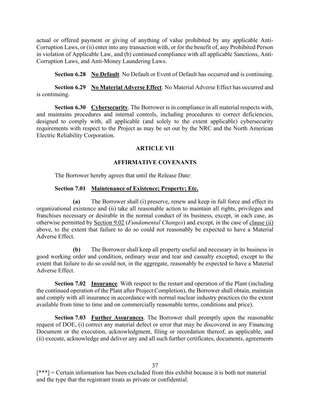 37 [***] = Certain information has been excluded from this exhibit because it is both not material and the type that the registrant treats as private or confidential. actual or offered payment or giving of anything of value prohibited by any applicable Anti- Corruption Laws, or (ii) enter into any transaction with, or for the benefit of, any Prohibited Person in violation of Applicable Law, and (b) continued compliance with all applicable Sanctions, Anti- Corruption Laws, and Anti-Money Laundering Laws. Section 6.28 No Default. No Default or Event of Default has occurred and is continuing. Section 6.29 No Material Adverse Effect. No Material Adverse Effect has occurred and is continuing. Section 6.30 Cybersecurity. The Borrower is in compliance in all material respects with, and maintains procedures and internal controls, including procedures to correct deficiencies, designed to comply with, all applicable (and solely to the extent applicable) cybersecurity requirements with respect to the Project as may be set out by the NRC and the North American Electric Reliability Corporation. ARTICLE VII AFFIRMATIVE COVENANTS The Borrower hereby agrees that until the Release Date: Section 7.01 Maintenance of Existence; Property; Etc. (a) The Borrower shall (i) preserve, renew and keep in full force and effect its organizational existence and (ii) take all reasonable action to maintain all rights, privileges and franchises necessary or desirable in the normal conduct of its business, except, in each case, as otherwise permitted by Section 9.02 (Fundamental Changes) and except, in the case of clause (ii) above, to the extent that failure to do so could not reasonably be expected to have a Material Adverse Effect. (b) The Borrower shall keep all property useful and necessary in its business in good working order and condition, ordinary wear and tear and casualty excepted, except to the extent that failure to do so could not, in the aggregate, reasonably be expected to have a Material Adverse Effect. Section 7.02 Insurance. With respect to the restart and operation of the Plant (including the continued operation of the Plant after Project Completion), the Borrower shall obtain, maintain and comply with all insurance in accordance with normal nuclear industry practices (to the extent available from time to time and on commercially reasonable terms, conditions and price). Section 7.03 Further Assurances. The Borrower shall promptly upon the reasonable request of DOE, (i) correct any material defect or error that may be discovered in any Financing Document or the execution, acknowledgment, filing or recordation thereof, as applicable, and (ii) execute, acknowledge and deliver any and all such further certificates, documents, agreements