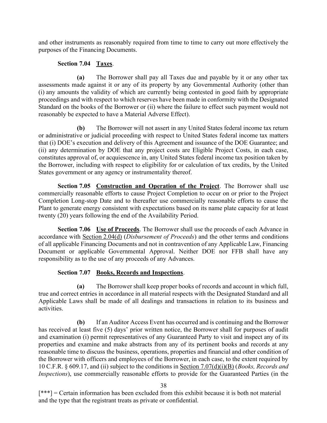 38 [***] = Certain information has been excluded from this exhibit because it is both not material and the type that the registrant treats as private or confidential. and other instruments as reasonably required from time to time to carry out more effectively the purposes of the Financing Documents. Section 7.04 Taxes. (a) The Borrower shall pay all Taxes due and payable by it or any other tax assessments made against it or any of its property by any Governmental Authority (other than (i) any amounts the validity of which are currently being contested in good faith by appropriate proceedings and with respect to which reserves have been made in conformity with the Designated Standard on the books of the Borrower or (ii) where the failure to effect such payment would not reasonably be expected to have a Material Adverse Effect). (b) The Borrower will not assert in any United States federal income tax return or administrative or judicial proceeding with respect to United States federal income tax matters that (i) DOE’s execution and delivery of this Agreement and issuance of the DOE Guarantee; and (ii) any determination by DOE that any project costs are Eligible Project Costs, in each case, constitutes approval of, or acquiescence in, any United States federal income tax position taken by the Borrower, including with respect to eligibility for or calculation of tax credits, by the United States government or any agency or instrumentality thereof. Section 7.05 Construction and Operation of the Project. The Borrower shall use commercially reasonable efforts to cause Project Completion to occur on or prior to the Project Completion Long-stop Date and to thereafter use commercially reasonable efforts to cause the Plant to generate energy consistent with expectations based on its name plate capacity for at least twenty (20) years following the end of the Availability Period. Section 7.06 Use of Proceeds. The Borrower shall use the proceeds of each Advance in accordance with Section 2.04(d) (Disbursement of Proceeds) and the other terms and conditions of all applicable Financing Documents and not in contravention of any Applicable Law, Financing Document or applicable Governmental Approval. Neither DOE nor FFB shall have any responsibility as to the use of any proceeds of any Advances. Section 7.07 Books, Records and Inspections. (a) The Borrower shall keep proper books of records and account in which full, true and correct entries in accordance in all material respects with the Designated Standard and all Applicable Laws shall be made of all dealings and transactions in relation to its business and activities. (b) If an Auditor Access Event has occurred and is continuing and the Borrower has received at least five (5) days’ prior written notice, the Borrower shall for purposes of audit and examination (i) permit representatives of any Guaranteed Party to visit and inspect any of its properties and examine and make abstracts from any of its pertinent books and records at any reasonable time to discuss the business, operations, properties and financial and other condition of the Borrower with officers and employees of the Borrower, in each case, to the extent required by 10 C.F.R. § 609.17, and (ii) subject to the conditions in Section 7.07(d)(i)(B) (Books, Records and Inspections), use commercially reasonable efforts to provide for the Guaranteed Parties (in the