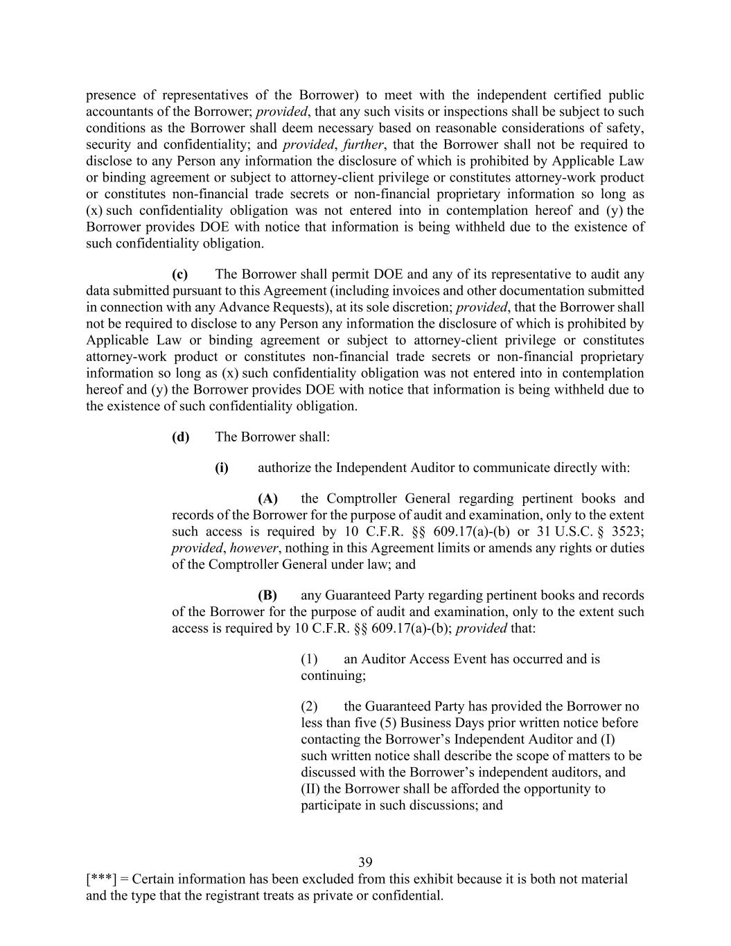 39 [***] = Certain information has been excluded from this exhibit because it is both not material and the type that the registrant treats as private or confidential. presence of representatives of the Borrower) to meet with the independent certified public accountants of the Borrower; provided, that any such visits or inspections shall be subject to such conditions as the Borrower shall deem necessary based on reasonable considerations of safety, security and confidentiality; and provided, further, that the Borrower shall not be required to disclose to any Person any information the disclosure of which is prohibited by Applicable Law or binding agreement or subject to attorney-client privilege or constitutes attorney-work product or constitutes non-financial trade secrets or non-financial proprietary information so long as (x) such confidentiality obligation was not entered into in contemplation hereof and (y) the Borrower provides DOE with notice that information is being withheld due to the existence of such confidentiality obligation. (c) The Borrower shall permit DOE and any of its representative to audit any data submitted pursuant to this Agreement (including invoices and other documentation submitted in connection with any Advance Requests), at its sole discretion; provided, that the Borrower shall not be required to disclose to any Person any information the disclosure of which is prohibited by Applicable Law or binding agreement or subject to attorney-client privilege or constitutes attorney-work product or constitutes non-financial trade secrets or non-financial proprietary information so long as (x) such confidentiality obligation was not entered into in contemplation hereof and (y) the Borrower provides DOE with notice that information is being withheld due to the existence of such confidentiality obligation. (d) The Borrower shall: (i) authorize the Independent Auditor to communicate directly with: (A) the Comptroller General regarding pertinent books and records of the Borrower for the purpose of audit and examination, only to the extent such access is required by 10 C.F.R. §§ 609.17(a)-(b) or 31 U.S.C. § 3523; provided, however, nothing in this Agreement limits or amends any rights or duties of the Comptroller General under law; and (B) any Guaranteed Party regarding pertinent books and records of the Borrower for the purpose of audit and examination, only to the extent such access is required by 10 C.F.R. §§ 609.17(a)-(b); provided that: (1) an Auditor Access Event has occurred and is continuing; (2) the Guaranteed Party has provided the Borrower no less than five (5) Business Days prior written notice before contacting the Borrower’s Independent Auditor and (I) such written notice shall describe the scope of matters to be discussed with the Borrower’s independent auditors, and (II) the Borrower shall be afforded the opportunity to participate in such discussions; and