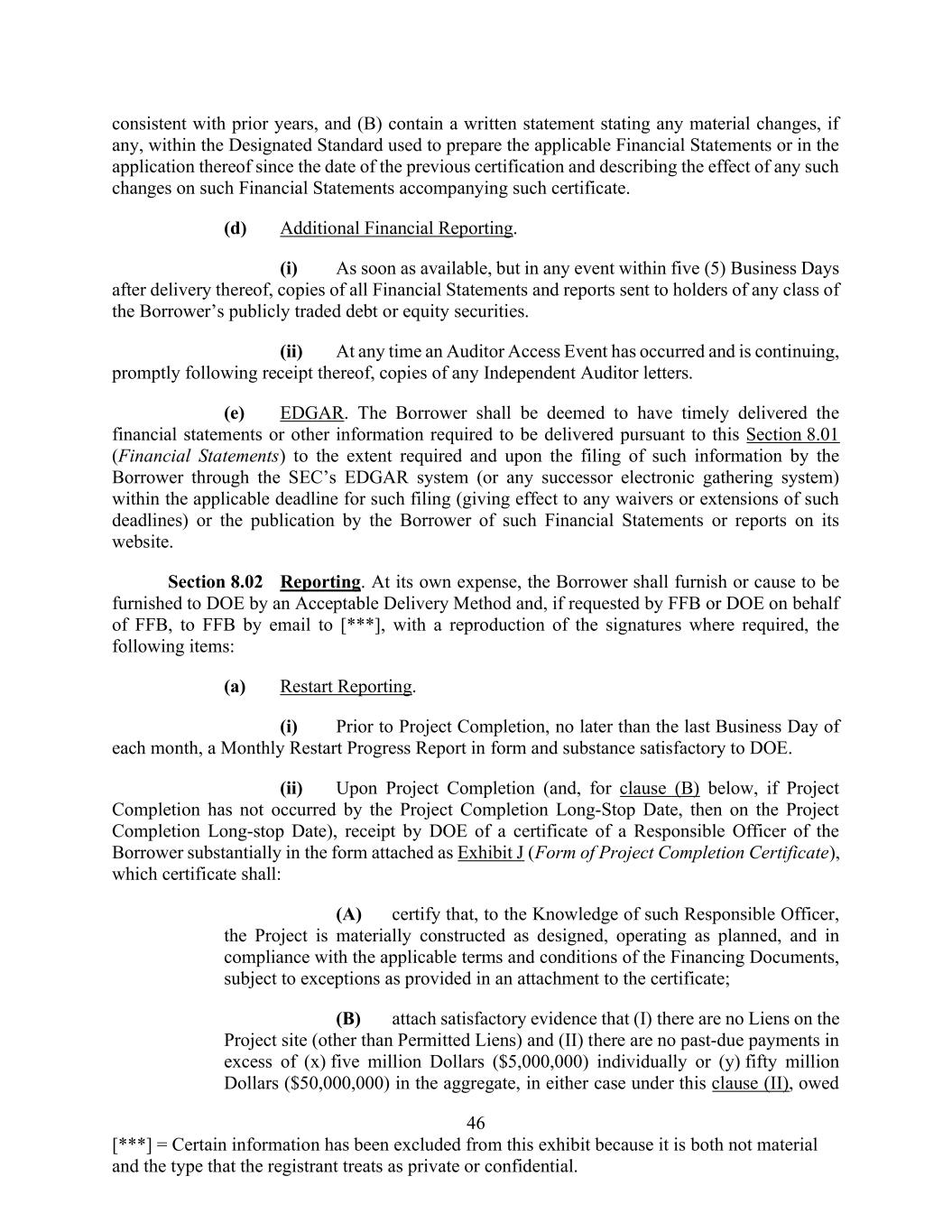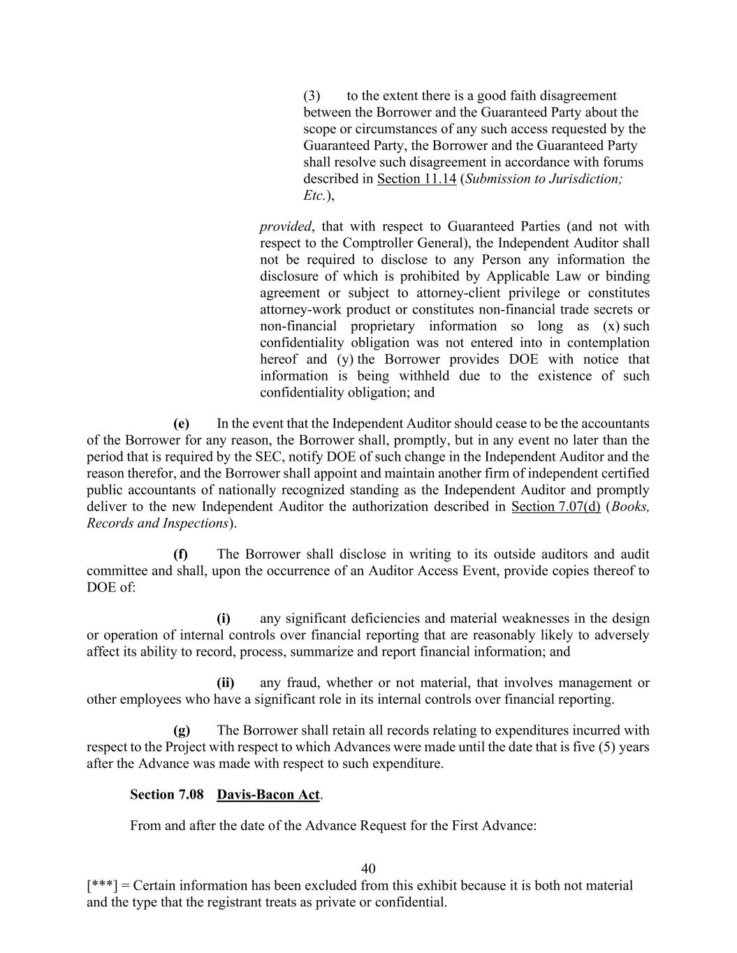 40 [***] = Certain information has been excluded from this exhibit because it is both not material and the type that the registrant treats as private or confidential. (3) to the extent there is a good faith disagreement between the Borrower and the Guaranteed Party about the scope or circumstances of any such access requested by the Guaranteed Party, the Borrower and the Guaranteed Party shall resolve such disagreement in accordance with forums described in Section 11.14 (Submission to Jurisdiction; Etc.), provided, that with respect to Guaranteed Parties (and not with respect to the Comptroller General), the Independent Auditor shall not be required to disclose to any Person any information the disclosure of which is prohibited by Applicable Law or binding agreement or subject to attorney-client privilege or constitutes attorney-work product or constitutes non-financial trade secrets or non-financial proprietary information so long as (x) such confidentiality obligation was not entered into in contemplation hereof and (y) the Borrower provides DOE with notice that information is being withheld due to the existence of such confidentiality obligation; and (e) In the event that the Independent Auditor should cease to be the accountants of the Borrower for any reason, the Borrower shall, promptly, but in any event no later than the period that is required by the SEC, notify DOE of such change in the Independent Auditor and the reason therefor, and the Borrower shall appoint and maintain another firm of independent certified public accountants of nationally recognized standing as the Independent Auditor and promptly deliver to the new Independent Auditor the authorization described in Section 7.07(d) (Books, Records and Inspections). (f) The Borrower shall disclose in writing to its outside auditors and audit committee and shall, upon the occurrence of an Auditor Access Event, provide copies thereof to DOE of: (i) any significant deficiencies and material weaknesses in the design or operation of internal controls over financial reporting that are reasonably likely to adversely affect its ability to record, process, summarize and report financial information; and (ii) any fraud, whether or not material, that involves management or other employees who have a significant role in its internal controls over financial reporting. (g) The Borrower shall retain all records relating to expenditures incurred with respect to the Project with respect to which Advances were made until the date that is five (5) years after the Advance was made with respect to such expenditure. Section 7.08 Davis-Bacon Act. From and after the date of the Advance Request for the First Advance: