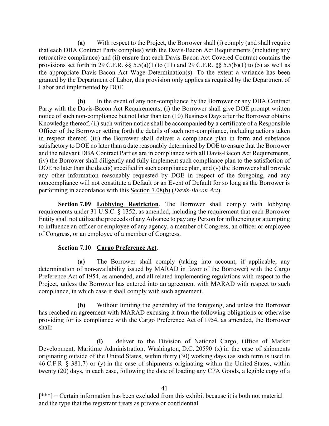 41 [***] = Certain information has been excluded from this exhibit because it is both not material and the type that the registrant treats as private or confidential. (a) With respect to the Project, the Borrower shall (i) comply (and shall require that each DBA Contract Party complies) with the Davis-Bacon Act Requirements (including any retroactive compliance) and (ii) ensure that each Davis-Bacon Act Covered Contract contains the provisions set forth in 29 C.F.R. §§ 5.5(a)(1) to (11) and 29 C.F.R. §§ 5.5(b)(1) to (5) as well as the appropriate Davis-Bacon Act Wage Determination(s). To the extent a variance has been granted by the Department of Labor, this provision only applies as required by the Department of Labor and implemented by DOE. (b) In the event of any non-compliance by the Borrower or any DBA Contract Party with the Davis-Bacon Act Requirements, (i) the Borrower shall give DOE prompt written notice of such non-compliance but not later than ten (10) Business Days after the Borrower obtains Knowledge thereof, (ii) such written notice shall be accompanied by a certificate of a Responsible Officer of the Borrower setting forth the details of such non-compliance, including actions taken in respect thereof, (iii) the Borrower shall deliver a compliance plan in form and substance satisfactory to DOE no later than a date reasonably determined by DOE to ensure that the Borrower and the relevant DBA Contract Parties are in compliance with all Davis-Bacon Act Requirements, (iv) the Borrower shall diligently and fully implement such compliance plan to the satisfaction of DOE no later than the date(s) specified in such compliance plan, and (v) the Borrower shall provide any other information reasonably requested by DOE in respect of the foregoing, and any noncompliance will not constitute a Default or an Event of Default for so long as the Borrower is performing in accordance with this Section 7.08(b) (Davis-Bacon Act). Section 7.09 Lobbying Restriction. The Borrower shall comply with lobbying requirements under 31 U.S.C. § 1352, as amended, including the requirement that each Borrower Entity shall not utilize the proceeds of any Advance to pay any Person for influencing or attempting to influence an officer or employee of any agency, a member of Congress, an officer or employee of Congress, or an employee of a member of Congress. Section 7.10 Cargo Preference Act. (a) The Borrower shall comply (taking into account, if applicable, any determination of non-availability issued by MARAD in favor of the Borrower) with the Cargo Preference Act of 1954, as amended, and all related implementing regulations with respect to the Project, unless the Borrower has entered into an agreement with MARAD with respect to such compliance, in which case it shall comply with such agreement. (b) Without limiting the generality of the foregoing, and unless the Borrower has reached an agreement with MARAD excusing it from the following obligations or otherwise providing for its compliance with the Cargo Preference Act of 1954, as amended, the Borrower shall: (i) deliver to the Division of National Cargo, Office of Market Development, Maritime Administration, Washington, D.C. 20590 (x) in the case of shipments originating outside of the United States, within thirty (30) working days (as such term is used in 46 C.F.R. § 381.7) or (y) in the case of shipments originating within the United States, within twenty (20) days, in each case, following the date of loading any CPA Goods, a legible copy of a