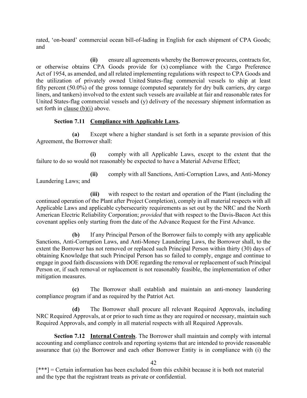 42 [***] = Certain information has been excluded from this exhibit because it is both not material and the type that the registrant treats as private or confidential. rated, ‘on-board’ commercial ocean bill-of-lading in English for each shipment of CPA Goods; and (ii) ensure all agreements whereby the Borrower procures, contracts for, or otherwise obtains CPA Goods provide for (x) compliance with the Cargo Preference Act of 1954, as amended, and all related implementing regulations with respect to CPA Goods and the utilization of privately owned United States-flag commercial vessels to ship at least fifty percent (50.0%) of the gross tonnage (computed separately for dry bulk carriers, dry cargo liners, and tankers) involved to the extent such vessels are available at fair and reasonable rates for United States-flag commercial vessels and (y) delivery of the necessary shipment information as set forth in clause (b)(i) above. Section 7.11 Compliance with Applicable Laws. (a) Except where a higher standard is set forth in a separate provision of this Agreement, the Borrower shall: (i) comply with all Applicable Laws, except to the extent that the failure to do so would not reasonably be expected to have a Material Adverse Effect; (ii) comply with all Sanctions, Anti-Corruption Laws, and Anti-Money Laundering Laws; and (iii) with respect to the restart and operation of the Plant (including the continued operation of the Plant after Project Completion), comply in all material respects with all Applicable Laws and applicable cybersecurity requirements as set out by the NRC and the North American Electric Reliability Corporation; provided that with respect to the Davis-Bacon Act this covenant applies only starting from the date of the Advance Request for the First Advance. (b) If any Principal Person of the Borrower fails to comply with any applicable Sanctions, Anti-Corruption Laws, and Anti-Money Laundering Laws, the Borrower shall, to the extent the Borrower has not removed or replaced such Principal Person within thirty (30) days of obtaining Knowledge that such Principal Person has so failed to comply, engage and continue to engage in good faith discussions with DOE regarding the removal or replacement of such Principal Person or, if such removal or replacement is not reasonably feasible, the implementation of other mitigation measures. (c) The Borrower shall establish and maintain an anti-money laundering compliance program if and as required by the Patriot Act. (d) The Borrower shall procure all relevant Required Approvals, including NRC Required Approvals, at or prior to such time as they are required or necessary, maintain such Required Approvals, and comply in all material respects with all Required Approvals. Section 7.12 Internal Controls. The Borrower shall maintain and comply with internal accounting and compliance controls and reporting systems that are intended to provide reasonable assurance that (a) the Borrower and each other Borrower Entity is in compliance with (i) the