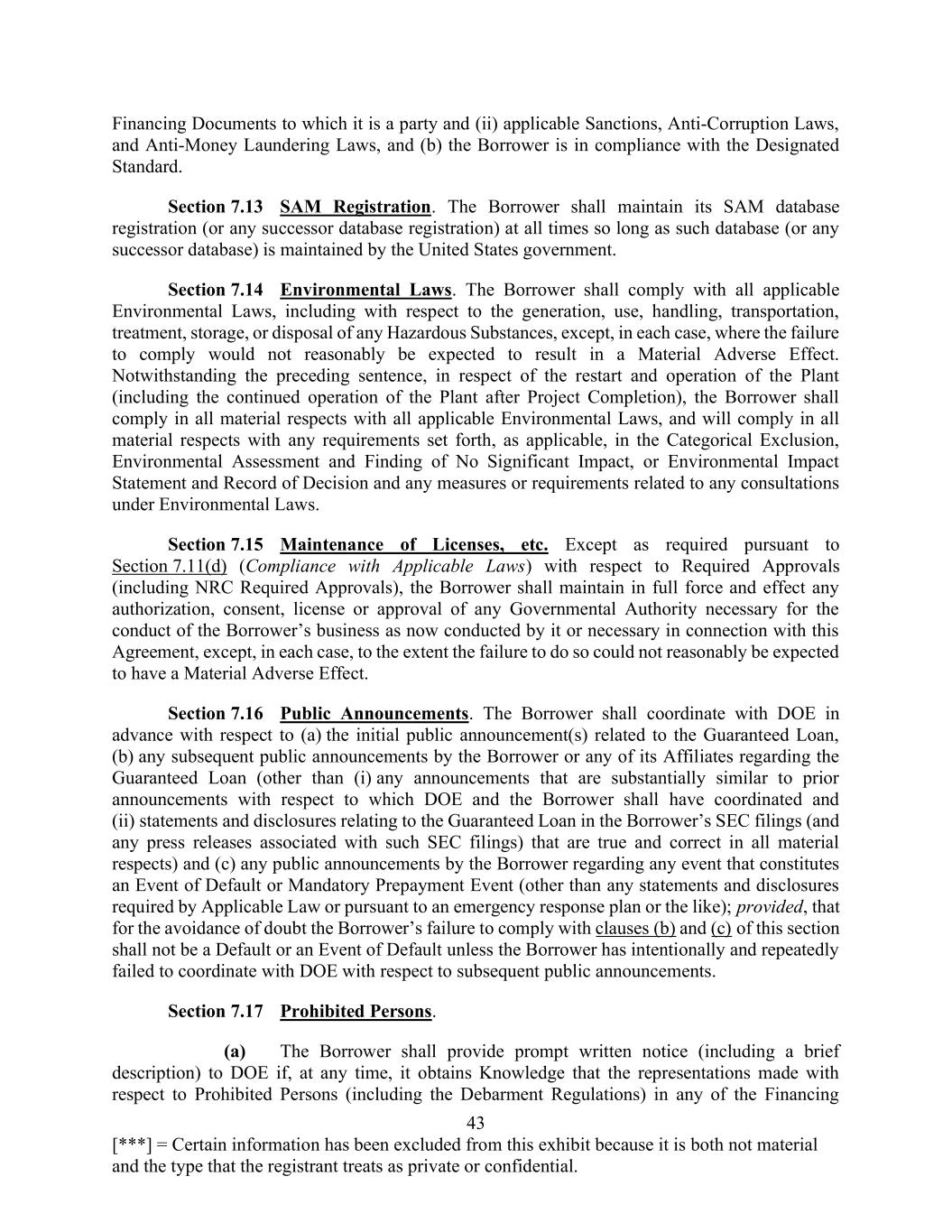 43 [***] = Certain information has been excluded from this exhibit because it is both not material and the type that the registrant treats as private or confidential. Financing Documents to which it is a party and (ii) applicable Sanctions, Anti-Corruption Laws, and Anti-Money Laundering Laws, and (b) the Borrower is in compliance with the Designated Standard. Section 7.13 SAM Registration. The Borrower shall maintain its SAM database registration (or any successor database registration) at all times so long as such database (or any successor database) is maintained by the United States government. Section 7.14 Environmental Laws. The Borrower shall comply with all applicable Environmental Laws, including with respect to the generation, use, handling, transportation, treatment, storage, or disposal of any Hazardous Substances, except, in each case, where the failure to comply would not reasonably be expected to result in a Material Adverse Effect. Notwithstanding the preceding sentence, in respect of the restart and operation of the Plant (including the continued operation of the Plant after Project Completion), the Borrower shall comply in all material respects with all applicable Environmental Laws, and will comply in all material respects with any requirements set forth, as applicable, in the Categorical Exclusion, Environmental Assessment and Finding of No Significant Impact, or Environmental Impact Statement and Record of Decision and any measures or requirements related to any consultations under Environmental Laws. Section 7.15 Maintenance of Licenses, etc. Except as required pursuant to Section 7.11(d) (Compliance with Applicable Laws) with respect to Required Approvals (including NRC Required Approvals), the Borrower shall maintain in full force and effect any authorization, consent, license or approval of any Governmental Authority necessary for the conduct of the Borrower’s business as now conducted by it or necessary in connection with this Agreement, except, in each case, to the extent the failure to do so could not reasonably be expected to have a Material Adverse Effect. Section 7.16 Public Announcements. The Borrower shall coordinate with DOE in advance with respect to (a) the initial public announcement(s) related to the Guaranteed Loan, (b) any subsequent public announcements by the Borrower or any of its Affiliates regarding the Guaranteed Loan (other than (i) any announcements that are substantially similar to prior announcements with respect to which DOE and the Borrower shall have coordinated and (ii) statements and disclosures relating to the Guaranteed Loan in the Borrower’s SEC filings (and any press releases associated with such SEC filings) that are true and correct in all material respects) and (c) any public announcements by the Borrower regarding any event that constitutes an Event of Default or Mandatory Prepayment Event (other than any statements and disclosures required by Applicable Law or pursuant to an emergency response plan or the like); provided, that for the avoidance of doubt the Borrower’s failure to comply with clauses (b) and (c) of this section shall not be a Default or an Event of Default unless the Borrower has intentionally and repeatedly failed to coordinate with DOE with respect to subsequent public announcements. Section 7.17 Prohibited Persons. (a) The Borrower shall provide prompt written notice (including a brief description) to DOE if, at any time, it obtains Knowledge that the representations made with respect to Prohibited Persons (including the Debarment Regulations) in any of the Financing