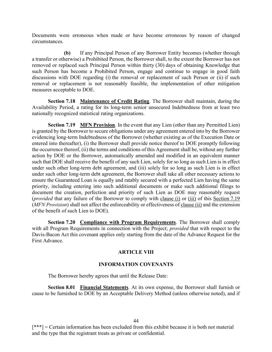 44 [***] = Certain information has been excluded from this exhibit because it is both not material and the type that the registrant treats as private or confidential. Documents were erroneous when made or have become erroneous by reason of changed circumstances. (b) If any Principal Person of any Borrower Entity becomes (whether through a transfer or otherwise) a Prohibited Person, the Borrower shall, to the extent the Borrower has not removed or replaced such Principal Person within thirty (30) days of obtaining Knowledge that such Person has become a Prohibited Person, engage and continue to engage in good faith discussions with DOE regarding (i) the removal or replacement of such Person or (ii) if such removal or replacement is not reasonably feasible, the implementation of other mitigation measures acceptable to DOE. Section 7.18 Maintenance of Credit Rating. The Borrower shall maintain, during the Availability Period, a rating for its long-term senior unsecured Indebtedness from at least two nationally recognized statistical rating organizations. Section 7.19 MFN Provision. In the event that any Lien (other than any Permitted Lien) is granted by the Borrower to secure obligations under any agreement entered into by the Borrower evidencing long-term Indebtedness of the Borrower (whether existing as of the Execution Date or entered into thereafter), (i) the Borrower shall provide notice thereof to DOE promptly following the occurrence thereof, (ii) the terms and conditions of this Agreement shall be, without any further action by DOE or the Borrower, automatically amended and modified in an equivalent manner such that DOE shall receive the benefit of any such Lien, solely for so long as such Lien is in effect under such other long-term debt agreement, and (iii) solely for so long as such Lien is in effect under such other long-term debt agreement, the Borrower shall take all other necessary actions to ensure the Guaranteed Loan is equally and ratably secured with a perfected Lien having the same priority, including entering into such additional documents or make such additional filings to document the creation, perfection and priority of such Lien as DOE may reasonably request (provided that any failure of the Borrower to comply with clause (i) or (iii) of this Section 7.19 (MFN Provision) shall not affect the enforceability or effectiveness of clause (ii) and the extension of the benefit of such Lien to DOE). Section 7.20 Compliance with Program Requirements. The Borrower shall comply with all Program Requirements in connection with the Project; provided that with respect to the Davis-Bacon Act this covenant applies only starting from the date of the Advance Request for the First Advance. ARTICLE VIII INFORMATION COVENANTS The Borrower hereby agrees that until the Release Date: Section 8.01 Financial Statements. At its own expense, the Borrower shall furnish or cause to be furnished to DOE by an Acceptable Delivery Method (unless otherwise noted), and if