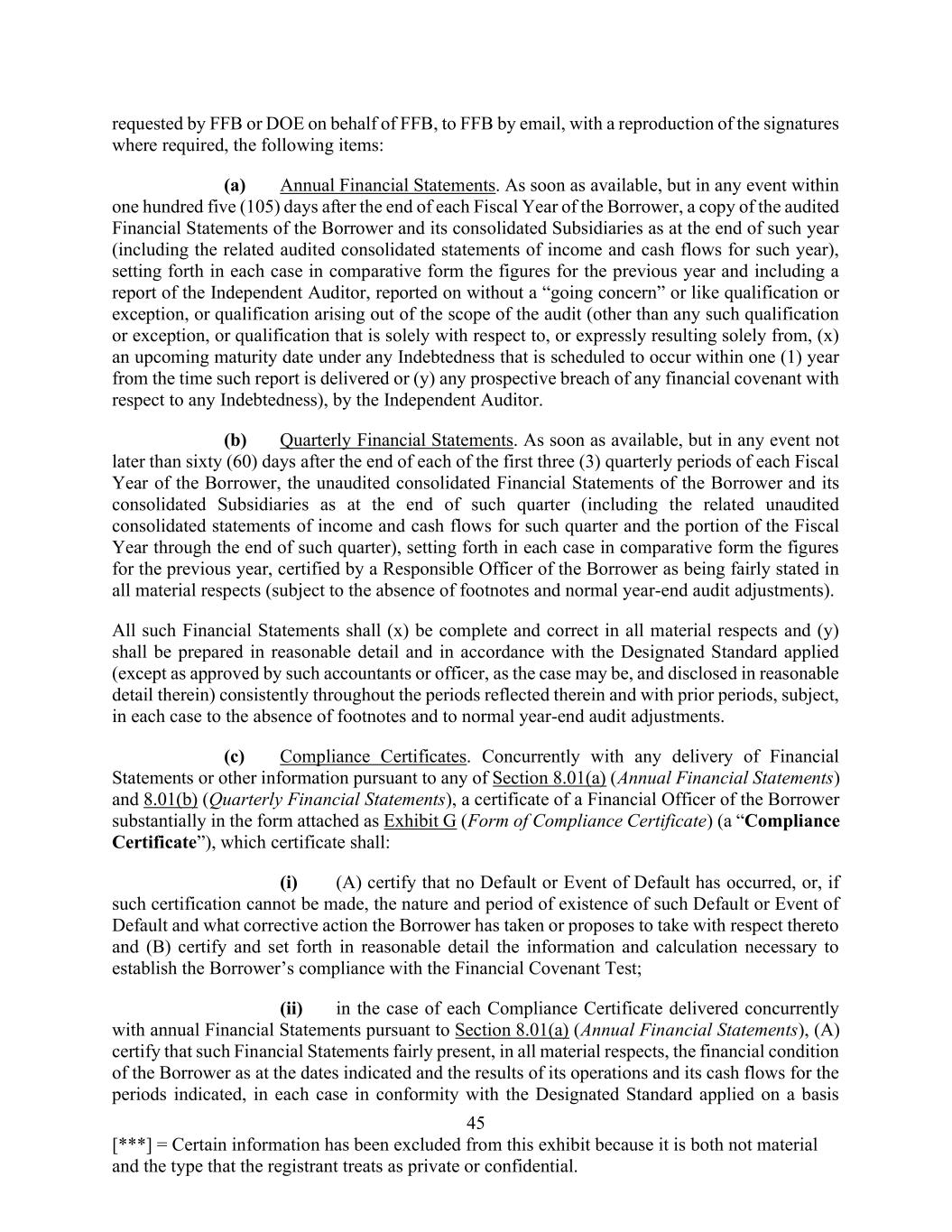 45 [***] = Certain information has been excluded from this exhibit because it is both not material and the type that the registrant treats as private or confidential. requested by FFB or DOE on behalf of FFB, to FFB by email, with a reproduction of the signatures where required, the following items: (a) Annual Financial Statements. As soon as available, but in any event within one hundred five (105) days after the end of each Fiscal Year of the Borrower, a copy of the audited Financial Statements of the Borrower and its consolidated Subsidiaries as at the end of such year (including the related audited consolidated statements of income and cash flows for such year), setting forth in each case in comparative form the figures for the previous year and including a report of the Independent Auditor, reported on without a “going concern” or like qualification or exception, or qualification arising out of the scope of the audit (other than any such qualification or exception, or qualification that is solely with respect to, or expressly resulting solely from, (x) an upcoming maturity date under any Indebtedness that is scheduled to occur within one (1) year from the time such report is delivered or (y) any prospective breach of any financial covenant with respect to any Indebtedness), by the Independent Auditor. (b) Quarterly Financial Statements. As soon as available, but in any event not later than sixty (60) days after the end of each of the first three (3) quarterly periods of each Fiscal Year of the Borrower, the unaudited consolidated Financial Statements of the Borrower and its consolidated Subsidiaries as at the end of such quarter (including the related unaudited consolidated statements of income and cash flows for such quarter and the portion of the Fiscal Year through the end of such quarter), setting forth in each case in comparative form the figures for the previous year, certified by a Responsible Officer of the Borrower as being fairly stated in all material respects (subject to the absence of footnotes and normal year-end audit adjustments). All such Financial Statements shall (x) be complete and correct in all material respects and (y) shall be prepared in reasonable detail and in accordance with the Designated Standard applied (except as approved by such accountants or officer, as the case may be, and disclosed in reasonable detail therein) consistently throughout the periods reflected therein and with prior periods, subject, in each case to the absence of footnotes and to normal year-end audit adjustments. (c) Compliance Certificates. Concurrently with any delivery of Financial Statements or other information pursuant to any of Section 8.01(a) (Annual Financial Statements) and 8.01(b) (Quarterly Financial Statements), a certificate of a Financial Officer of the Borrower substantially in the form attached as Exhibit G (Form of Compliance Certificate) (a “Compliance Certificate”), which certificate shall: (i) (A) certify that no Default or Event of Default has occurred, or, if such certification cannot be made, the nature and period of existence of such Default or Event of Default and what corrective action the Borrower has taken or proposes to take with respect thereto and (B) certify and set forth in reasonable detail the information and calculation necessary to establish the Borrower’s compliance with the Financial Covenant Test; (ii) in the case of each Compliance Certificate delivered concurrently with annual Financial Statements pursuant to Section 8.01(a) (Annual Financial Statements), (A) certify that such Financial Statements fairly present, in all material respects, the financial condition of the Borrower as at the dates indicated and the results of its operations and its cash flows for the periods indicated, in each case in conformity with the Designated Standard applied on a basis