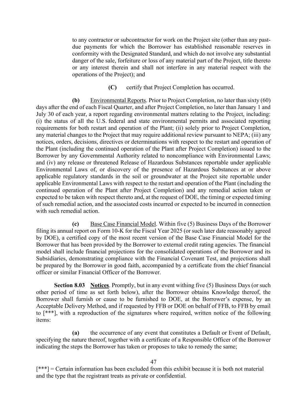 47 [***] = Certain information has been excluded from this exhibit because it is both not material and the type that the registrant treats as private or confidential. to any contractor or subcontractor for work on the Project site (other than any past- due payments for which the Borrower has established reasonable reserves in conformity with the Designated Standard, and which do not involve any substantial danger of the sale, forfeiture or loss of any material part of the Project, title thereto or any interest therein and shall not interfere in any material respect with the operations of the Project); and (C) certify that Project Completion has occurred. (b) Environmental Reports. Prior to Project Completion, no later than sixty (60) days after the end of each Fiscal Quarter, and after Project Completion, no later than January 1 and July 30 of each year, a report regarding environmental matters relating to the Project, including: (i) the status of all the U.S. federal and state environmental permits and associated reporting requirements for both restart and operation of the Plant; (ii) solely prior to Project Completion, any material changes to the Project that may require additional review pursuant to NEPA; (iii) any notices, orders, decisions, directives or determinations with respect to the restart and operation of the Plant (including the continued operation of the Plant after Project Completion) issued to the Borrower by any Governmental Authority related to noncompliance with Environmental Laws; and (iv) any release or threatened Release of Hazardous Substances reportable under applicable Environmental Laws of, or discovery of the presence of Hazardous Substances at or above applicable regulatory standards in the soil or groundwater at the Project site reportable under applicable Environmental Laws with respect to the restart and operation of the Plant (including the continued operation of the Plant after Project Completion) and any remedial action taken or expected to be taken with respect thereto and, at the request of DOE, the timing or expected timing of such remedial action, and the associated costs incurred or expected to be incurred in connection with such remedial action. (c) Base Case Financial Model. Within five (5) Business Days of the Borrower filing its annual report on Form 10-K for the Fiscal Year 2025 (or such later date reasonably agreed by DOE), a certified copy of the most recent version of the Base Case Financial Model for the Borrower that has been provided by the Borrower to external credit rating agencies. The financial model shall include financial projections for the consolidated operations of the Borrower and its Subsidiaries, demonstrating compliance with the Financial Covenant Test, and projections shall be prepared by the Borrower in good faith, accompanied by a certificate from the chief financial officer or similar Financial Officer of the Borrower. Section 8.03 Notices. Promptly, but in any event withing five (5) Business Days (or such other period of time as set forth below), after the Borrower obtains Knowledge thereof, the Borrower shall furnish or cause to be furnished to DOE, at the Borrower’s expense, by an Acceptable Delivery Method, and if requested by FFB or DOE on behalf of FFB, to FFB by email to [***], with a reproduction of the signatures where required, written notice of the following items: (a) the occurrence of any event that constitutes a Default or Event of Default, specifying the nature thereof, together with a certificate of a Responsible Officer of the Borrower indicating the steps the Borrower has taken or proposes to take to remedy the same;