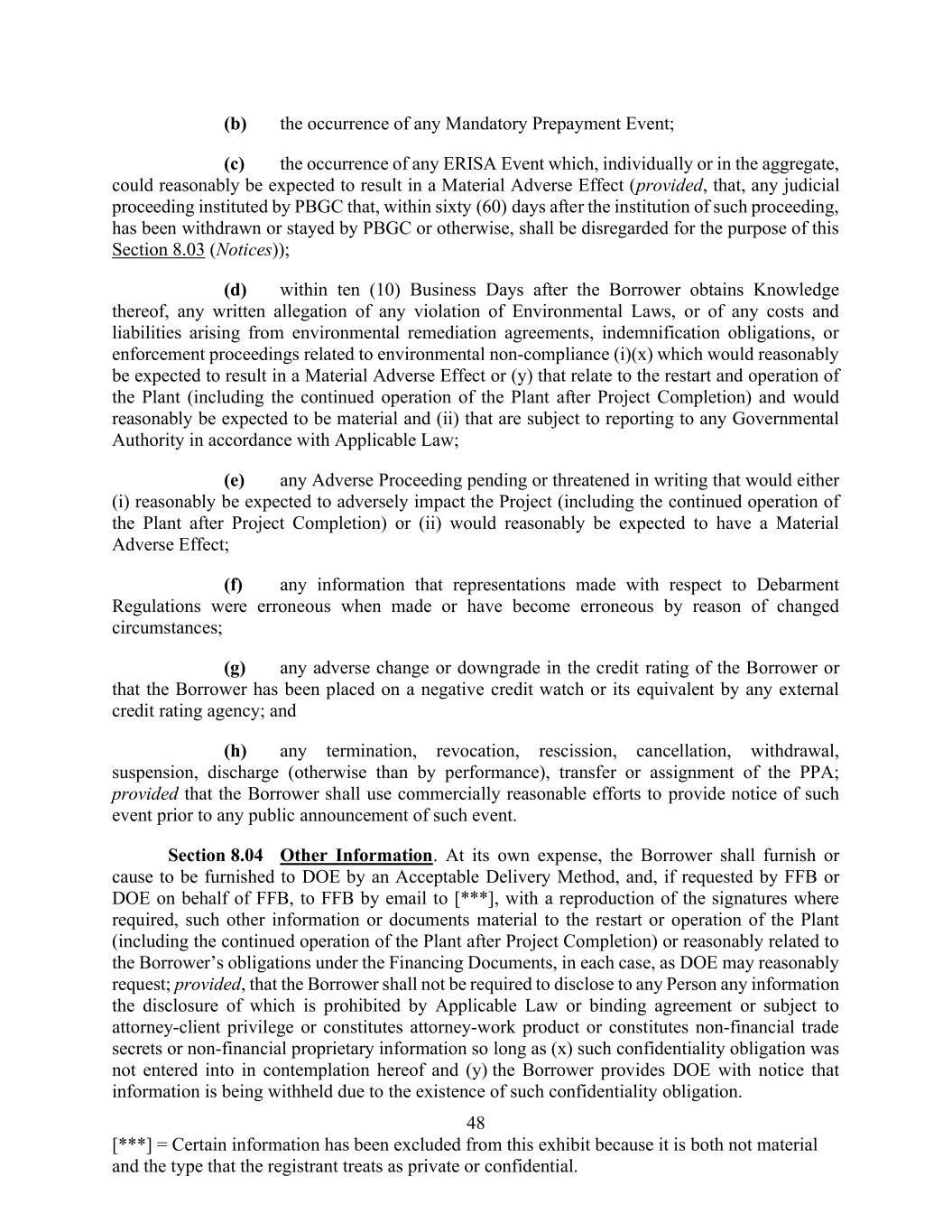 48 [***] = Certain information has been excluded from this exhibit because it is both not material and the type that the registrant treats as private or confidential. (b) the occurrence of any Mandatory Prepayment Event; (c) the occurrence of any ERISA Event which, individually or in the aggregate, could reasonably be expected to result in a Material Adverse Effect (provided, that, any judicial proceeding instituted by PBGC that, within sixty (60) days after the institution of such proceeding, has been withdrawn or stayed by PBGC or otherwise, shall be disregarded for the purpose of this Section 8.03 (Notices)); (d) within ten (10) Business Days after the Borrower obtains Knowledge thereof, any written allegation of any violation of Environmental Laws, or of any costs and liabilities arising from environmental remediation agreements, indemnification obligations, or enforcement proceedings related to environmental non-compliance (i)(x) which would reasonably be expected to result in a Material Adverse Effect or (y) that relate to the restart and operation of the Plant (including the continued operation of the Plant after Project Completion) and would reasonably be expected to be material and (ii) that are subject to reporting to any Governmental Authority in accordance with Applicable Law; (e) any Adverse Proceeding pending or threatened in writing that would either (i) reasonably be expected to adversely impact the Project (including the continued operation of the Plant after Project Completion) or (ii) would reasonably be expected to have a Material Adverse Effect; (f) any information that representations made with respect to Debarment Regulations were erroneous when made or have become erroneous by reason of changed circumstances; (g) any adverse change or downgrade in the credit rating of the Borrower or that the Borrower has been placed on a negative credit watch or its equivalent by any external credit rating agency; and (h) any termination, revocation, rescission, cancellation, withdrawal, suspension, discharge (otherwise than by performance), transfer or assignment of the PPA; provided that the Borrower shall use commercially reasonable efforts to provide notice of such event prior to any public announcement of such event. Section 8.04 Other Information. At its own expense, the Borrower shall furnish or cause to be furnished to DOE by an Acceptable Delivery Method, and, if requested by FFB or DOE on behalf of FFB, to FFB by email to [***], with a reproduction of the signatures where required, such other information or documents material to the restart or operation of the Plant (including the continued operation of the Plant after Project Completion) or reasonably related to the Borrower’s obligations under the Financing Documents, in each case, as DOE may reasonably request; provided, that the Borrower shall not be required to disclose to any Person any information the disclosure of which is prohibited by Applicable Law or binding agreement or subject to attorney-client privilege or constitutes attorney-work product or constitutes non-financial trade secrets or non-financial proprietary information so long as (x) such confidentiality obligation was not entered into in contemplation hereof and (y) the Borrower provides DOE with notice that information is being withheld due to the existence of such confidentiality obligation.