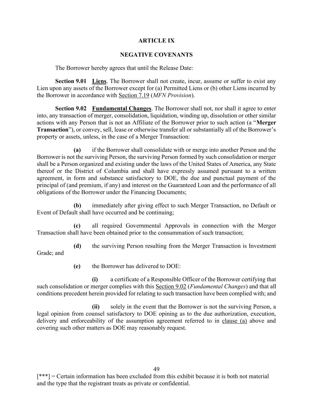 49 [***] = Certain information has been excluded from this exhibit because it is both not material and the type that the registrant treats as private or confidential. ARTICLE IX NEGATIVE COVENANTS The Borrower hereby agrees that until the Release Date: Section 9.01 Liens. The Borrower shall not create, incur, assume or suffer to exist any Lien upon any assets of the Borrower except for (a) Permitted Liens or (b) other Liens incurred by the Borrower in accordance with Section 7.19 (MFN Provision). Section 9.02 Fundamental Changes. The Borrower shall not, nor shall it agree to enter into, any transaction of merger, consolidation, liquidation, winding up, dissolution or other similar actions with any Person that is not an Affiliate of the Borrower prior to such action (a “Merger Transaction”), or convey, sell, lease or otherwise transfer all or substantially all of the Borrower’s property or assets, unless, in the case of a Merger Transaction: (a) if the Borrower shall consolidate with or merge into another Person and the Borrower is not the surviving Person, the surviving Person formed by such consolidation or merger shall be a Person organized and existing under the laws of the United States of America, any State thereof or the District of Columbia and shall have expressly assumed pursuant to a written agreement, in form and substance satisfactory to DOE, the due and punctual payment of the principal of (and premium, if any) and interest on the Guaranteed Loan and the performance of all obligations of the Borrower under the Financing Documents; (b) immediately after giving effect to such Merger Transaction, no Default or Event of Default shall have occurred and be continuing; (c) all required Governmental Approvals in connection with the Merger Transaction shall have been obtained prior to the consummation of such transaction; (d) the surviving Person resulting from the Merger Transaction is Investment Grade; and (e) the Borrower has delivered to DOE: (i) a certificate of a Responsible Officer of the Borrower certifying that such consolidation or merger complies with this Section 9.02 (Fundamental Changes) and that all conditions precedent herein provided for relating to such transaction have been complied with; and (ii) solely in the event that the Borrower is not the surviving Person, a legal opinion from counsel satisfactory to DOE opining as to the due authorization, execution, delivery and enforceability of the assumption agreement referred to in clause (a) above and covering such other matters as DOE may reasonably request.