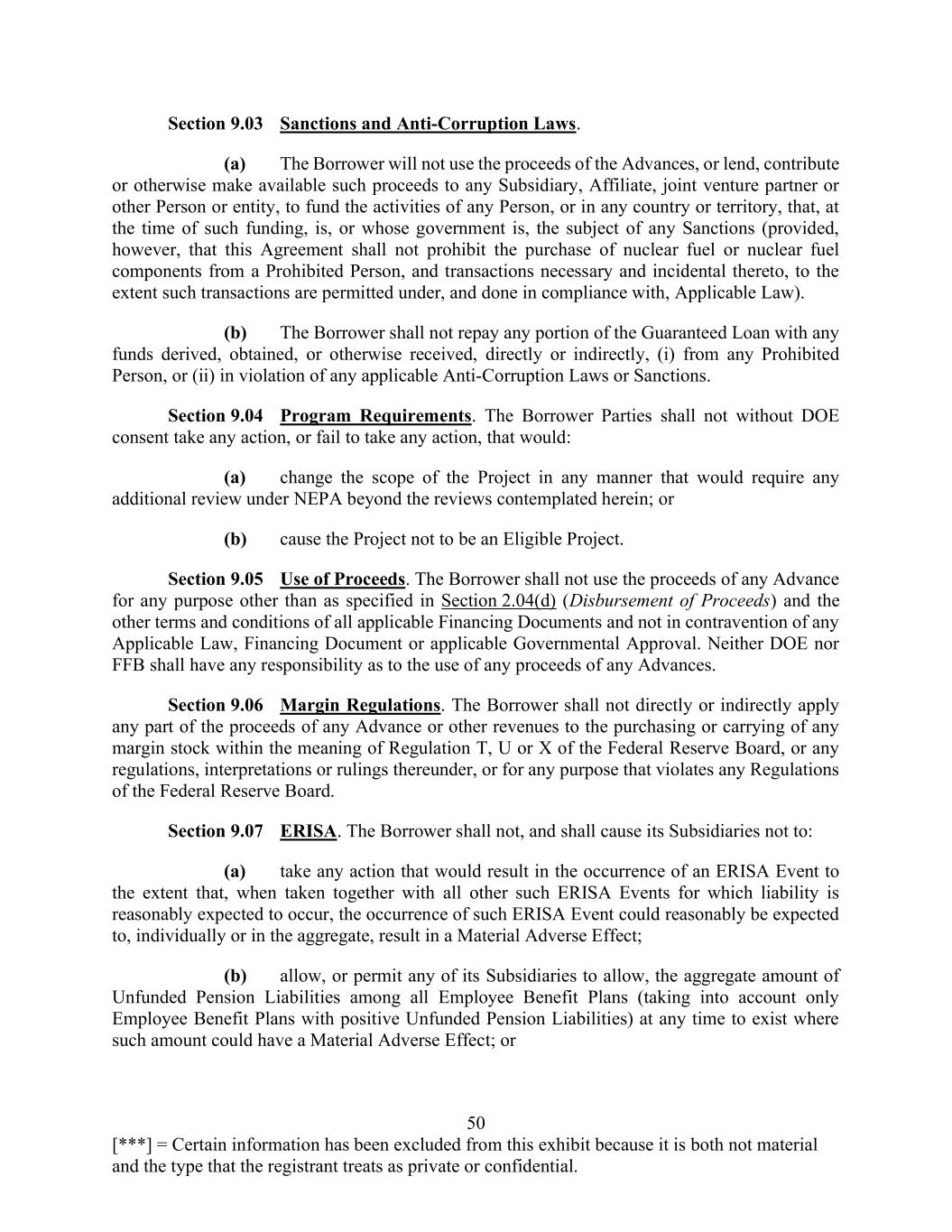 50 [***] = Certain information has been excluded from this exhibit because it is both not material and the type that the registrant treats as private or confidential. Section 9.03 Sanctions and Anti-Corruption Laws. (a) The Borrower will not use the proceeds of the Advances, or lend, contribute or otherwise make available such proceeds to any Subsidiary, Affiliate, joint venture partner or other Person or entity, to fund the activities of any Person, or in any country or territory, that, at the time of such funding, is, or whose government is, the subject of any Sanctions (provided, however, that this Agreement shall not prohibit the purchase of nuclear fuel or nuclear fuel components from a Prohibited Person, and transactions necessary and incidental thereto, to the extent such transactions are permitted under, and done in compliance with, Applicable Law). (b) The Borrower shall not repay any portion of the Guaranteed Loan with any funds derived, obtained, or otherwise received, directly or indirectly, (i) from any Prohibited Person, or (ii) in violation of any applicable Anti-Corruption Laws or Sanctions. Section 9.04 Program Requirements. The Borrower Parties shall not without DOE consent take any action, or fail to take any action, that would: (a) change the scope of the Project in any manner that would require any additional review under NEPA beyond the reviews contemplated herein; or (b) cause the Project not to be an Eligible Project. Section 9.05 Use of Proceeds. The Borrower shall not use the proceeds of any Advance for any purpose other than as specified in Section 2.04(d) (Disbursement of Proceeds) and the other terms and conditions of all applicable Financing Documents and not in contravention of any Applicable Law, Financing Document or applicable Governmental Approval. Neither DOE nor FFB shall have any responsibility as to the use of any proceeds of any Advances. Section 9.06 Margin Regulations. The Borrower shall not directly or indirectly apply any part of the proceeds of any Advance or other revenues to the purchasing or carrying of any margin stock within the meaning of Regulation T, U or X of the Federal Reserve Board, or any regulations, interpretations or rulings thereunder, or for any purpose that violates any Regulations of the Federal Reserve Board. Section 9.07 ERISA. The Borrower shall not, and shall cause its Subsidiaries not to: (a) take any action that would result in the occurrence of an ERISA Event to the extent that, when taken together with all other such ERISA Events for which liability is reasonably expected to occur, the occurrence of such ERISA Event could reasonably be expected to, individually or in the aggregate, result in a Material Adverse Effect; (b) allow, or permit any of its Subsidiaries to allow, the aggregate amount of Unfunded Pension Liabilities among all Employee Benefit Plans (taking into account only Employee Benefit Plans with positive Unfunded Pension Liabilities) at any time to exist where such amount could have a Material Adverse Effect; or