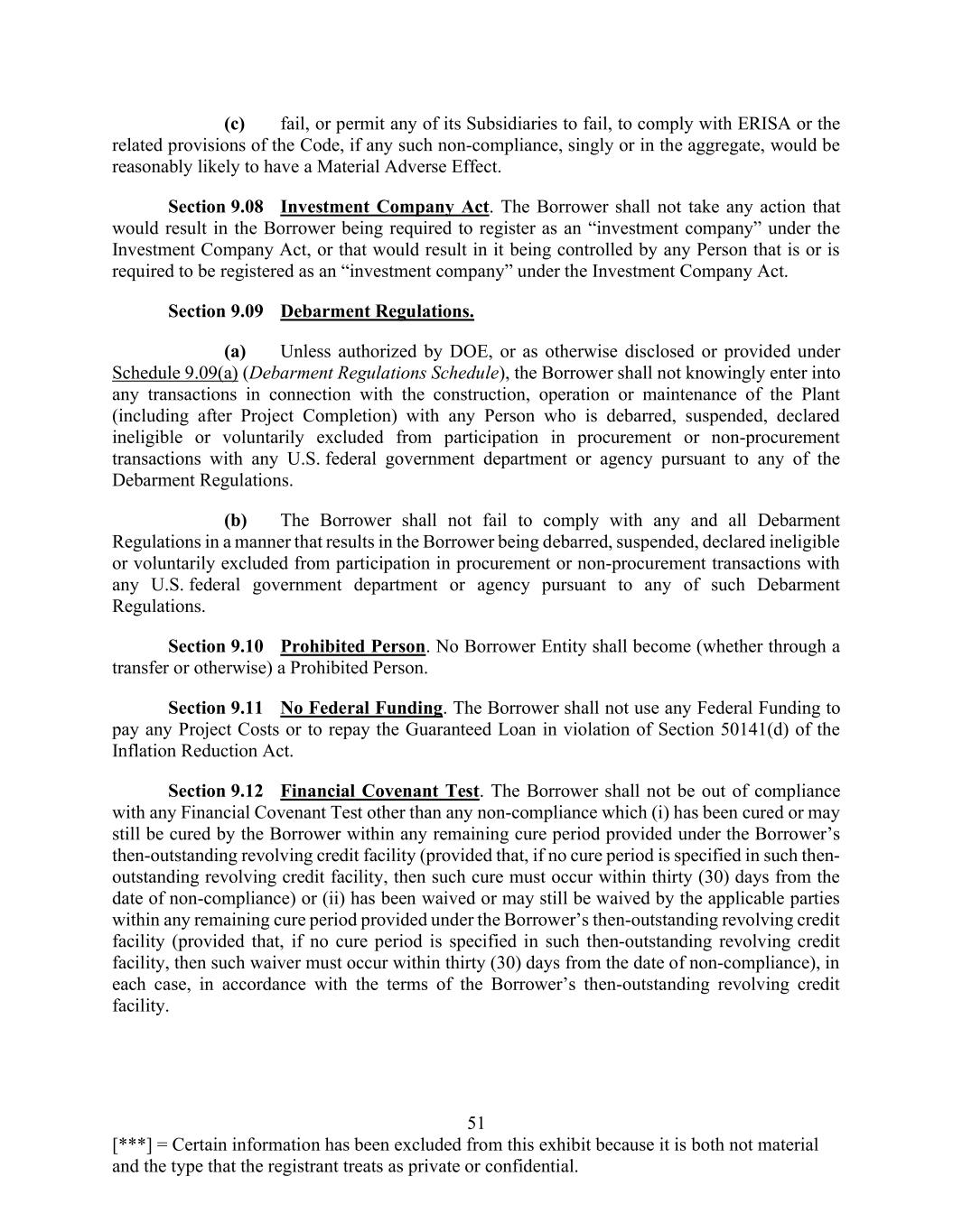 51 [***] = Certain information has been excluded from this exhibit because it is both not material and the type that the registrant treats as private or confidential. (c) fail, or permit any of its Subsidiaries to fail, to comply with ERISA or the related provisions of the Code, if any such non-compliance, singly or in the aggregate, would be reasonably likely to have a Material Adverse Effect. Section 9.08 Investment Company Act. The Borrower shall not take any action that would result in the Borrower being required to register as an “investment company” under the Investment Company Act, or that would result in it being controlled by any Person that is or is required to be registered as an “investment company” under the Investment Company Act. Section 9.09 Debarment Regulations. (a) Unless authorized by DOE, or as otherwise disclosed or provided under Schedule 9.09(a) (Debarment Regulations Schedule), the Borrower shall not knowingly enter into any transactions in connection with the construction, operation or maintenance of the Plant (including after Project Completion) with any Person who is debarred, suspended, declared ineligible or voluntarily excluded from participation in procurement or non-procurement transactions with any U.S. federal government department or agency pursuant to any of the Debarment Regulations. (b) The Borrower shall not fail to comply with any and all Debarment Regulations in a manner that results in the Borrower being debarred, suspended, declared ineligible or voluntarily excluded from participation in procurement or non-procurement transactions with any U.S. federal government department or agency pursuant to any of such Debarment Regulations. Section 9.10 Prohibited Person. No Borrower Entity shall become (whether through a transfer or otherwise) a Prohibited Person. Section 9.11 No Federal Funding. The Borrower shall not use any Federal Funding to pay any Project Costs or to repay the Guaranteed Loan in violation of Section 50141(d) of the Inflation Reduction Act. Section 9.12 Financial Covenant Test. The Borrower shall not be out of compliance with any Financial Covenant Test other than any non-compliance which (i) has been cured or may still be cured by the Borrower within any remaining cure period provided under the Borrower’s then-outstanding revolving credit facility (provided that, if no cure period is specified in such then- outstanding revolving credit facility, then such cure must occur within thirty (30) days from the date of non-compliance) or (ii) has been waived or may still be waived by the applicable parties within any remaining cure period provided under the Borrower’s then-outstanding revolving credit facility (provided that, if no cure period is specified in such then-outstanding revolving credit facility, then such waiver must occur within thirty (30) days from the date of non-compliance), in each case, in accordance with the terms of the Borrower’s then-outstanding revolving credit facility.