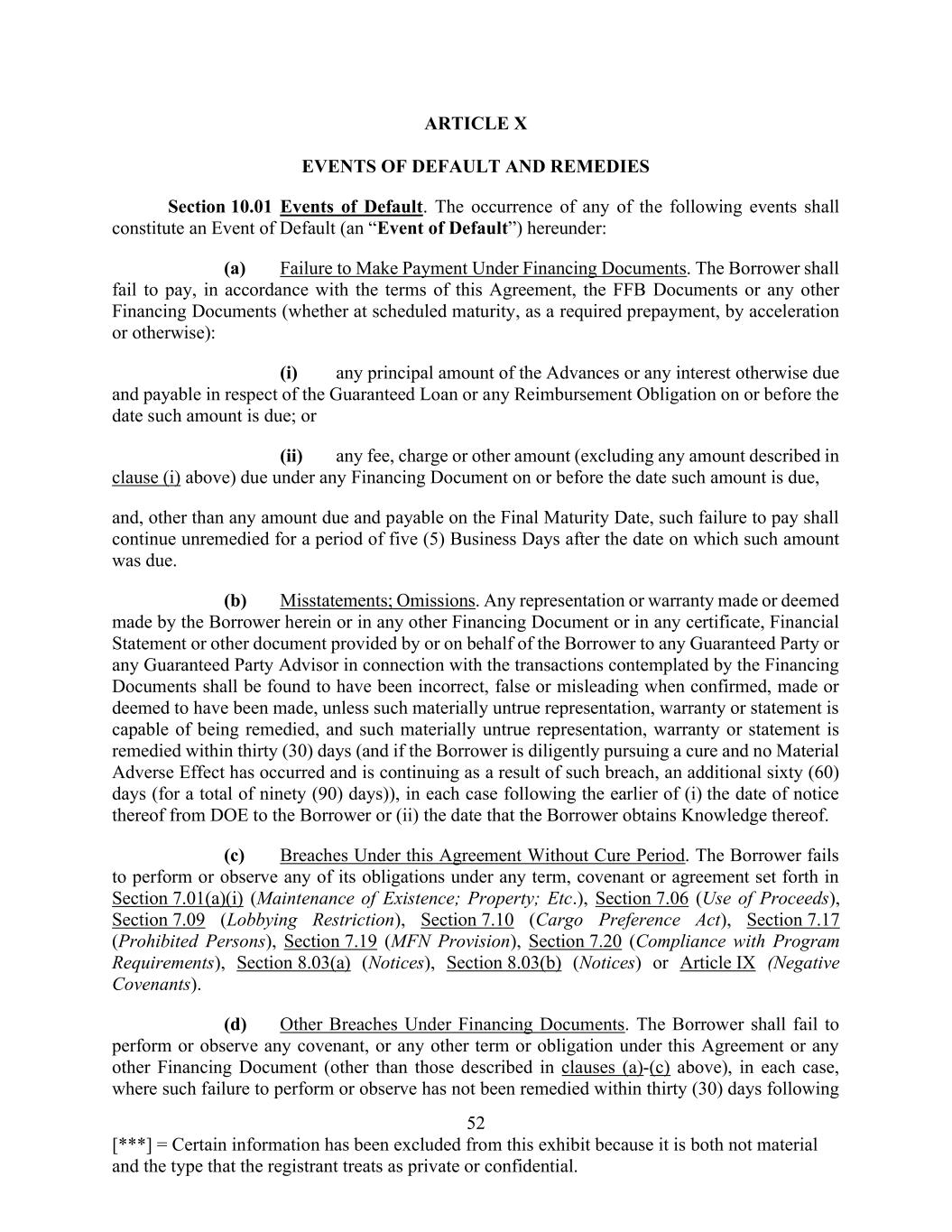 52 [***] = Certain information has been excluded from this exhibit because it is both not material and the type that the registrant treats as private or confidential. ARTICLE X EVENTS OF DEFAULT AND REMEDIES Section 10.01 Events of Default. The occurrence of any of the following events shall constitute an Event of Default (an “Event of Default”) hereunder: (a) Failure to Make Payment Under Financing Documents. The Borrower shall fail to pay, in accordance with the terms of this Agreement, the FFB Documents or any other Financing Documents (whether at scheduled maturity, as a required prepayment, by acceleration or otherwise): (i) any principal amount of the Advances or any interest otherwise due and payable in respect of the Guaranteed Loan or any Reimbursement Obligation on or before the date such amount is due; or (ii) any fee, charge or other amount (excluding any amount described in clause (i) above) due under any Financing Document on or before the date such amount is due, and, other than any amount due and payable on the Final Maturity Date, such failure to pay shall continue unremedied for a period of five (5) Business Days after the date on which such amount was due. (b) Misstatements; Omissions. Any representation or warranty made or deemed made by the Borrower herein or in any other Financing Document or in any certificate, Financial Statement or other document provided by or on behalf of the Borrower to any Guaranteed Party or any Guaranteed Party Advisor in connection with the transactions contemplated by the Financing Documents shall be found to have been incorrect, false or misleading when confirmed, made or deemed to have been made, unless such materially untrue representation, warranty or statement is capable of being remedied, and such materially untrue representation, warranty or statement is remedied within thirty (30) days (and if the Borrower is diligently pursuing a cure and no Material Adverse Effect has occurred and is continuing as a result of such breach, an additional sixty (60) days (for a total of ninety (90) days)), in each case following the earlier of (i) the date of notice thereof from DOE to the Borrower or (ii) the date that the Borrower obtains Knowledge thereof. (c) Breaches Under this Agreement Without Cure Period. The Borrower fails to perform or observe any of its obligations under any term, covenant or agreement set forth in Section 7.01(a)(i) (Maintenance of Existence; Property; Etc.), Section 7.06 (Use of Proceeds), Section 7.09 (Lobbying Restriction), Section 7.10 (Cargo Preference Act), Section 7.17 (Prohibited Persons), Section 7.19 (MFN Provision), Section 7.20 (Compliance with Program Requirements), Section 8.03(a) (Notices), Section 8.03(b) (Notices) or Article IX (Negative Covenants). (d) Other Breaches Under Financing Documents. The Borrower shall fail to perform or observe any covenant, or any other term or obligation under this Agreement or any other Financing Document (other than those described in clauses (a)-(c) above), in each case, where such failure to perform or observe has not been remedied within thirty (30) days following