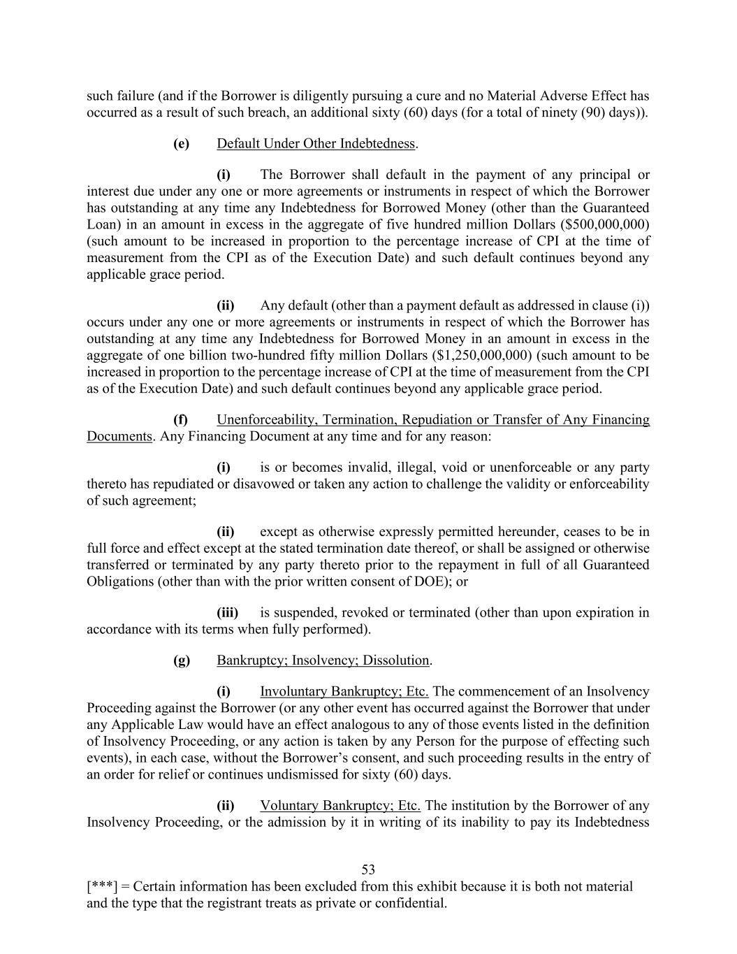 53 [***] = Certain information has been excluded from this exhibit because it is both not material and the type that the registrant treats as private or confidential. such failure (and if the Borrower is diligently pursuing a cure and no Material Adverse Effect has occurred as a result of such breach, an additional sixty (60) days (for a total of ninety (90) days)). (e) Default Under Other Indebtedness. (i) The Borrower shall default in the payment of any principal or interest due under any one or more agreements or instruments in respect of which the Borrower has outstanding at any time any Indebtedness for Borrowed Money (other than the Guaranteed Loan) in an amount in excess in the aggregate of five hundred million Dollars ($500,000,000) (such amount to be increased in proportion to the percentage increase of CPI at the time of measurement from the CPI as of the Execution Date) and such default continues beyond any applicable grace period. (ii) Any default (other than a payment default as addressed in clause (i)) occurs under any one or more agreements or instruments in respect of which the Borrower has outstanding at any time any Indebtedness for Borrowed Money in an amount in excess in the aggregate of one billion two-hundred fifty million Dollars ($1,250,000,000) (such amount to be increased in proportion to the percentage increase of CPI at the time of measurement from the CPI as of the Execution Date) and such default continues beyond any applicable grace period. (f) Unenforceability, Termination, Repudiation or Transfer of Any Financing Documents. Any Financing Document at any time and for any reason: (i) is or becomes invalid, illegal, void or unenforceable or any party thereto has repudiated or disavowed or taken any action to challenge the validity or enforceability of such agreement; (ii) except as otherwise expressly permitted hereunder, ceases to be in full force and effect except at the stated termination date thereof, or shall be assigned or otherwise transferred or terminated by any party thereto prior to the repayment in full of all Guaranteed Obligations (other than with the prior written consent of DOE); or (iii) is suspended, revoked or terminated (other than upon expiration in accordance with its terms when fully performed). (g) Bankruptcy; Insolvency; Dissolution. (i) Involuntary Bankruptcy; Etc. The commencement of an Insolvency Proceeding against the Borrower (or any other event has occurred against the Borrower that under any Applicable Law would have an effect analogous to any of those events listed in the definition of Insolvency Proceeding, or any action is taken by any Person for the purpose of effecting such events), in each case, without the Borrower’s consent, and such proceeding results in the entry of an order for relief or continues undismissed for sixty (60) days. (ii) Voluntary Bankruptcy; Etc. The institution by the Borrower of any Insolvency Proceeding, or the admission by it in writing of its inability to pay its Indebtedness
