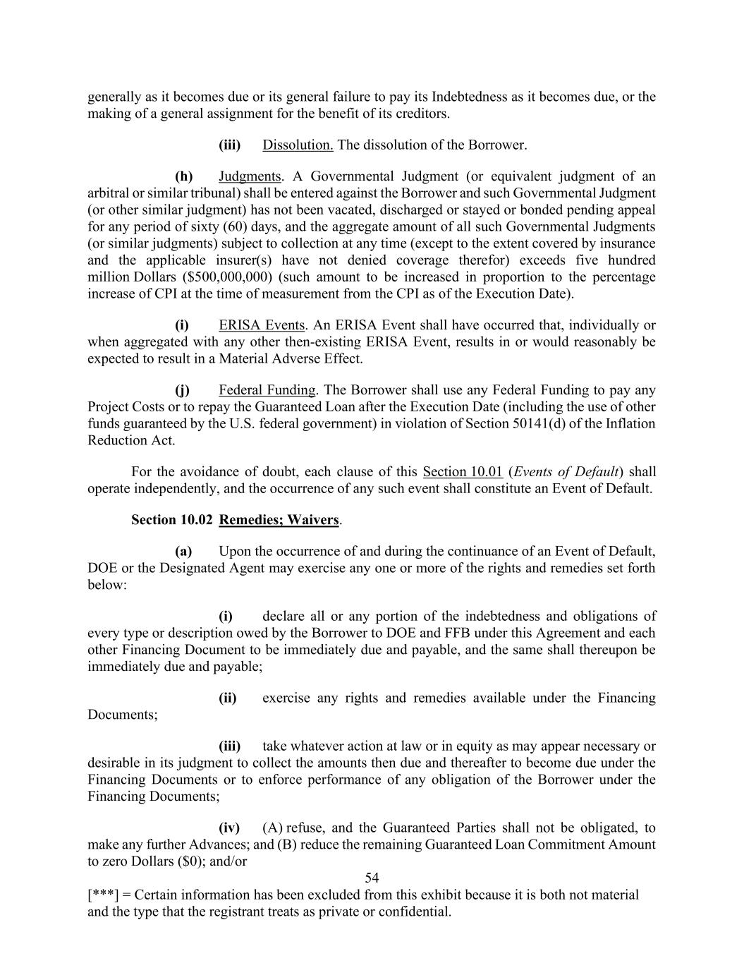 54 [***] = Certain information has been excluded from this exhibit because it is both not material and the type that the registrant treats as private or confidential. generally as it becomes due or its general failure to pay its Indebtedness as it becomes due, or the making of a general assignment for the benefit of its creditors. (iii) Dissolution. The dissolution of the Borrower. (h) Judgments. A Governmental Judgment (or equivalent judgment of an arbitral or similar tribunal) shall be entered against the Borrower and such Governmental Judgment (or other similar judgment) has not been vacated, discharged or stayed or bonded pending appeal for any period of sixty (60) days, and the aggregate amount of all such Governmental Judgments (or similar judgments) subject to collection at any time (except to the extent covered by insurance and the applicable insurer(s) have not denied coverage therefor) exceeds five hundred million Dollars ($500,000,000) (such amount to be increased in proportion to the percentage increase of CPI at the time of measurement from the CPI as of the Execution Date). (i) ERISA Events. An ERISA Event shall have occurred that, individually or when aggregated with any other then-existing ERISA Event, results in or would reasonably be expected to result in a Material Adverse Effect. (j) Federal Funding. The Borrower shall use any Federal Funding to pay any Project Costs or to repay the Guaranteed Loan after the Execution Date (including the use of other funds guaranteed by the U.S. federal government) in violation of Section 50141(d) of the Inflation Reduction Act. For the avoidance of doubt, each clause of this Section 10.01 (Events of Default) shall operate independently, and the occurrence of any such event shall constitute an Event of Default. Section 10.02 Remedies; Waivers. (a) Upon the occurrence of and during the continuance of an Event of Default, DOE or the Designated Agent may exercise any one or more of the rights and remedies set forth below: (i) declare all or any portion of the indebtedness and obligations of every type or description owed by the Borrower to DOE and FFB under this Agreement and each other Financing Document to be immediately due and payable, and the same shall thereupon be immediately due and payable; (ii) exercise any rights and remedies available under the Financing Documents; (iii) take whatever action at law or in equity as may appear necessary or desirable in its judgment to collect the amounts then due and thereafter to become due under the Financing Documents or to enforce performance of any obligation of the Borrower under the Financing Documents; (iv) (A) refuse, and the Guaranteed Parties shall not be obligated, to make any further Advances; and (B) reduce the remaining Guaranteed Loan Commitment Amount to zero Dollars ($0); and/or