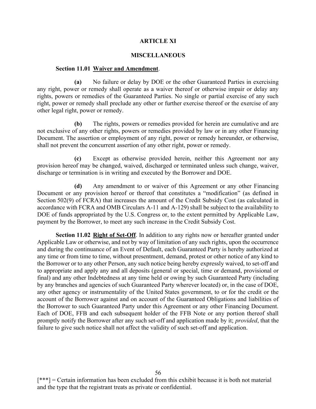 56 [***] = Certain information has been excluded from this exhibit because it is both not material and the type that the registrant treats as private or confidential. ARTICLE XI MISCELLANEOUS Section 11.01 Waiver and Amendment. (a) No failure or delay by DOE or the other Guaranteed Parties in exercising any right, power or remedy shall operate as a waiver thereof or otherwise impair or delay any rights, powers or remedies of the Guaranteed Parties. No single or partial exercise of any such right, power or remedy shall preclude any other or further exercise thereof or the exercise of any other legal right, power or remedy. (b) The rights, powers or remedies provided for herein are cumulative and are not exclusive of any other rights, powers or remedies provided by law or in any other Financing Document. The assertion or employment of any right, power or remedy hereunder, or otherwise, shall not prevent the concurrent assertion of any other right, power or remedy. (c) Except as otherwise provided herein, neither this Agreement nor any provision hereof may be changed, waived, discharged or terminated unless such change, waiver, discharge or termination is in writing and executed by the Borrower and DOE. (d) Any amendment to or waiver of this Agreement or any other Financing Document or any provision hereof or thereof that constitutes a “modification” (as defined in Section 502(9) of FCRA) that increases the amount of the Credit Subsidy Cost (as calculated in accordance with FCRA and OMB Circulars A-11 and A-129) shall be subject to the availability to DOE of funds appropriated by the U.S. Congress or, to the extent permitted by Applicable Law, payment by the Borrower, to meet any such increase in the Credit Subsidy Cost. Section 11.02 Right of Set-Off. In addition to any rights now or hereafter granted under Applicable Law or otherwise, and not by way of limitation of any such rights, upon the occurrence and during the continuance of an Event of Default, each Guaranteed Party is hereby authorized at any time or from time to time, without presentment, demand, protest or other notice of any kind to the Borrower or to any other Person, any such notice being hereby expressly waived, to set-off and to appropriate and apply any and all deposits (general or special, time or demand, provisional or final) and any other Indebtedness at any time held or owing by such Guaranteed Party (including by any branches and agencies of such Guaranteed Party wherever located) or, in the case of DOE, any other agency or instrumentality of the United States government, to or for the credit or the account of the Borrower against and on account of the Guaranteed Obligations and liabilities of the Borrower to such Guaranteed Party under this Agreement or any other Financing Document. Each of DOE, FFB and each subsequent holder of the FFB Note or any portion thereof shall promptly notify the Borrower after any such set-off and application made by it; provided, that the failure to give such notice shall not affect the validity of such set-off and application.