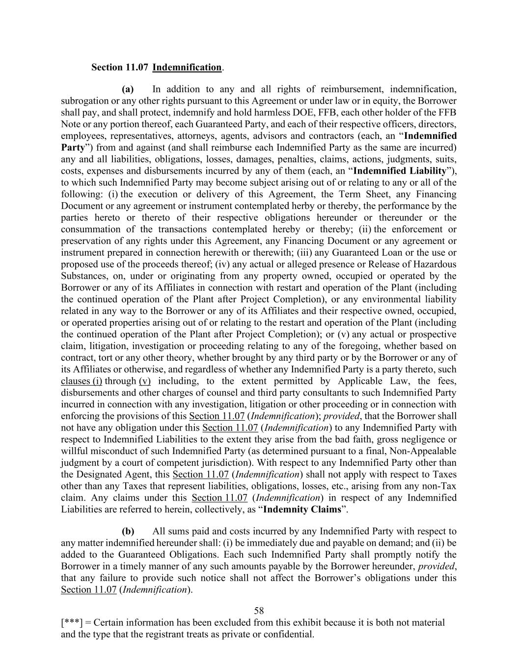 58 [***] = Certain information has been excluded from this exhibit because it is both not material and the type that the registrant treats as private or confidential. Section 11.07 Indemnification. (a) In addition to any and all rights of reimbursement, indemnification, subrogation or any other rights pursuant to this Agreement or under law or in equity, the Borrower shall pay, and shall protect, indemnify and hold harmless DOE, FFB, each other holder of the FFB Note or any portion thereof, each Guaranteed Party, and each of their respective officers, directors, employees, representatives, attorneys, agents, advisors and contractors (each, an “Indemnified Party”) from and against (and shall reimburse each Indemnified Party as the same are incurred) any and all liabilities, obligations, losses, damages, penalties, claims, actions, judgments, suits, costs, expenses and disbursements incurred by any of them (each, an “Indemnified Liability”), to which such Indemnified Party may become subject arising out of or relating to any or all of the following: (i) the execution or delivery of this Agreement, the Term Sheet, any Financing Document or any agreement or instrument contemplated herby or thereby, the performance by the parties hereto or thereto of their respective obligations hereunder or thereunder or the consummation of the transactions contemplated hereby or thereby; (ii) the enforcement or preservation of any rights under this Agreement, any Financing Document or any agreement or instrument prepared in connection herewith or therewith; (iii) any Guaranteed Loan or the use or proposed use of the proceeds thereof; (iv) any actual or alleged presence or Release of Hazardous Substances, on, under or originating from any property owned, occupied or operated by the Borrower or any of its Affiliates in connection with restart and operation of the Plant (including the continued operation of the Plant after Project Completion), or any environmental liability related in any way to the Borrower or any of its Affiliates and their respective owned, occupied, or operated properties arising out of or relating to the restart and operation of the Plant (including the continued operation of the Plant after Project Completion); or (v) any actual or prospective claim, litigation, investigation or proceeding relating to any of the foregoing, whether based on contract, tort or any other theory, whether brought by any third party or by the Borrower or any of its Affiliates or otherwise, and regardless of whether any Indemnified Party is a party thereto, such clauses (i) through (v) including, to the extent permitted by Applicable Law, the fees, disbursements and other charges of counsel and third party consultants to such Indemnified Party incurred in connection with any investigation, litigation or other proceeding or in connection with enforcing the provisions of this Section 11.07 (Indemnification); provided, that the Borrower shall not have any obligation under this Section 11.07 (Indemnification) to any Indemnified Party with respect to Indemnified Liabilities to the extent they arise from the bad faith, gross negligence or willful misconduct of such Indemnified Party (as determined pursuant to a final, Non-Appealable judgment by a court of competent jurisdiction). With respect to any Indemnified Party other than the Designated Agent, this Section 11.07 (Indemnification) shall not apply with respect to Taxes other than any Taxes that represent liabilities, obligations, losses, etc., arising from any non-Tax claim. Any claims under this Section 11.07 (Indemnification) in respect of any Indemnified Liabilities are referred to herein, collectively, as “Indemnity Claims”. (b) All sums paid and costs incurred by any Indemnified Party with respect to any matter indemnified hereunder shall: (i) be immediately due and payable on demand; and (ii) be added to the Guaranteed Obligations. Each such Indemnified Party shall promptly notify the Borrower in a timely manner of any such amounts payable by the Borrower hereunder, provided, that any failure to provide such notice shall not affect the Borrower’s obligations under this Section 11.07 (Indemnification).