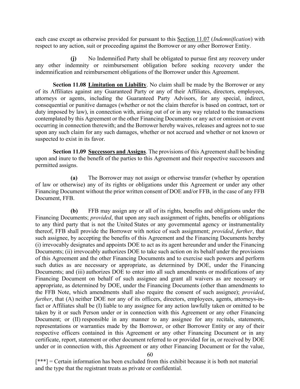 60 [***] = Certain information has been excluded from this exhibit because it is both not material and the type that the registrant treats as private or confidential. each case except as otherwise provided for pursuant to this Section 11.07 (Indemnification) with respect to any action, suit or proceeding against the Borrower or any other Borrower Entity. (j) No Indemnified Party shall be obligated to pursue first any recovery under any other indemnity or reimbursement obligation before seeking recovery under the indemnification and reimbursement obligations of the Borrower under this Agreement. Section 11.08 Limitation on Liability. No claim shall be made by the Borrower or any of its Affiliates against any Guaranteed Party or any of their Affiliates, directors, employees, attorneys or agents, including the Guaranteed Party Advisors, for any special, indirect, consequential or punitive damages (whether or not the claim therefor is based on contract, tort or duty imposed by law), in connection with, arising out of or in any way related to the transactions contemplated by this Agreement or the other Financing Documents or any act or omission or event occurring in connection therewith; and the Borrower hereby waives, releases and agrees not to sue upon any such claim for any such damages, whether or not accrued and whether or not known or suspected to exist in its favor. Section 11.09 Successors and Assigns. The provisions of this Agreement shall be binding upon and inure to the benefit of the parties to this Agreement and their respective successors and permitted assigns. (a) The Borrower may not assign or otherwise transfer (whether by operation of law or otherwise) any of its rights or obligations under this Agreement or under any other Financing Document without the prior written consent of DOE and/or FFB, in the case of any FFB Document, FFB. (b) FFB may assign any or all of its rights, benefits and obligations under the Financing Documents; provided, that upon any such assignment of rights, benefits or obligations to any third party that is not the United States or any governmental agency or instrumentality thereof, FFB shall provide the Borrower with notice of such assignment; provided, further, that such assignee, by accepting the benefits of this Agreement and the Financing Documents hereby (i) irrevocably designates and appoints DOE to act as its agent hereunder and under the Financing Documents; (ii) irrevocably authorizes DOE to take such action on its behalf under the provisions of this Agreement and the other Financing Documents and to exercise such powers and perform such duties as are necessary or appropriate, as determined by DOE, under the Financing Documents; and (iii) authorizes DOE to enter into all such amendments or modifications of any Financing Document on behalf of such assignee and grant all waivers as are necessary or appropriate, as determined by DOE, under the Financing Documents (other than amendments to the FFB Note, which amendments shall also require the consent of such assignee); provided, further, that (A) neither DOE nor any of its officers, directors, employees, agents, attorneys-in- fact or Affiliates shall be (I) liable to any assignee for any action lawfully taken or omitted to be taken by it or such Person under or in connection with this Agreement or any other Financing Document; or (II) responsible in any manner to any assignee for any recitals, statements, representations or warranties made by the Borrower, or other Borrower Entity or any of their respective officers contained in this Agreement or any other Financing Document or in any certificate, report, statement or other document referred to or provided for in, or received by DOE under or in connection with, this Agreement or any other Financing Document or for the value,