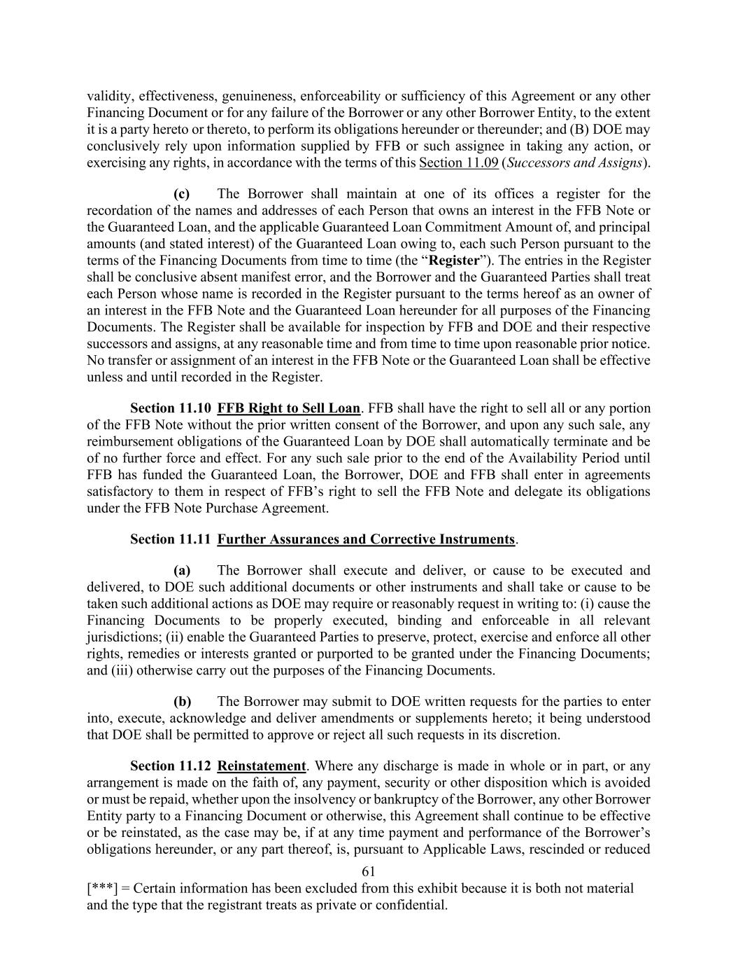 61 [***] = Certain information has been excluded from this exhibit because it is both not material and the type that the registrant treats as private or confidential. validity, effectiveness, genuineness, enforceability or sufficiency of this Agreement or any other Financing Document or for any failure of the Borrower or any other Borrower Entity, to the extent it is a party hereto or thereto, to perform its obligations hereunder or thereunder; and (B) DOE may conclusively rely upon information supplied by FFB or such assignee in taking any action, or exercising any rights, in accordance with the terms of this Section 11.09 (Successors and Assigns). (c) The Borrower shall maintain at one of its offices a register for the recordation of the names and addresses of each Person that owns an interest in the FFB Note or the Guaranteed Loan, and the applicable Guaranteed Loan Commitment Amount of, and principal amounts (and stated interest) of the Guaranteed Loan owing to, each such Person pursuant to the terms of the Financing Documents from time to time (the “Register”). The entries in the Register shall be conclusive absent manifest error, and the Borrower and the Guaranteed Parties shall treat each Person whose name is recorded in the Register pursuant to the terms hereof as an owner of an interest in the FFB Note and the Guaranteed Loan hereunder for all purposes of the Financing Documents. The Register shall be available for inspection by FFB and DOE and their respective successors and assigns, at any reasonable time and from time to time upon reasonable prior notice. No transfer or assignment of an interest in the FFB Note or the Guaranteed Loan shall be effective unless and until recorded in the Register. Section 11.10 FFB Right to Sell Loan. FFB shall have the right to sell all or any portion of the FFB Note without the prior written consent of the Borrower, and upon any such sale, any reimbursement obligations of the Guaranteed Loan by DOE shall automatically terminate and be of no further force and effect. For any such sale prior to the end of the Availability Period until FFB has funded the Guaranteed Loan, the Borrower, DOE and FFB shall enter in agreements satisfactory to them in respect of FFB’s right to sell the FFB Note and delegate its obligations under the FFB Note Purchase Agreement. Section 11.11 Further Assurances and Corrective Instruments. (a) The Borrower shall execute and deliver, or cause to be executed and delivered, to DOE such additional documents or other instruments and shall take or cause to be taken such additional actions as DOE may require or reasonably request in writing to: (i) cause the Financing Documents to be properly executed, binding and enforceable in all relevant jurisdictions; (ii) enable the Guaranteed Parties to preserve, protect, exercise and enforce all other rights, remedies or interests granted or purported to be granted under the Financing Documents; and (iii) otherwise carry out the purposes of the Financing Documents. (b) The Borrower may submit to DOE written requests for the parties to enter into, execute, acknowledge and deliver amendments or supplements hereto; it being understood that DOE shall be permitted to approve or reject all such requests in its discretion. Section 11.12 Reinstatement. Where any discharge is made in whole or in part, or any arrangement is made on the faith of, any payment, security or other disposition which is avoided or must be repaid, whether upon the insolvency or bankruptcy of the Borrower, any other Borrower Entity party to a Financing Document or otherwise, this Agreement shall continue to be effective or be reinstated, as the case may be, if at any time payment and performance of the Borrower’s obligations hereunder, or any part thereof, is, pursuant to Applicable Laws, rescinded or reduced