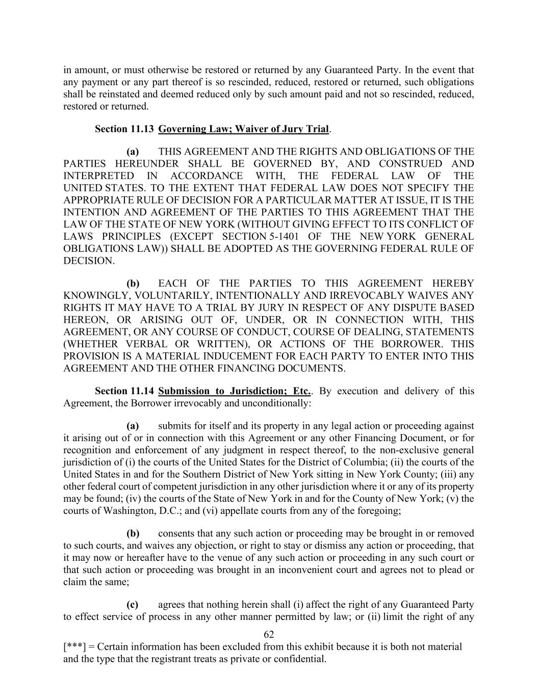 62 [***] = Certain information has been excluded from this exhibit because it is both not material and the type that the registrant treats as private or confidential. in amount, or must otherwise be restored or returned by any Guaranteed Party. In the event that any payment or any part thereof is so rescinded, reduced, restored or returned, such obligations shall be reinstated and deemed reduced only by such amount paid and not so rescinded, reduced, restored or returned. Section 11.13 Governing Law; Waiver of Jury Trial. (a) THIS AGREEMENT AND THE RIGHTS AND OBLIGATIONS OF THE PARTIES HEREUNDER SHALL BE GOVERNED BY, AND CONSTRUED AND INTERPRETED IN ACCORDANCE WITH, THE FEDERAL LAW OF THE UNITED STATES. TO THE EXTENT THAT FEDERAL LAW DOES NOT SPECIFY THE APPROPRIATE RULE OF DECISION FOR A PARTICULAR MATTER AT ISSUE, IT IS THE INTENTION AND AGREEMENT OF THE PARTIES TO THIS AGREEMENT THAT THE LAW OF THE STATE OF NEW YORK (WITHOUT GIVING EFFECT TO ITS CONFLICT OF LAWS PRINCIPLES (EXCEPT SECTION 5-1401 OF THE NEW YORK GENERAL OBLIGATIONS LAW)) SHALL BE ADOPTED AS THE GOVERNING FEDERAL RULE OF DECISION. (b) EACH OF THE PARTIES TO THIS AGREEMENT HEREBY KNOWINGLY, VOLUNTARILY, INTENTIONALLY AND IRREVOCABLY WAIVES ANY RIGHTS IT MAY HAVE TO A TRIAL BY JURY IN RESPECT OF ANY DISPUTE BASED HEREON, OR ARISING OUT OF, UNDER, OR IN CONNECTION WITH, THIS AGREEMENT, OR ANY COURSE OF CONDUCT, COURSE OF DEALING, STATEMENTS (WHETHER VERBAL OR WRITTEN), OR ACTIONS OF THE BORROWER. THIS PROVISION IS A MATERIAL INDUCEMENT FOR EACH PARTY TO ENTER INTO THIS AGREEMENT AND THE OTHER FINANCING DOCUMENTS. Section 11.14 Submission to Jurisdiction; Etc.. By execution and delivery of this Agreement, the Borrower irrevocably and unconditionally: (a) submits for itself and its property in any legal action or proceeding against it arising out of or in connection with this Agreement or any other Financing Document, or for recognition and enforcement of any judgment in respect thereof, to the non-exclusive general jurisdiction of (i) the courts of the United States for the District of Columbia; (ii) the courts of the United States in and for the Southern District of New York sitting in New York County; (iii) any other federal court of competent jurisdiction in any other jurisdiction where it or any of its property may be found; (iv) the courts of the State of New York in and for the County of New York; (v) the courts of Washington, D.C.; and (vi) appellate courts from any of the foregoing; (b) consents that any such action or proceeding may be brought in or removed to such courts, and waives any objection, or right to stay or dismiss any action or proceeding, that it may now or hereafter have to the venue of any such action or proceeding in any such court or that such action or proceeding was brought in an inconvenient court and agrees not to plead or claim the same; (c) agrees that nothing herein shall (i) affect the right of any Guaranteed Party to effect service of process in any other manner permitted by law; or (ii) limit the right of any