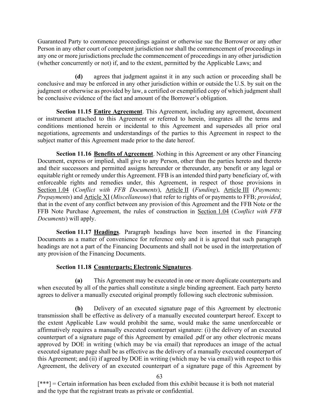 63 [***] = Certain information has been excluded from this exhibit because it is both not material and the type that the registrant treats as private or confidential. Guaranteed Party to commence proceedings against or otherwise sue the Borrower or any other Person in any other court of competent jurisdiction nor shall the commencement of proceedings in any one or more jurisdictions preclude the commencement of proceedings in any other jurisdiction (whether concurrently or not) if, and to the extent, permitted by the Applicable Laws; and (d) agrees that judgment against it in any such action or proceeding shall be conclusive and may be enforced in any other jurisdiction within or outside the U.S. by suit on the judgment or otherwise as provided by law, a certified or exemplified copy of which judgment shall be conclusive evidence of the fact and amount of the Borrower’s obligation. Section 11.15 Entire Agreement. This Agreement, including any agreement, document or instrument attached to this Agreement or referred to herein, integrates all the terms and conditions mentioned herein or incidental to this Agreement and supersedes all prior oral negotiations, agreements and understandings of the parties to this Agreement in respect to the subject matter of this Agreement made prior to the date hereof. Section 11.16 Benefits of Agreement. Nothing in this Agreement or any other Financing Document, express or implied, shall give to any Person, other than the parties hereto and thereto and their successors and permitted assigns hereunder or thereunder, any benefit or any legal or equitable right or remedy under this Agreement. FFB is an intended third party beneficiary of, with enforceable rights and remedies under, this Agreement, in respect of those provisions in Section 1.04 (Conflict with FFB Documents), Article II (Funding), Article III (Payments; Prepayments) and Article XI (Miscellaneous) that refer to rights of or payments to FFB; provided, that in the event of any conflict between any provision of this Agreement and the FFB Note or the FFB Note Purchase Agreement, the rules of construction in Section 1.04 (Conflict with FFB Documents) will apply. Section 11.17 Headings. Paragraph headings have been inserted in the Financing Documents as a matter of convenience for reference only and it is agreed that such paragraph headings are not a part of the Financing Documents and shall not be used in the interpretation of any provision of the Financing Documents. Section 11.18 Counterparts; Electronic Signatures. (a) This Agreement may be executed in one or more duplicate counterparts and when executed by all of the parties shall constitute a single binding agreement. Each party hereto agrees to deliver a manually executed original promptly following such electronic submission. (b) Delivery of an executed signature page of this Agreement by electronic transmission shall be effective as delivery of a manually executed counterpart hereof. Except to the extent Applicable Law would prohibit the same, would make the same unenforceable or affirmatively requires a manually executed counterpart signature: (i) the delivery of an executed counterpart of a signature page of this Agreement by emailed .pdf or any other electronic means approved by DOE in writing (which may be via email) that reproduces an image of the actual executed signature page shall be as effective as the delivery of a manually executed counterpart of this Agreement; and (ii) if agreed by DOE in writing (which may be via email) with respect to this Agreement, the delivery of an executed counterpart of a signature page of this Agreement by