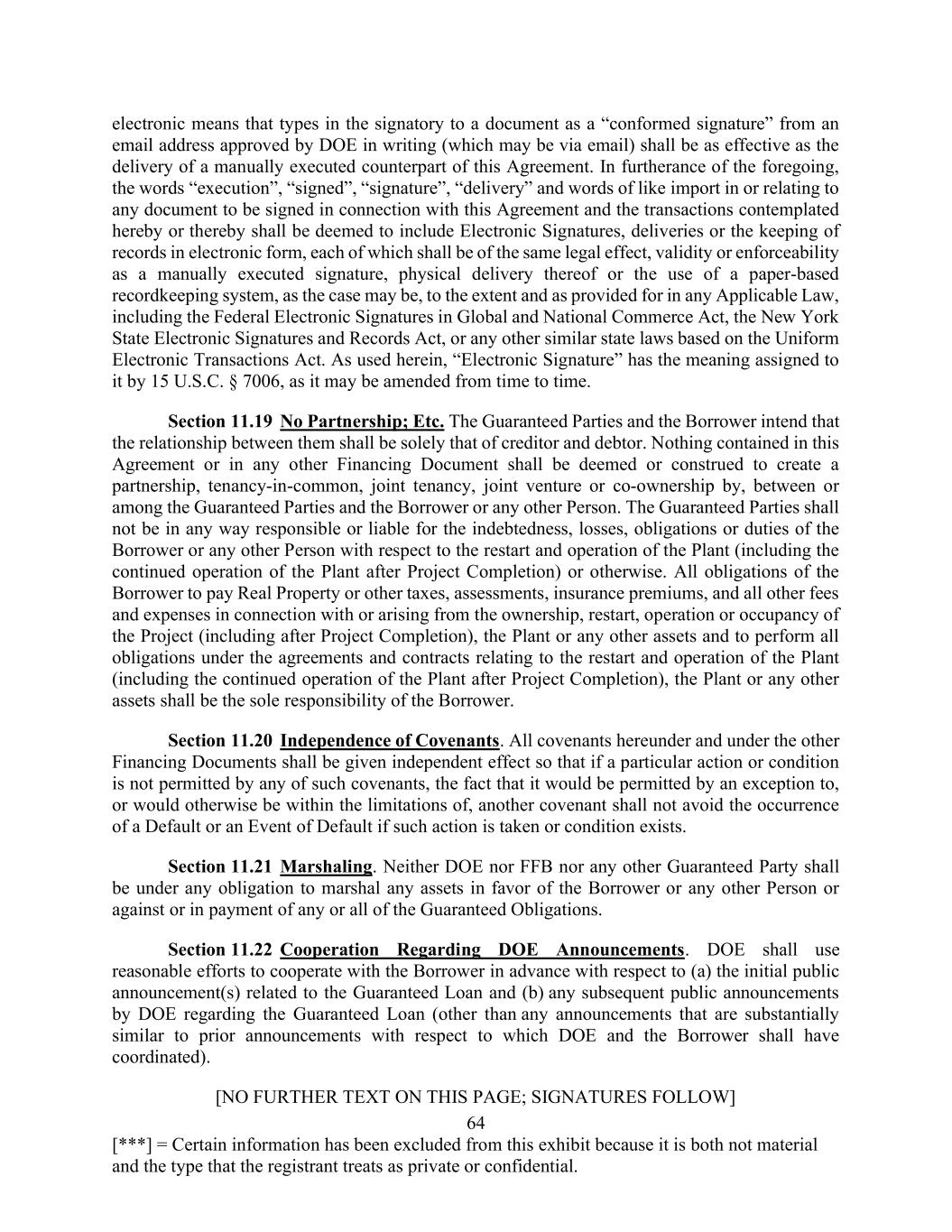 64 [***] = Certain information has been excluded from this exhibit because it is both not material and the type that the registrant treats as private or confidential. electronic means that types in the signatory to a document as a “conformed signature” from an email address approved by DOE in writing (which may be via email) shall be as effective as the delivery of a manually executed counterpart of this Agreement. In furtherance of the foregoing, the words “execution”, “signed”, “signature”, “delivery” and words of like import in or relating to any document to be signed in connection with this Agreement and the transactions contemplated hereby or thereby shall be deemed to include Electronic Signatures, deliveries or the keeping of records in electronic form, each of which shall be of the same legal effect, validity or enforceability as a manually executed signature, physical delivery thereof or the use of a paper-based recordkeeping system, as the case may be, to the extent and as provided for in any Applicable Law, including the Federal Electronic Signatures in Global and National Commerce Act, the New York State Electronic Signatures and Records Act, or any other similar state laws based on the Uniform Electronic Transactions Act. As used herein, “Electronic Signature” has the meaning assigned to it by 15 U.S.C. § 7006, as it may be amended from time to time. Section 11.19 No Partnership; Etc. The Guaranteed Parties and the Borrower intend that the relationship between them shall be solely that of creditor and debtor. Nothing contained in this Agreement or in any other Financing Document shall be deemed or construed to create a partnership, tenancy-in-common, joint tenancy, joint venture or co-ownership by, between or among the Guaranteed Parties and the Borrower or any other Person. The Guaranteed Parties shall not be in any way responsible or liable for the indebtedness, losses, obligations or duties of the Borrower or any other Person with respect to the restart and operation of the Plant (including the continued operation of the Plant after Project Completion) or otherwise. All obligations of the Borrower to pay Real Property or other taxes, assessments, insurance premiums, and all other fees and expenses in connection with or arising from the ownership, restart, operation or occupancy of the Project (including after Project Completion), the Plant or any other assets and to perform all obligations under the agreements and contracts relating to the restart and operation of the Plant (including the continued operation of the Plant after Project Completion), the Plant or any other assets shall be the sole responsibility of the Borrower. Section 11.20 Independence of Covenants. All covenants hereunder and under the other Financing Documents shall be given independent effect so that if a particular action or condition is not permitted by any of such covenants, the fact that it would be permitted by an exception to, or would otherwise be within the limitations of, another covenant shall not avoid the occurrence of a Default or an Event of Default if such action is taken or condition exists. Section 11.21 Marshaling. Neither DOE nor FFB nor any other Guaranteed Party shall be under any obligation to marshal any assets in favor of the Borrower or any other Person or against or in payment of any or all of the Guaranteed Obligations. Section 11.22 Cooperation Regarding DOE Announcements. DOE shall use reasonable efforts to cooperate with the Borrower in advance with respect to (a) the initial public announcement(s) related to the Guaranteed Loan and (b) any subsequent public announcements by DOE regarding the Guaranteed Loan (other than any announcements that are substantially similar to prior announcements with respect to which DOE and the Borrower shall have coordinated). [NO FURTHER TEXT ON THIS PAGE; SIGNATURES FOLLOW]