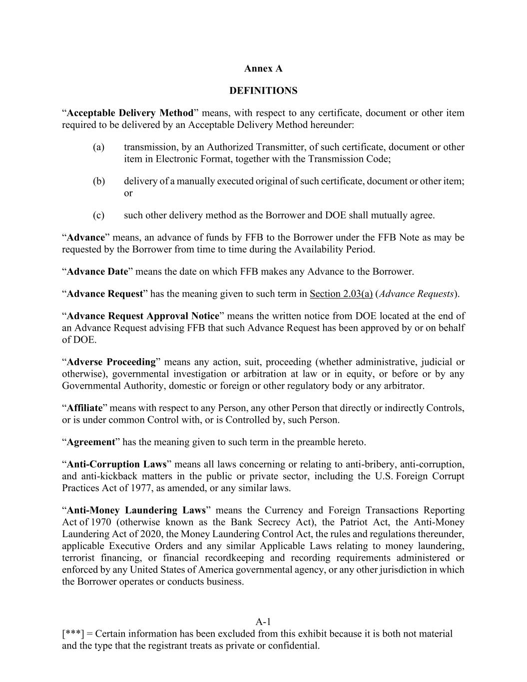 A-1 [***] = Certain information has been excluded from this exhibit because it is both not material and the type that the registrant treats as private or confidential. Annex A DEFINITIONS “Acceptable Delivery Method” means, with respect to any certificate, document or other item required to be delivered by an Acceptable Delivery Method hereunder: (a) transmission, by an Authorized Transmitter, of such certificate, document or other item in Electronic Format, together with the Transmission Code; (b) delivery of a manually executed original of such certificate, document or other item; or (c) such other delivery method as the Borrower and DOE shall mutually agree. “Advance” means, an advance of funds by FFB to the Borrower under the FFB Note as may be requested by the Borrower from time to time during the Availability Period. “Advance Date” means the date on which FFB makes any Advance to the Borrower. “Advance Request” has the meaning given to such term in Section 2.03(a) (Advance Requests). “Advance Request Approval Notice” means the written notice from DOE located at the end of an Advance Request advising FFB that such Advance Request has been approved by or on behalf of DOE. “Adverse Proceeding” means any action, suit, proceeding (whether administrative, judicial or otherwise), governmental investigation or arbitration at law or in equity, or before or by any Governmental Authority, domestic or foreign or other regulatory body or any arbitrator. “Affiliate” means with respect to any Person, any other Person that directly or indirectly Controls, or is under common Control with, or is Controlled by, such Person. “Agreement” has the meaning given to such term in the preamble hereto. “Anti-Corruption Laws” means all laws concerning or relating to anti-bribery, anti-corruption, and anti-kickback matters in the public or private sector, including the U.S. Foreign Corrupt Practices Act of 1977, as amended, or any similar laws. “Anti-Money Laundering Laws” means the Currency and Foreign Transactions Reporting Act of 1970 (otherwise known as the Bank Secrecy Act), the Patriot Act, the Anti-Money Laundering Act of 2020, the Money Laundering Control Act, the rules and regulations thereunder, applicable Executive Orders and any similar Applicable Laws relating to money laundering, terrorist financing, or financial recordkeeping and recording requirements administered or enforced by any United States of America governmental agency, or any other jurisdiction in which the Borrower operates or conducts business.