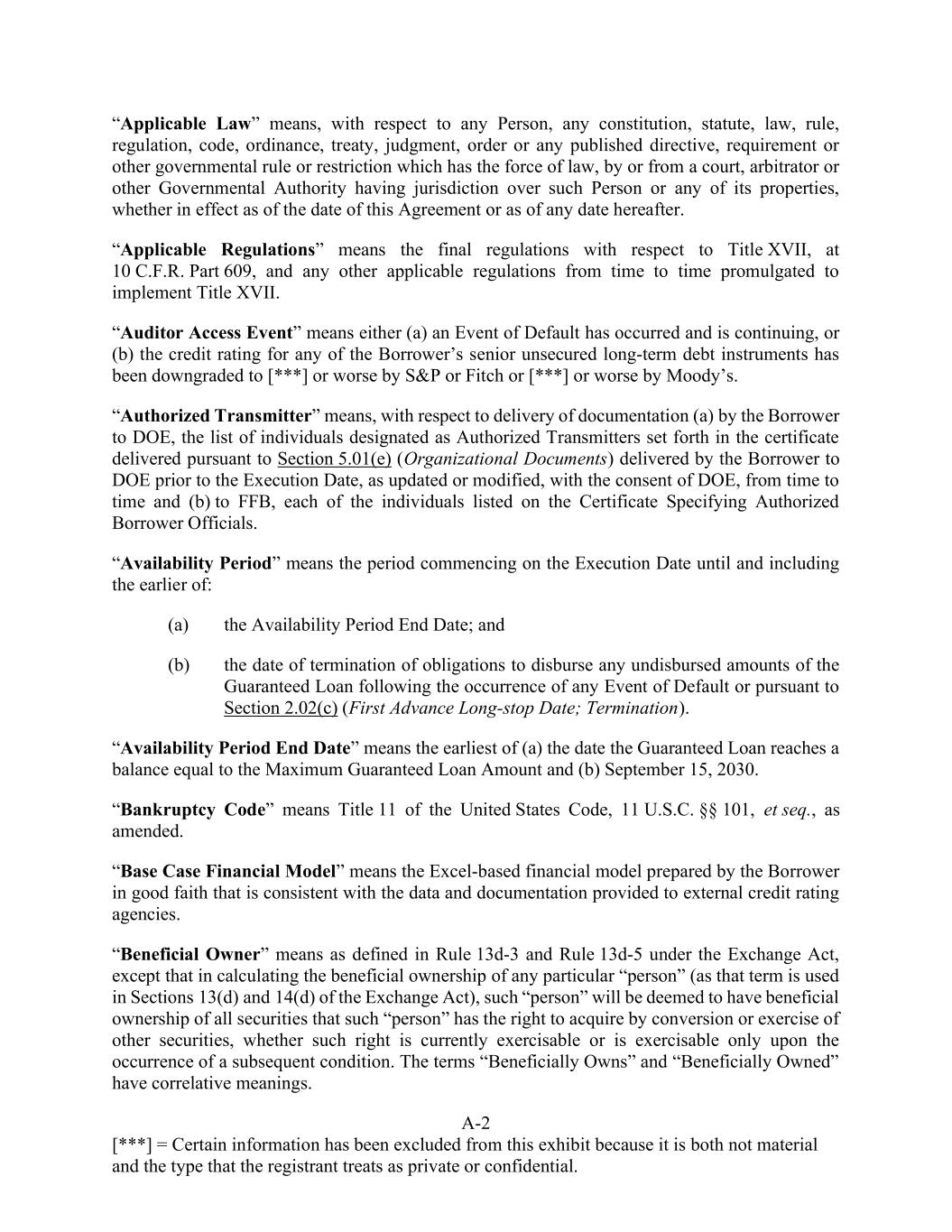 A-2 [***] = Certain information has been excluded from this exhibit because it is both not material and the type that the registrant treats as private or confidential. “Applicable Law” means, with respect to any Person, any constitution, statute, law, rule, regulation, code, ordinance, treaty, judgment, order or any published directive, requirement or other governmental rule or restriction which has the force of law, by or from a court, arbitrator or other Governmental Authority having jurisdiction over such Person or any of its properties, whether in effect as of the date of this Agreement or as of any date hereafter. “Applicable Regulations” means the final regulations with respect to Title XVII, at 10 C.F.R. Part 609, and any other applicable regulations from time to time promulgated to implement Title XVII. “Auditor Access Event” means either (a) an Event of Default has occurred and is continuing, or (b) the credit rating for any of the Borrower’s senior unsecured long-term debt instruments has been downgraded to [***] or worse by S&P or Fitch or [***] or worse by Moody’s. “Authorized Transmitter” means, with respect to delivery of documentation (a) by the Borrower to DOE, the list of individuals designated as Authorized Transmitters set forth in the certificate delivered pursuant to Section 5.01(e) (Organizational Documents) delivered by the Borrower to DOE prior to the Execution Date, as updated or modified, with the consent of DOE, from time to time and (b) to FFB, each of the individuals listed on the Certificate Specifying Authorized Borrower Officials. “Availability Period” means the period commencing on the Execution Date until and including the earlier of: (a) the Availability Period End Date; and (b) the date of termination of obligations to disburse any undisbursed amounts of the Guaranteed Loan following the occurrence of any Event of Default or pursuant to Section 2.02(c) (First Advance Long-stop Date; Termination). “Availability Period End Date” means the earliest of (a) the date the Guaranteed Loan reaches a balance equal to the Maximum Guaranteed Loan Amount and (b) September 15, 2030. “Bankruptcy Code” means Title 11 of the United States Code, 11 U.S.C. §§ 101, et seq., as amended. “Base Case Financial Model” means the Excel-based financial model prepared by the Borrower in good faith that is consistent with the data and documentation provided to external credit rating agencies. “Beneficial Owner” means as defined in Rule 13d-3 and Rule 13d-5 under the Exchange Act, except that in calculating the beneficial ownership of any particular “person” (as that term is used in Sections 13(d) and 14(d) of the Exchange Act), such “person” will be deemed to have beneficial ownership of all securities that such “person” has the right to acquire by conversion or exercise of other securities, whether such right is currently exercisable or is exercisable only upon the occurrence of a subsequent condition. The terms “Beneficially Owns” and “Beneficially Owned” have correlative meanings.