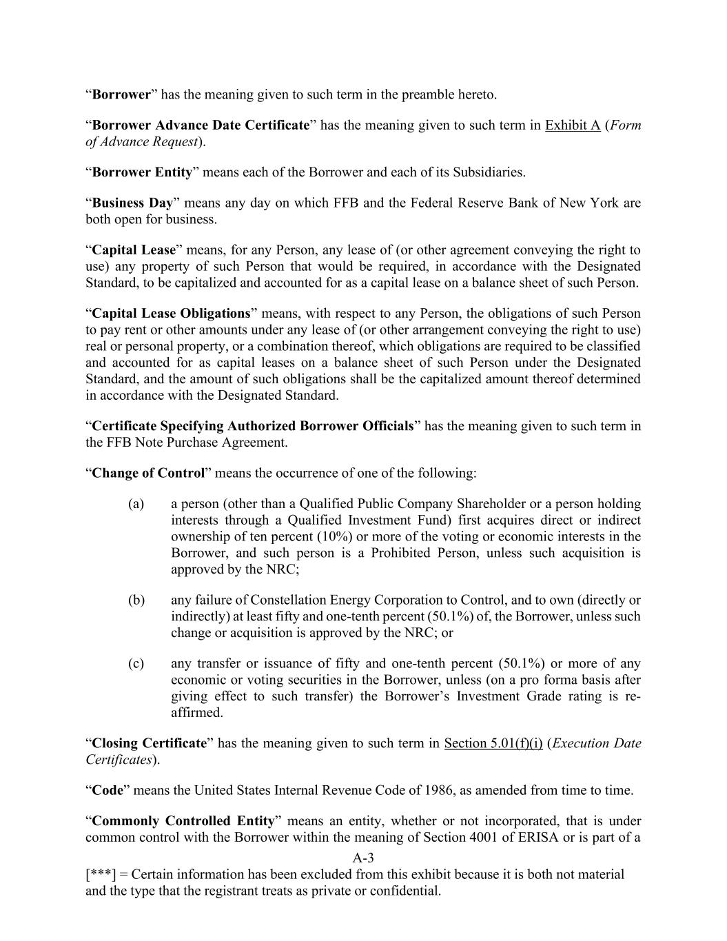A-3 [***] = Certain information has been excluded from this exhibit because it is both not material and the type that the registrant treats as private or confidential. “Borrower” has the meaning given to such term in the preamble hereto. “Borrower Advance Date Certificate” has the meaning given to such term in Exhibit A (Form of Advance Request). “Borrower Entity” means each of the Borrower and each of its Subsidiaries. “Business Day” means any day on which FFB and the Federal Reserve Bank of New York are both open for business. “Capital Lease” means, for any Person, any lease of (or other agreement conveying the right to use) any property of such Person that would be required, in accordance with the Designated Standard, to be capitalized and accounted for as a capital lease on a balance sheet of such Person. “Capital Lease Obligations” means, with respect to any Person, the obligations of such Person to pay rent or other amounts under any lease of (or other arrangement conveying the right to use) real or personal property, or a combination thereof, which obligations are required to be classified and accounted for as capital leases on a balance sheet of such Person under the Designated Standard, and the amount of such obligations shall be the capitalized amount thereof determined in accordance with the Designated Standard. “Certificate Specifying Authorized Borrower Officials” has the meaning given to such term in the FFB Note Purchase Agreement. “Change of Control” means the occurrence of one of the following: (a) a person (other than a Qualified Public Company Shareholder or a person holding interests through a Qualified Investment Fund) first acquires direct or indirect ownership of ten percent (10%) or more of the voting or economic interests in the Borrower, and such person is a Prohibited Person, unless such acquisition is approved by the NRC; (b) any failure of Constellation Energy Corporation to Control, and to own (directly or indirectly) at least fifty and one-tenth percent (50.1%) of, the Borrower, unless such change or acquisition is approved by the NRC; or (c) any transfer or issuance of fifty and one-tenth percent (50.1%) or more of any economic or voting securities in the Borrower, unless (on a pro forma basis after giving effect to such transfer) the Borrower’s Investment Grade rating is re- affirmed. “Closing Certificate” has the meaning given to such term in Section 5.01(f)(i) (Execution Date Certificates). “Code” means the United States Internal Revenue Code of 1986, as amended from time to time. “Commonly Controlled Entity” means an entity, whether or not incorporated, that is under common control with the Borrower within the meaning of Section 4001 of ERISA or is part of a