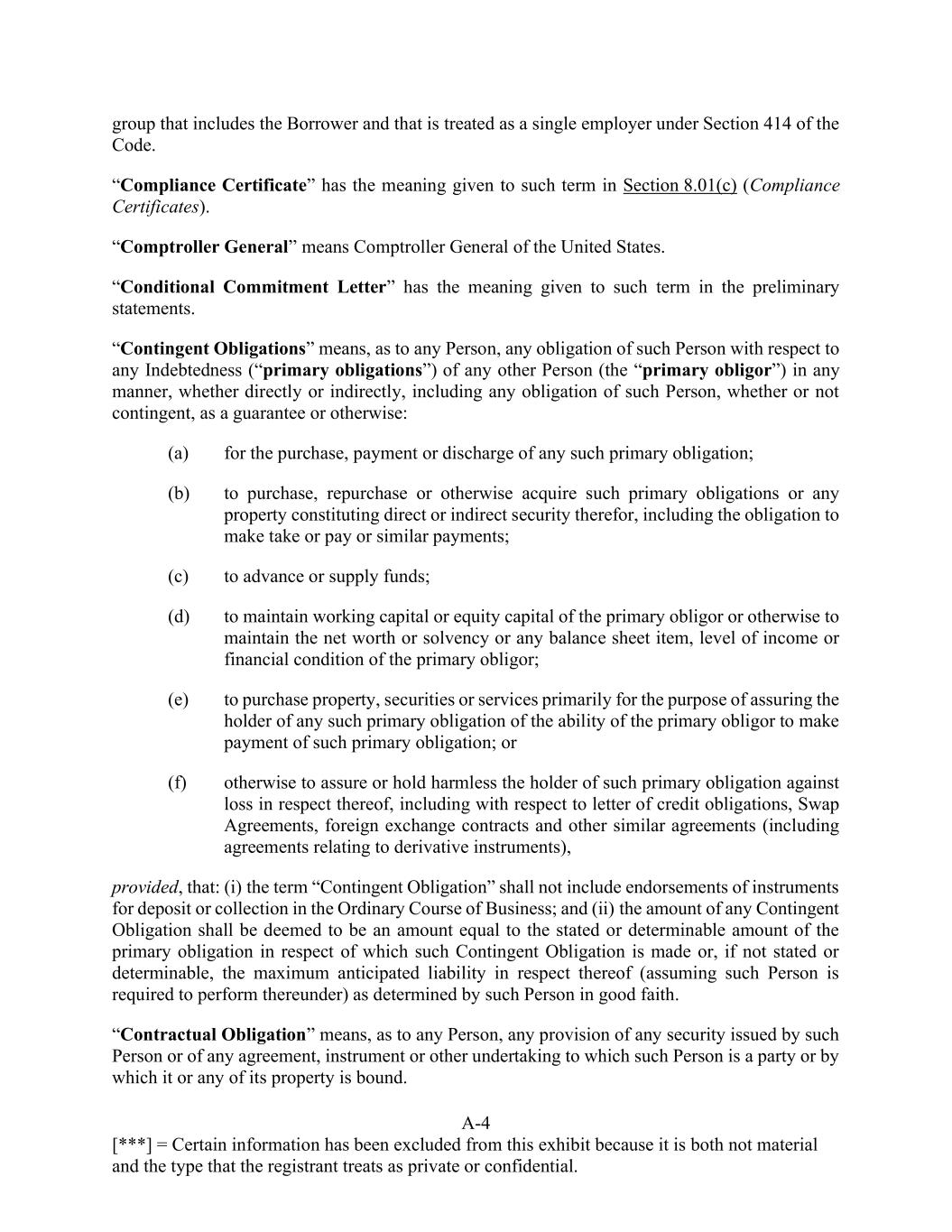 A-4 [***] = Certain information has been excluded from this exhibit because it is both not material and the type that the registrant treats as private or confidential. group that includes the Borrower and that is treated as a single employer under Section 414 of the Code. “Compliance Certificate” has the meaning given to such term in Section 8.01(c) (Compliance Certificates). “Comptroller General” means Comptroller General of the United States. “Conditional Commitment Letter” has the meaning given to such term in the preliminary statements. “Contingent Obligations” means, as to any Person, any obligation of such Person with respect to any Indebtedness (“primary obligations”) of any other Person (the “primary obligor”) in any manner, whether directly or indirectly, including any obligation of such Person, whether or not contingent, as a guarantee or otherwise: (a) for the purchase, payment or discharge of any such primary obligation; (b) to purchase, repurchase or otherwise acquire such primary obligations or any property constituting direct or indirect security therefor, including the obligation to make take or pay or similar payments; (c) to advance or supply funds; (d) to maintain working capital or equity capital of the primary obligor or otherwise to maintain the net worth or solvency or any balance sheet item, level of income or financial condition of the primary obligor; (e) to purchase property, securities or services primarily for the purpose of assuring the holder of any such primary obligation of the ability of the primary obligor to make payment of such primary obligation; or (f) otherwise to assure or hold harmless the holder of such primary obligation against loss in respect thereof, including with respect to letter of credit obligations, Swap Agreements, foreign exchange contracts and other similar agreements (including agreements relating to derivative instruments), provided, that: (i) the term “Contingent Obligation” shall not include endorsements of instruments for deposit or collection in the Ordinary Course of Business; and (ii) the amount of any Contingent Obligation shall be deemed to be an amount equal to the stated or determinable amount of the primary obligation in respect of which such Contingent Obligation is made or, if not stated or determinable, the maximum anticipated liability in respect thereof (assuming such Person is required to perform thereunder) as determined by such Person in good faith. “Contractual Obligation” means, as to any Person, any provision of any security issued by such Person or of any agreement, instrument or other undertaking to which such Person is a party or by which it or any of its property is bound.
