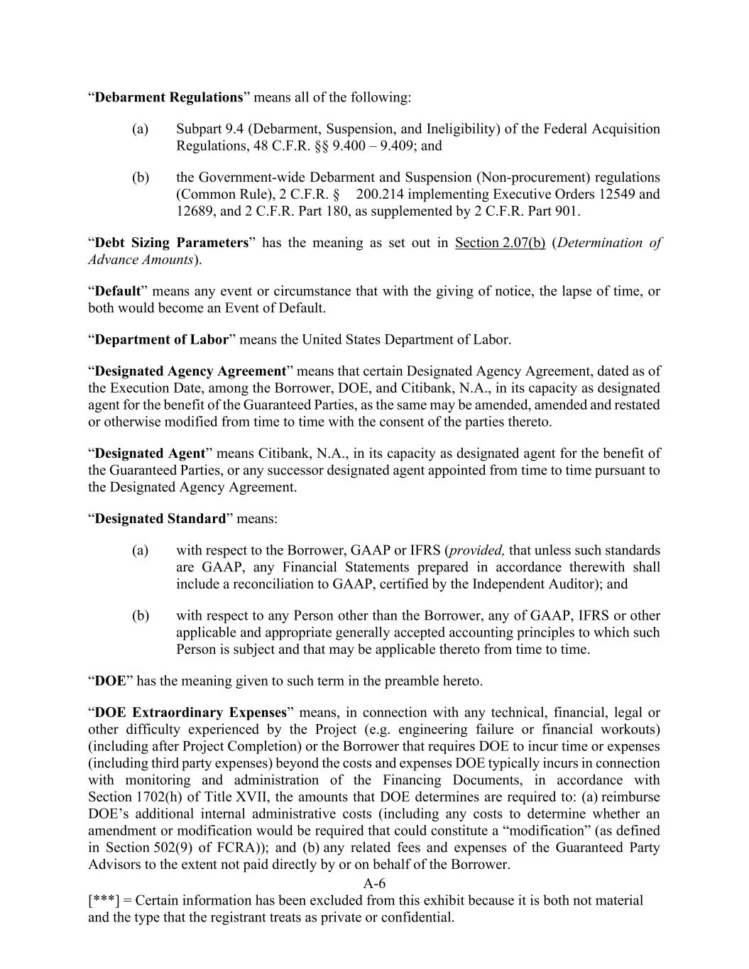 A-6 [***] = Certain information has been excluded from this exhibit because it is both not material and the type that the registrant treats as private or confidential. “Debarment Regulations” means all of the following: (a) Subpart 9.4 (Debarment, Suspension, and Ineligibility) of the Federal Acquisition Regulations, 48 C.F.R. §§ 9.400 – 9.409; and (b) the Government-wide Debarment and Suspension (Non-procurement) regulations (Common Rule), 2 C.F.R. § 200.214 implementing Executive Orders 12549 and 12689, and 2 C.F.R. Part 180, as supplemented by 2 C.F.R. Part 901. “Debt Sizing Parameters” has the meaning as set out in Section 2.07(b) (Determination of Advance Amounts). “Default” means any event or circumstance that with the giving of notice, the lapse of time, or both would become an Event of Default. “Department of Labor” means the United States Department of Labor. “Designated Agency Agreement” means that certain Designated Agency Agreement, dated as of the Execution Date, among the Borrower, DOE, and Citibank, N.A., in its capacity as designated agent for the benefit of the Guaranteed Parties, as the same may be amended, amended and restated or otherwise modified from time to time with the consent of the parties thereto. “Designated Agent” means Citibank, N.A., in its capacity as designated agent for the benefit of the Guaranteed Parties, or any successor designated agent appointed from time to time pursuant to the Designated Agency Agreement. “Designated Standard” means: (a) with respect to the Borrower, GAAP or IFRS (provided, that unless such standards are GAAP, any Financial Statements prepared in accordance therewith shall include a reconciliation to GAAP, certified by the Independent Auditor); and (b) with respect to any Person other than the Borrower, any of GAAP, IFRS or other applicable and appropriate generally accepted accounting principles to which such Person is subject and that may be applicable thereto from time to time. “DOE” has the meaning given to such term in the preamble hereto. “DOE Extraordinary Expenses” means, in connection with any technical, financial, legal or other difficulty experienced by the Project (e.g. engineering failure or financial workouts) (including after Project Completion) or the Borrower that requires DOE to incur time or expenses (including third party expenses) beyond the costs and expenses DOE typically incurs in connection with monitoring and administration of the Financing Documents, in accordance with Section 1702(h) of Title XVII, the amounts that DOE determines are required to: (a) reimburse DOE’s additional internal administrative costs (including any costs to determine whether an amendment or modification would be required that could constitute a “modification” (as defined in Section 502(9) of FCRA)); and (b) any related fees and expenses of the Guaranteed Party Advisors to the extent not paid directly by or on behalf of the Borrower.