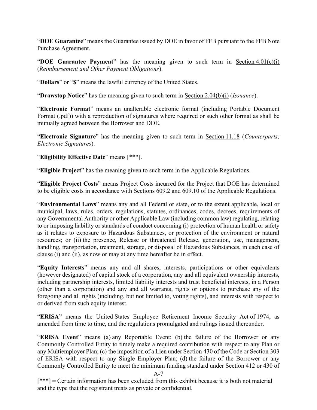 A-7 [***] = Certain information has been excluded from this exhibit because it is both not material and the type that the registrant treats as private or confidential. “DOE Guarantee” means the Guarantee issued by DOE in favor of FFB pursuant to the FFB Note Purchase Agreement. “DOE Guarantee Payment” has the meaning given to such term in Section 4.01(c)(i) (Reimbursement and Other Payment Obligations). “Dollars” or “$” means the lawful currency of the United States. “Drawstop Notice” has the meaning given to such term in Section 2.04(b)(i) (Issuance). “Electronic Format” means an unalterable electronic format (including Portable Document Format (.pdf)) with a reproduction of signatures where required or such other format as shall be mutually agreed between the Borrower and DOE. “Electronic Signature” has the meaning given to such term in Section 11.18 (Counterparts; Electronic Signatures). “Eligibility Effective Date” means [***]. “Eligible Project” has the meaning given to such term in the Applicable Regulations. “Eligible Project Costs” means Project Costs incurred for the Project that DOE has determined to be eligible costs in accordance with Sections 609.2 and 609.10 of the Applicable Regulations. “Environmental Laws” means any and all Federal or state, or to the extent applicable, local or municipal, laws, rules, orders, regulations, statutes, ordinances, codes, decrees, requirements of any Governmental Authority or other Applicable Law (including common law) regulating, relating to or imposing liability or standards of conduct concerning (i) protection of human health or safety as it relates to exposure to Hazardous Substances, or protection of the environment or natural resources; or (ii) the presence, Release or threatened Release, generation, use, management, handling, transportation, treatment, storage, or disposal of Hazardous Substances, in each case of clause (i) and (ii), as now or may at any time hereafter be in effect. “Equity Interests” means any and all shares, interests, participations or other equivalents (however designated) of capital stock of a corporation, any and all equivalent ownership interests, including partnership interests, limited liability interests and trust beneficial interests, in a Person (other than a corporation) and any and all warrants, rights or options to purchase any of the foregoing and all rights (including, but not limited to, voting rights), and interests with respect to or derived from such equity interest. “ERISA” means the United States Employee Retirement Income Security Act of 1974, as amended from time to time, and the regulations promulgated and rulings issued thereunder. “ERISA Event” means (a) any Reportable Event; (b) the failure of the Borrower or any Commonly Controlled Entity to timely make a required contribution with respect to any Plan or any Multiemployer Plan; (c) the imposition of a Lien under Section 430 of the Code or Section 303 of ERISA with respect to any Single Employer Plan; (d) the failure of the Borrower or any Commonly Controlled Entity to meet the minimum funding standard under Section 412 or 430 of