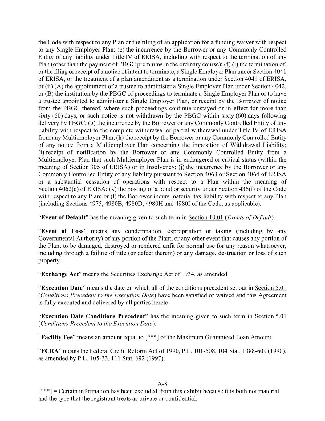 A-8 [***] = Certain information has been excluded from this exhibit because it is both not material and the type that the registrant treats as private or confidential. the Code with respect to any Plan or the filing of an application for a funding waiver with respect to any Single Employer Plan; (e) the incurrence by the Borrower or any Commonly Controlled Entity of any liability under Title IV of ERISA, including with respect to the termination of any Plan (other than the payment of PBGC premiums in the ordinary course); (f) (i) the termination of, or the filing or receipt of a notice of intent to terminate, a Single Employer Plan under Section 4041 of ERISA, or the treatment of a plan amendment as a termination under Section 4041 of ERISA, or (ii) (A) the appointment of a trustee to administer a Single Employer Plan under Section 4042, or (B) the institution by the PBGC of proceedings to terminate a Single Employer Plan or to have a trustee appointed to administer a Single Employer Plan, or receipt by the Borrower of notice from the PBGC thereof, where such proceedings continue unstayed or in effect for more than sixty (60) days, or such notice is not withdrawn by the PBGC within sixty (60) days following delivery by PBGC; (g) the incurrence by the Borrower or any Commonly Controlled Entity of any liability with respect to the complete withdrawal or partial withdrawal under Title IV of ERISA from any Multiemployer Plan; (h) the receipt by the Borrower or any Commonly Controlled Entity of any notice from a Multiemployer Plan concerning the imposition of Withdrawal Liability; (i) receipt of notification by the Borrower or any Commonly Controlled Entity from a Multiemployer Plan that such Multiemployer Plan is in endangered or critical status (within the meaning of Section 305 of ERISA) or in Insolvency; (j) the incurrence by the Borrower or any Commonly Controlled Entity of any liability pursuant to Section 4063 or Section 4064 of ERISA or a substantial cessation of operations with respect to a Plan within the meaning of Section 4062(e) of ERISA; (k) the posting of a bond or security under Section 436(f) of the Code with respect to any Plan; or (l) the Borrower incurs material tax liability with respect to any Plan (including Sections 4975, 4980B, 4980D, 4980H and 4980I of the Code, as applicable). “Event of Default” has the meaning given to such term in Section 10.01 (Events of Default). “Event of Loss” means any condemnation, expropriation or taking (including by any Governmental Authority) of any portion of the Plant, or any other event that causes any portion of the Plant to be damaged, destroyed or rendered unfit for normal use for any reason whatsoever, including through a failure of title (or defect therein) or any damage, destruction or loss of such property. “Exchange Act” means the Securities Exchange Act of 1934, as amended. “Execution Date” means the date on which all of the conditions precedent set out in Section 5.01 (Conditions Precedent to the Execution Date) have been satisfied or waived and this Agreement is fully executed and delivered by all parties hereto. “Execution Date Conditions Precedent” has the meaning given to such term in Section 5.01 (Conditions Precedent to the Execution Date). “Facility Fee” means an amount equal to [***] of the Maximum Guaranteed Loan Amount. “FCRA” means the Federal Credit Reform Act of 1990, P.L. 101-508, 104 Stat. 1388-609 (1990), as amended by P.L. 105-33, 111 Stat. 692 (1997).