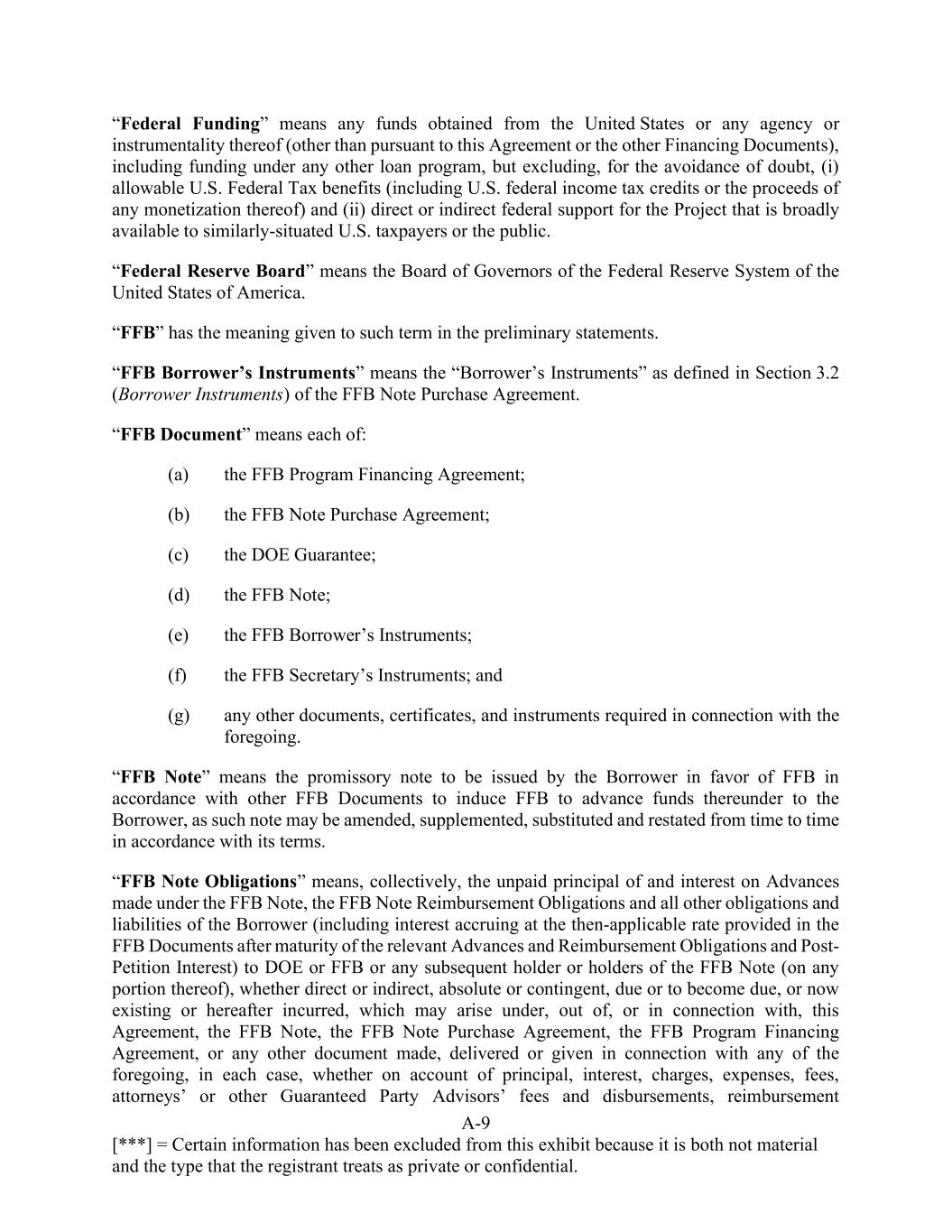 A-9 [***] = Certain information has been excluded from this exhibit because it is both not material and the type that the registrant treats as private or confidential. “Federal Funding” means any funds obtained from the United States or any agency or instrumentality thereof (other than pursuant to this Agreement or the other Financing Documents), including funding under any other loan program, but excluding, for the avoidance of doubt, (i) allowable U.S. Federal Tax benefits (including U.S. federal income tax credits or the proceeds of any monetization thereof) and (ii) direct or indirect federal support for the Project that is broadly available to similarly-situated U.S. taxpayers or the public. “Federal Reserve Board” means the Board of Governors of the Federal Reserve System of the United States of America. “FFB” has the meaning given to such term in the preliminary statements. “FFB Borrower’s Instruments” means the “Borrower’s Instruments” as defined in Section 3.2 (Borrower Instruments) of the FFB Note Purchase Agreement. “FFB Document” means each of: (a) the FFB Program Financing Agreement; (b) the FFB Note Purchase Agreement; (c) the DOE Guarantee; (d) the FFB Note; (e) the FFB Borrower’s Instruments; (f) the FFB Secretary’s Instruments; and (g) any other documents, certificates, and instruments required in connection with the foregoing. “FFB Note” means the promissory note to be issued by the Borrower in favor of FFB in accordance with other FFB Documents to induce FFB to advance funds thereunder to the Borrower, as such note may be amended, supplemented, substituted and restated from time to time in accordance with its terms. “FFB Note Obligations” means, collectively, the unpaid principal of and interest on Advances made under the FFB Note, the FFB Note Reimbursement Obligations and all other obligations and liabilities of the Borrower (including interest accruing at the then-applicable rate provided in the FFB Documents after maturity of the relevant Advances and Reimbursement Obligations and Post- Petition Interest) to DOE or FFB or any subsequent holder or holders of the FFB Note (on any portion thereof), whether direct or indirect, absolute or contingent, due or to become due, or now existing or hereafter incurred, which may arise under, out of, or in connection with, this Agreement, the FFB Note, the FFB Note Purchase Agreement, the FFB Program Financing Agreement, or any other document made, delivered or given in connection with any of the foregoing, in each case, whether on account of principal, interest, charges, expenses, fees, attorneys’ or other Guaranteed Party Advisors’ fees and disbursements, reimbursement