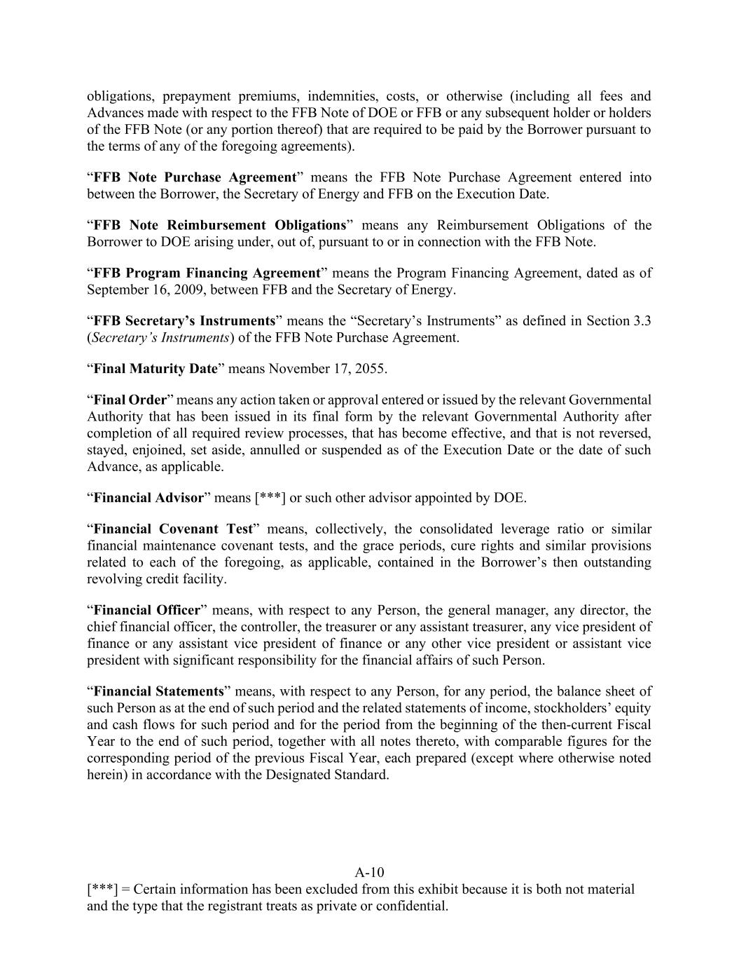 A-10 [***] = Certain information has been excluded from this exhibit because it is both not material and the type that the registrant treats as private or confidential. obligations, prepayment premiums, indemnities, costs, or otherwise (including all fees and Advances made with respect to the FFB Note of DOE or FFB or any subsequent holder or holders of the FFB Note (or any portion thereof) that are required to be paid by the Borrower pursuant to the terms of any of the foregoing agreements). “FFB Note Purchase Agreement” means the FFB Note Purchase Agreement entered into between the Borrower, the Secretary of Energy and FFB on the Execution Date. “FFB Note Reimbursement Obligations” means any Reimbursement Obligations of the Borrower to DOE arising under, out of, pursuant to or in connection with the FFB Note. “FFB Program Financing Agreement” means the Program Financing Agreement, dated as of September 16, 2009, between FFB and the Secretary of Energy. “FFB Secretary’s Instruments” means the “Secretary’s Instruments” as defined in Section 3.3 (Secretary’s Instruments) of the FFB Note Purchase Agreement. “Final Maturity Date” means November 17, 2055. “Final Order” means any action taken or approval entered or issued by the relevant Governmental Authority that has been issued in its final form by the relevant Governmental Authority after completion of all required review processes, that has become effective, and that is not reversed, stayed, enjoined, set aside, annulled or suspended as of the Execution Date or the date of such Advance, as applicable. “Financial Advisor” means [***] or such other advisor appointed by DOE. “Financial Covenant Test” means, collectively, the consolidated leverage ratio or similar financial maintenance covenant tests, and the grace periods, cure rights and similar provisions related to each of the foregoing, as applicable, contained in the Borrower’s then outstanding revolving credit facility. “Financial Officer” means, with respect to any Person, the general manager, any director, the chief financial officer, the controller, the treasurer or any assistant treasurer, any vice president of finance or any assistant vice president of finance or any other vice president or assistant vice president with significant responsibility for the financial affairs of such Person. “Financial Statements” means, with respect to any Person, for any period, the balance sheet of such Person as at the end of such period and the related statements of income, stockholders’ equity and cash flows for such period and for the period from the beginning of the then-current Fiscal Year to the end of such period, together with all notes thereto, with comparable figures for the corresponding period of the previous Fiscal Year, each prepared (except where otherwise noted herein) in accordance with the Designated Standard.