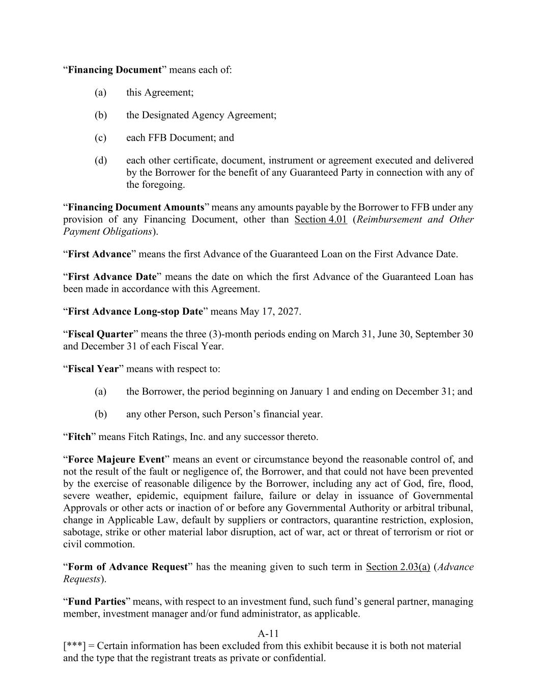 A-11 [***] = Certain information has been excluded from this exhibit because it is both not material and the type that the registrant treats as private or confidential. “Financing Document” means each of: (a) this Agreement; (b) the Designated Agency Agreement; (c) each FFB Document; and (d) each other certificate, document, instrument or agreement executed and delivered by the Borrower for the benefit of any Guaranteed Party in connection with any of the foregoing. “Financing Document Amounts” means any amounts payable by the Borrower to FFB under any provision of any Financing Document, other than Section 4.01 (Reimbursement and Other Payment Obligations). “First Advance” means the first Advance of the Guaranteed Loan on the First Advance Date. “First Advance Date” means the date on which the first Advance of the Guaranteed Loan has been made in accordance with this Agreement. “First Advance Long-stop Date” means May 17, 2027. “Fiscal Quarter” means the three (3)-month periods ending on March 31, June 30, September 30 and December 31 of each Fiscal Year. “Fiscal Year” means with respect to: (a) the Borrower, the period beginning on January 1 and ending on December 31; and (b) any other Person, such Person’s financial year. “Fitch” means Fitch Ratings, Inc. and any successor thereto. “Force Majeure Event” means an event or circumstance beyond the reasonable control of, and not the result of the fault or negligence of, the Borrower, and that could not have been prevented by the exercise of reasonable diligence by the Borrower, including any act of God, fire, flood, severe weather, epidemic, equipment failure, failure or delay in issuance of Governmental Approvals or other acts or inaction of or before any Governmental Authority or arbitral tribunal, change in Applicable Law, default by suppliers or contractors, quarantine restriction, explosion, sabotage, strike or other material labor disruption, act of war, act or threat of terrorism or riot or civil commotion. “Form of Advance Request” has the meaning given to such term in Section 2.03(a) (Advance Requests). “Fund Parties” means, with respect to an investment fund, such fund’s general partner, managing member, investment manager and/or fund administrator, as applicable.