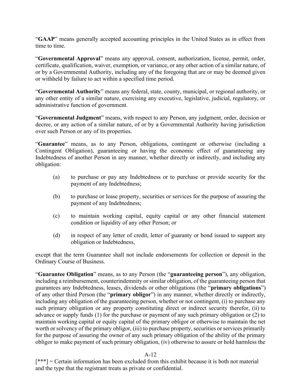 A-12 [***] = Certain information has been excluded from this exhibit because it is both not material and the type that the registrant treats as private or confidential. “GAAP” means generally accepted accounting principles in the United States as in effect from time to time. “Governmental Approval” means any approval, consent, authorization, license, permit, order, certificate, qualification, waiver, exemption, or variance, or any other action of a similar nature, of or by a Governmental Authority, including any of the foregoing that are or may be deemed given or withheld by failure to act within a specified time period. “Governmental Authority” means any federal, state, county, municipal, or regional authority, or any other entity of a similar nature, exercising any executive, legislative, judicial, regulatory, or administrative function of government. “Governmental Judgment” means, with respect to any Person, any judgment, order, decision or decree, or any action of a similar nature, of or by a Governmental Authority having jurisdiction over such Person or any of its properties. “Guarantee” means, as to any Person, obligations, contingent or otherwise (including a Contingent Obligation), guaranteeing or having the economic effect of guaranteeing any Indebtedness of another Person in any manner, whether directly or indirectly, and including any obligation: (a) to purchase or pay any Indebtedness or to purchase or provide security for the payment of any Indebtedness; (b) to purchase or lease property, securities or services for the purpose of assuring the payment of any Indebtedness; (c) to maintain working capital, equity capital or any other financial statement condition or liquidity of any other Person; or (d) in respect of any letter of credit, letter of guaranty or bond issued to support any obligation or Indebtedness, except that the term Guarantee shall not include endorsements for collection or deposit in the Ordinary Course of Business. “Guarantee Obligation” means, as to any Person (the “guaranteeing person”), any obligation, including a reimbursement, counterindemnity or similar obligation, of the guaranteeing person that guarantees any Indebtedness, leases, dividends or other obligations (the “primary obligations”) of any other third Person (the “primary obligor”) in any manner, whether directly or indirectly, including any obligation of the guaranteeing person, whether or not contingent, (i) to purchase any such primary obligation or any property constituting direct or indirect security therefor, (ii) to advance or supply funds (1) for the purchase or payment of any such primary obligation or (2) to maintain working capital or equity capital of the primary obligor or otherwise to maintain the net worth or solvency of the primary obligor, (iii) to purchase property, securities or services primarily for the purpose of assuring the owner of any such primary obligation of the ability of the primary obligor to make payment of such primary obligation, (iv) otherwise to assure or hold harmless the