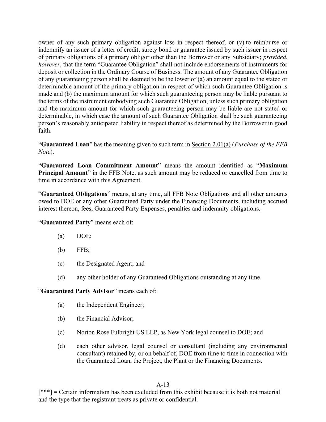 A-13 [***] = Certain information has been excluded from this exhibit because it is both not material and the type that the registrant treats as private or confidential. owner of any such primary obligation against loss in respect thereof, or (v) to reimburse or indemnify an issuer of a letter of credit, surety bond or guarantee issued by such issuer in respect of primary obligations of a primary obligor other than the Borrower or any Subsidiary; provided, however, that the term “Guarantee Obligation” shall not include endorsements of instruments for deposit or collection in the Ordinary Course of Business. The amount of any Guarantee Obligation of any guaranteeing person shall be deemed to be the lower of (a) an amount equal to the stated or determinable amount of the primary obligation in respect of which such Guarantee Obligation is made and (b) the maximum amount for which such guaranteeing person may be liable pursuant to the terms of the instrument embodying such Guarantee Obligation, unless such primary obligation and the maximum amount for which such guaranteeing person may be liable are not stated or determinable, in which case the amount of such Guarantee Obligation shall be such guaranteeing person’s reasonably anticipated liability in respect thereof as determined by the Borrower in good faith. “Guaranteed Loan” has the meaning given to such term in Section 2.01(a) (Purchase of the FFB Note). “Guaranteed Loan Commitment Amount” means the amount identified as “Maximum Principal Amount” in the FFB Note, as such amount may be reduced or cancelled from time to time in accordance with this Agreement. “Guaranteed Obligations” means, at any time, all FFB Note Obligations and all other amounts owed to DOE or any other Guaranteed Party under the Financing Documents, including accrued interest thereon, fees, Guaranteed Party Expenses, penalties and indemnity obligations. “Guaranteed Party” means each of: (a) DOE; (b) FFB; (c) the Designated Agent; and (d) any other holder of any Guaranteed Obligations outstanding at any time. “Guaranteed Party Advisor” means each of: (a) the Independent Engineer; (b) the Financial Advisor; (c) Norton Rose Fulbright US LLP, as New York legal counsel to DOE; and (d) each other advisor, legal counsel or consultant (including any environmental consultant) retained by, or on behalf of, DOE from time to time in connection with the Guaranteed Loan, the Project, the Plant or the Financing Documents.