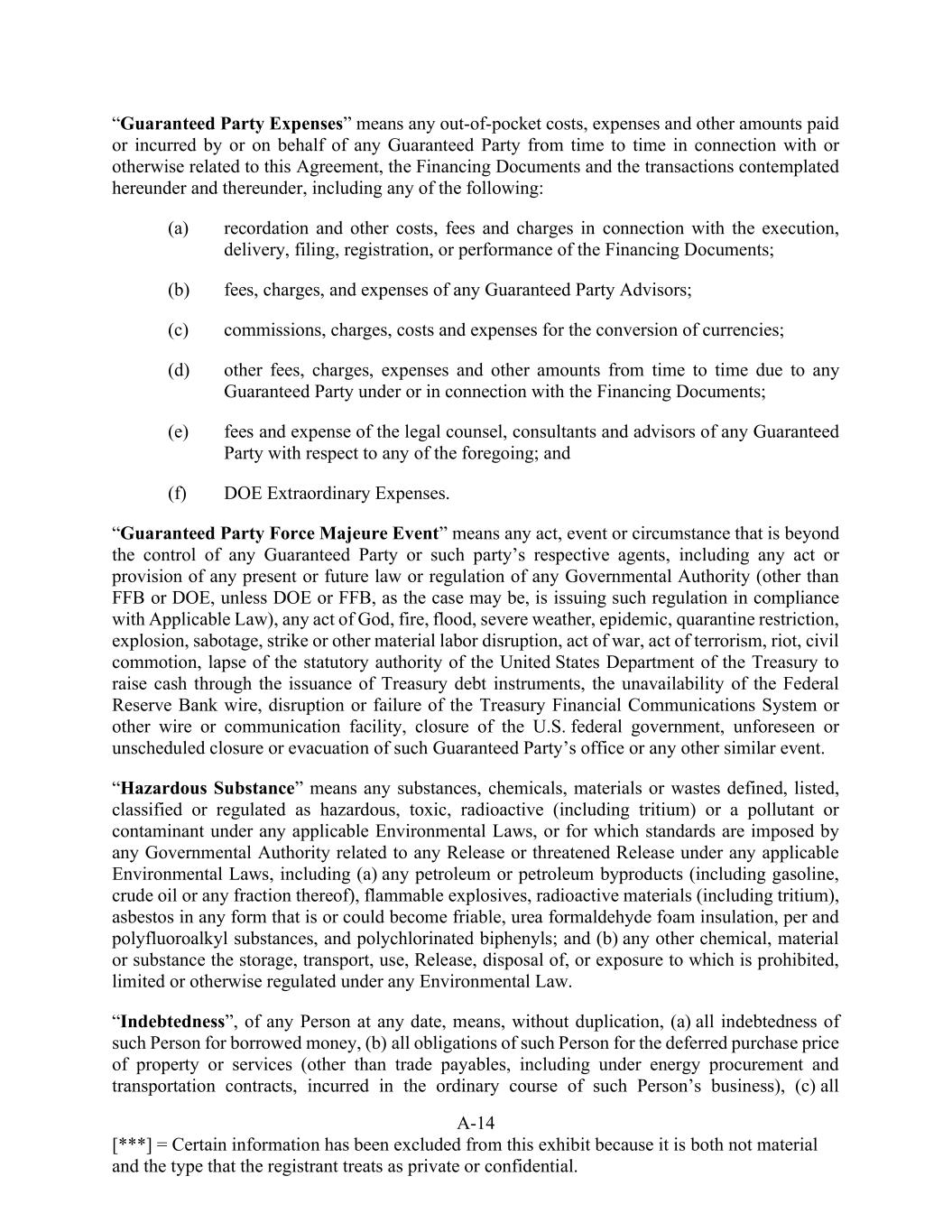 A-14 [***] = Certain information has been excluded from this exhibit because it is both not material and the type that the registrant treats as private or confidential. “Guaranteed Party Expenses” means any out-of-pocket costs, expenses and other amounts paid or incurred by or on behalf of any Guaranteed Party from time to time in connection with or otherwise related to this Agreement, the Financing Documents and the transactions contemplated hereunder and thereunder, including any of the following: (a) recordation and other costs, fees and charges in connection with the execution, delivery, filing, registration, or performance of the Financing Documents; (b) fees, charges, and expenses of any Guaranteed Party Advisors; (c) commissions, charges, costs and expenses for the conversion of currencies; (d) other fees, charges, expenses and other amounts from time to time due to any Guaranteed Party under or in connection with the Financing Documents; (e) fees and expense of the legal counsel, consultants and advisors of any Guaranteed Party with respect to any of the foregoing; and (f) DOE Extraordinary Expenses. “Guaranteed Party Force Majeure Event” means any act, event or circumstance that is beyond the control of any Guaranteed Party or such party’s respective agents, including any act or provision of any present or future law or regulation of any Governmental Authority (other than FFB or DOE, unless DOE or FFB, as the case may be, is issuing such regulation in compliance with Applicable Law), any act of God, fire, flood, severe weather, epidemic, quarantine restriction, explosion, sabotage, strike or other material labor disruption, act of war, act of terrorism, riot, civil commotion, lapse of the statutory authority of the United States Department of the Treasury to raise cash through the issuance of Treasury debt instruments, the unavailability of the Federal Reserve Bank wire, disruption or failure of the Treasury Financial Communications System or other wire or communication facility, closure of the U.S. federal government, unforeseen or unscheduled closure or evacuation of such Guaranteed Party’s office or any other similar event. “Hazardous Substance” means any substances, chemicals, materials or wastes defined, listed, classified or regulated as hazardous, toxic, radioactive (including tritium) or a pollutant or contaminant under any applicable Environmental Laws, or for which standards are imposed by any Governmental Authority related to any Release or threatened Release under any applicable Environmental Laws, including (a) any petroleum or petroleum byproducts (including gasoline, crude oil or any fraction thereof), flammable explosives, radioactive materials (including tritium), asbestos in any form that is or could become friable, urea formaldehyde foam insulation, per and polyfluoroalkyl substances, and polychlorinated biphenyls; and (b) any other chemical, material or substance the storage, transport, use, Release, disposal of, or exposure to which is prohibited, limited or otherwise regulated under any Environmental Law. “Indebtedness”, of any Person at any date, means, without duplication, (a) all indebtedness of such Person for borrowed money, (b) all obligations of such Person for the deferred purchase price of property or services (other than trade payables, including under energy procurement and transportation contracts, incurred in the ordinary course of such Person’s business), (c) all