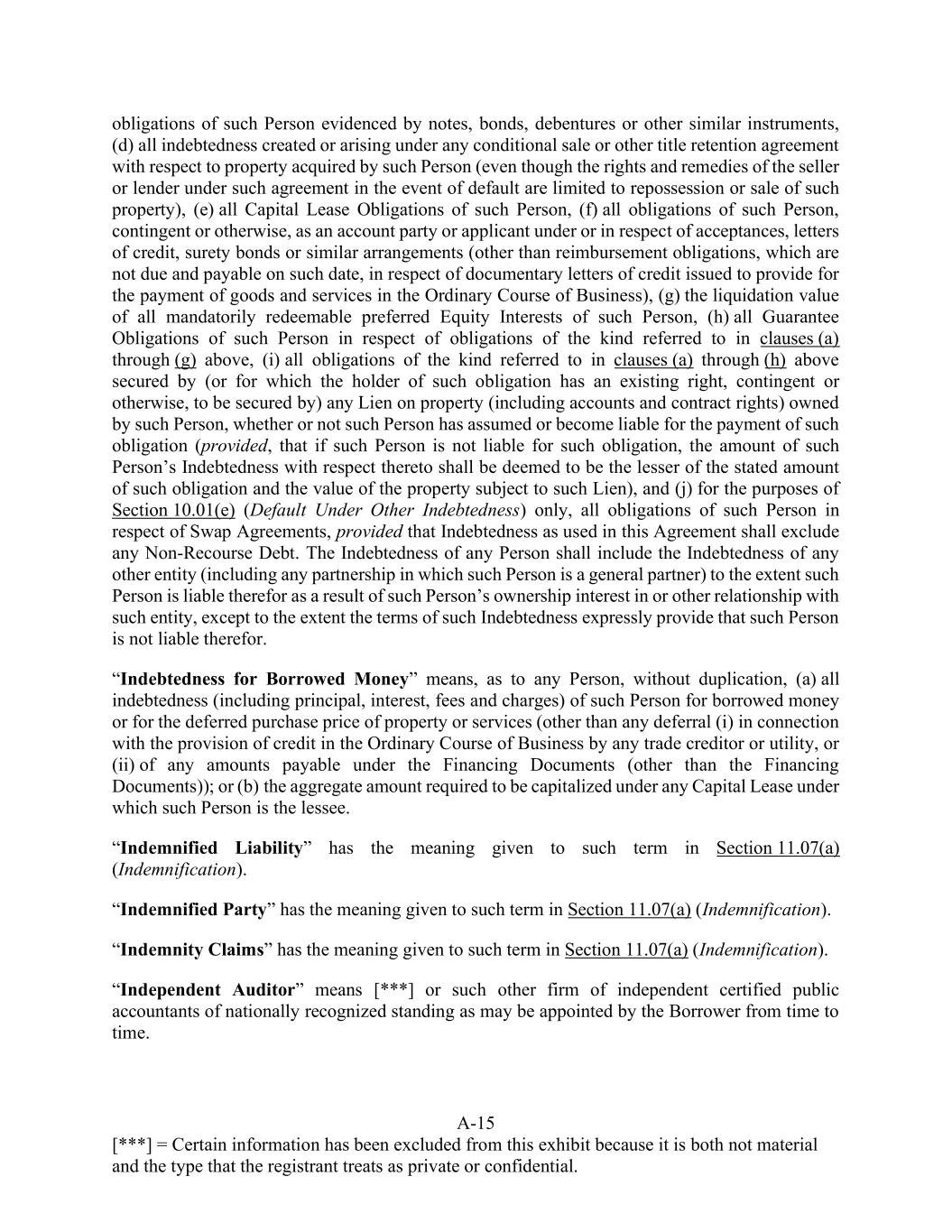 A-15 [***] = Certain information has been excluded from this exhibit because it is both not material and the type that the registrant treats as private or confidential. obligations of such Person evidenced by notes, bonds, debentures or other similar instruments, (d) all indebtedness created or arising under any conditional sale or other title retention agreement with respect to property acquired by such Person (even though the rights and remedies of the seller or lender under such agreement in the event of default are limited to repossession or sale of such property), (e) all Capital Lease Obligations of such Person, (f) all obligations of such Person, contingent or otherwise, as an account party or applicant under or in respect of acceptances, letters of credit, surety bonds or similar arrangements (other than reimbursement obligations, which are not due and payable on such date, in respect of documentary letters of credit issued to provide for the payment of goods and services in the Ordinary Course of Business), (g) the liquidation value of all mandatorily redeemable preferred Equity Interests of such Person, (h) all Guarantee Obligations of such Person in respect of obligations of the kind referred to in clauses (a) through (g) above, (i) all obligations of the kind referred to in clauses (a) through (h) above secured by (or for which the holder of such obligation has an existing right, contingent or otherwise, to be secured by) any Lien on property (including accounts and contract rights) owned by such Person, whether or not such Person has assumed or become liable for the payment of such obligation (provided, that if such Person is not liable for such obligation, the amount of such Person’s Indebtedness with respect thereto shall be deemed to be the lesser of the stated amount of such obligation and the value of the property subject to such Lien), and (j) for the purposes of Section 10.01(e) (Default Under Other Indebtedness) only, all obligations of such Person in respect of Swap Agreements, provided that Indebtedness as used in this Agreement shall exclude any Non-Recourse Debt. The Indebtedness of any Person shall include the Indebtedness of any other entity (including any partnership in which such Person is a general partner) to the extent such Person is liable therefor as a result of such Person’s ownership interest in or other relationship with such entity, except to the extent the terms of such Indebtedness expressly provide that such Person is not liable therefor. “Indebtedness for Borrowed Money” means, as to any Person, without duplication, (a) all indebtedness (including principal, interest, fees and charges) of such Person for borrowed money or for the deferred purchase price of property or services (other than any deferral (i) in connection with the provision of credit in the Ordinary Course of Business by any trade creditor or utility, or (ii) of any amounts payable under the Financing Documents (other than the Financing Documents)); or (b) the aggregate amount required to be capitalized under any Capital Lease under which such Person is the lessee. “Indemnified Liability” has the meaning given to such term in Section 11.07(a) (Indemnification). “Indemnified Party” has the meaning given to such term in Section 11.07(a) (Indemnification). “Indemnity Claims” has the meaning given to such term in Section 11.07(a) (Indemnification). “Independent Auditor” means [***] or such other firm of independent certified public accountants of nationally recognized standing as may be appointed by the Borrower from time to time.